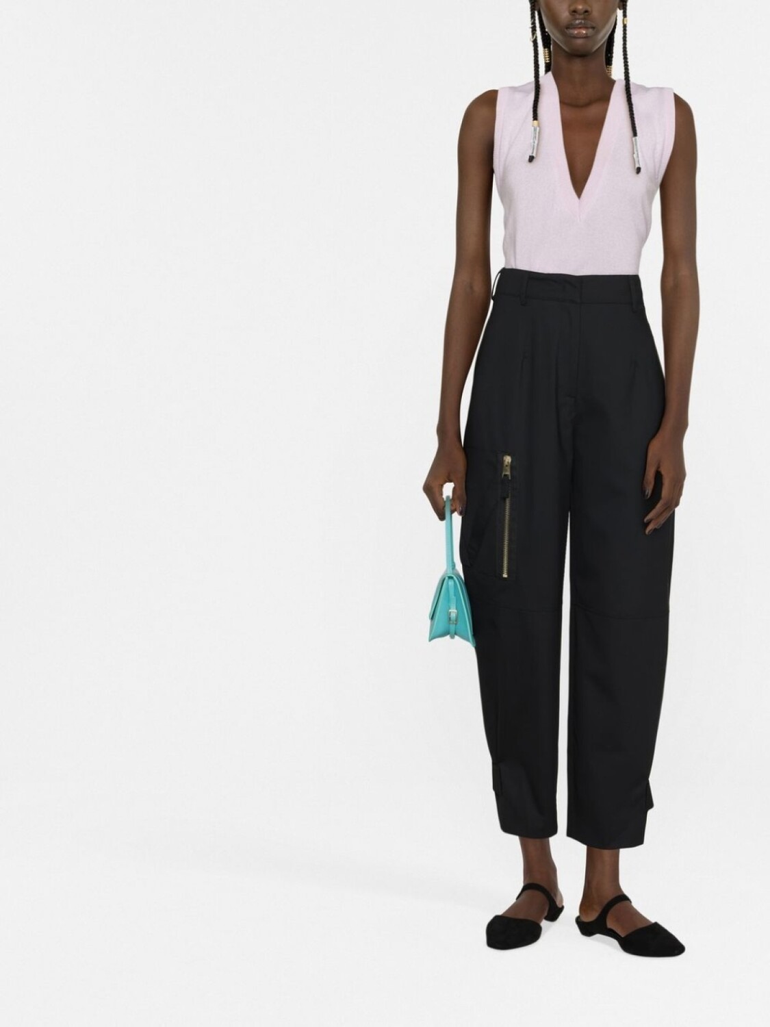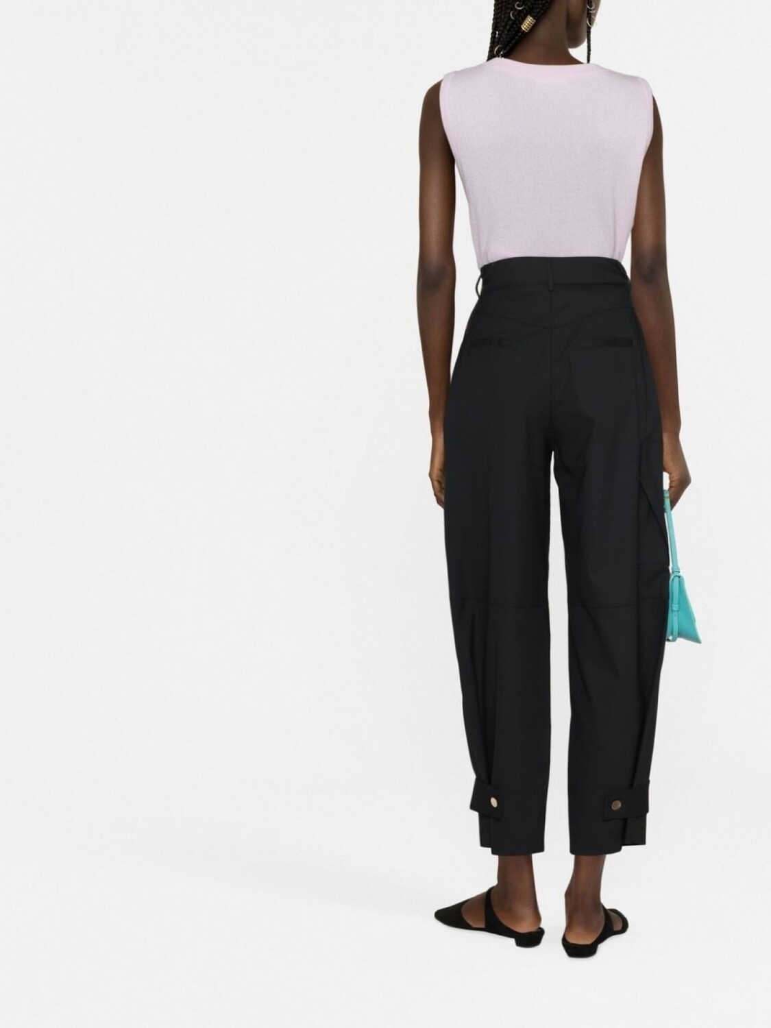 Черный, эластичная шерсть, накладной карман сбоку, завышенная талия, строчка в тон, потайная застежка спереди, прорезные карманы по бокам, два кармана с листочкой сзади, манжеты на пуговицах, зауженный крой и укороченная длина.