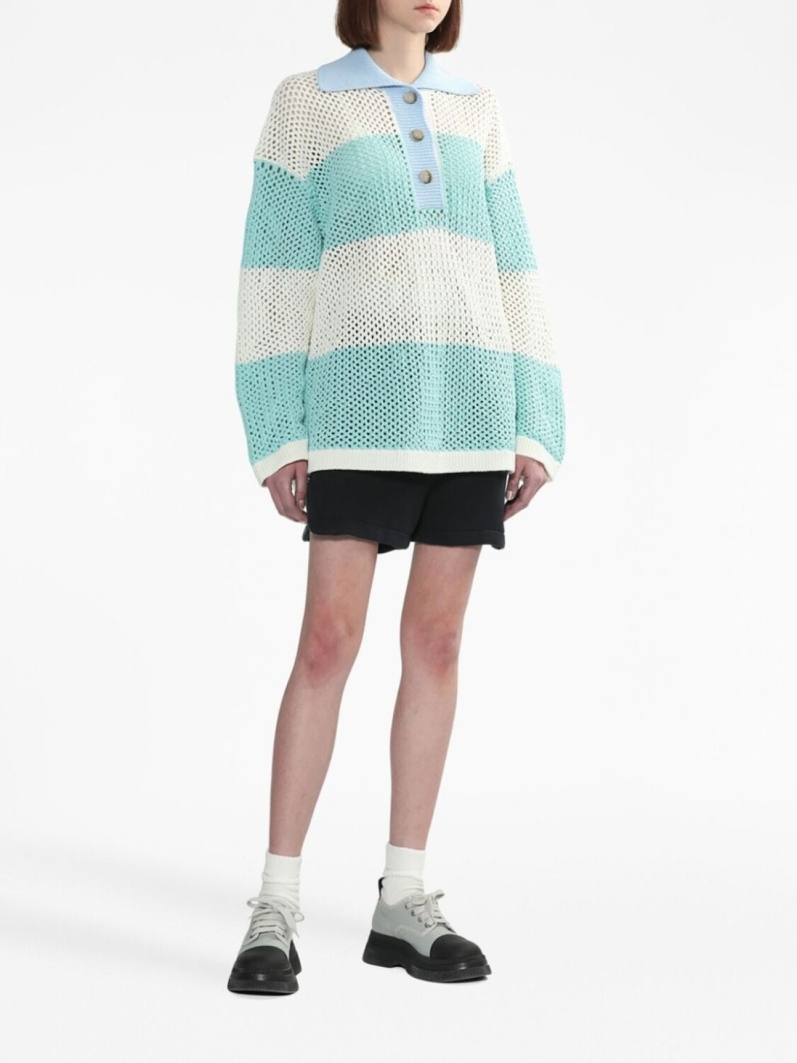 Разноцветный, хлопок, узор в горизонтальную полоску, воротник поло, короткая застежка на пуговицах спереди, манжеты в рубчик и прямой подол.