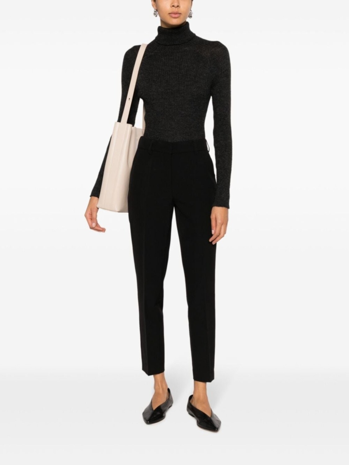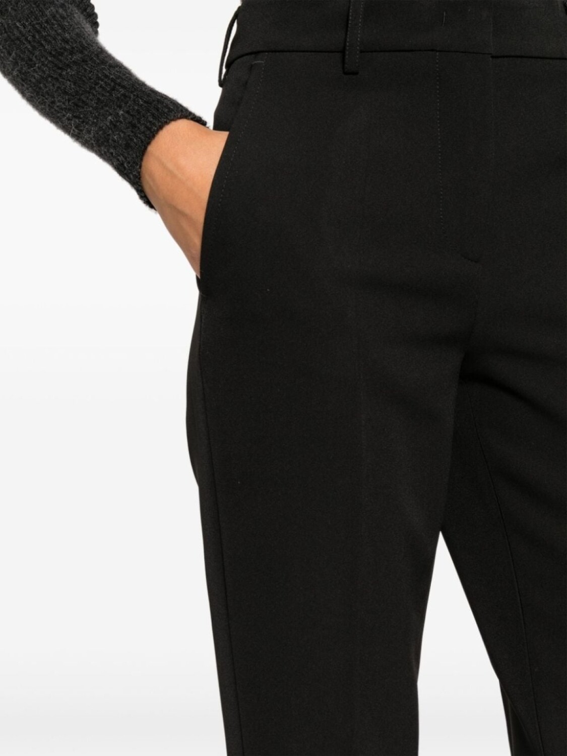 Черный, эластичный материал, петли для ремня, потайная застежка спереди, средняя посадка, зауженный крой, укороченная длина, два вшитых кармана по бокам и два кармана с листочкой сзади.