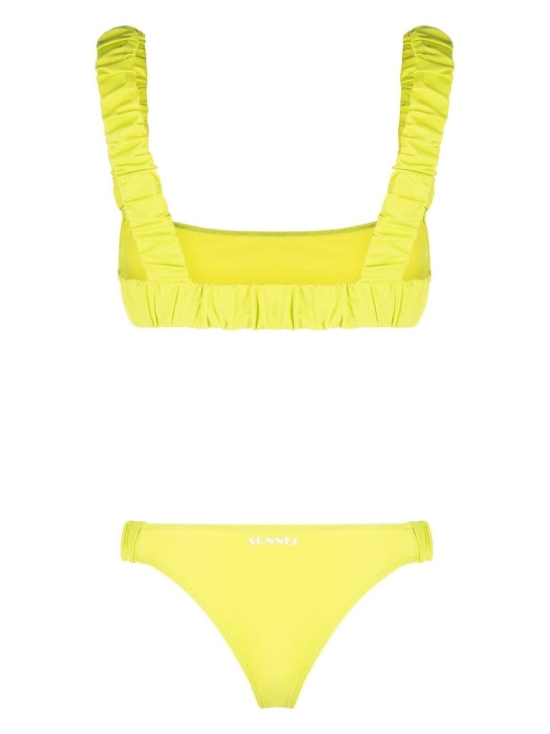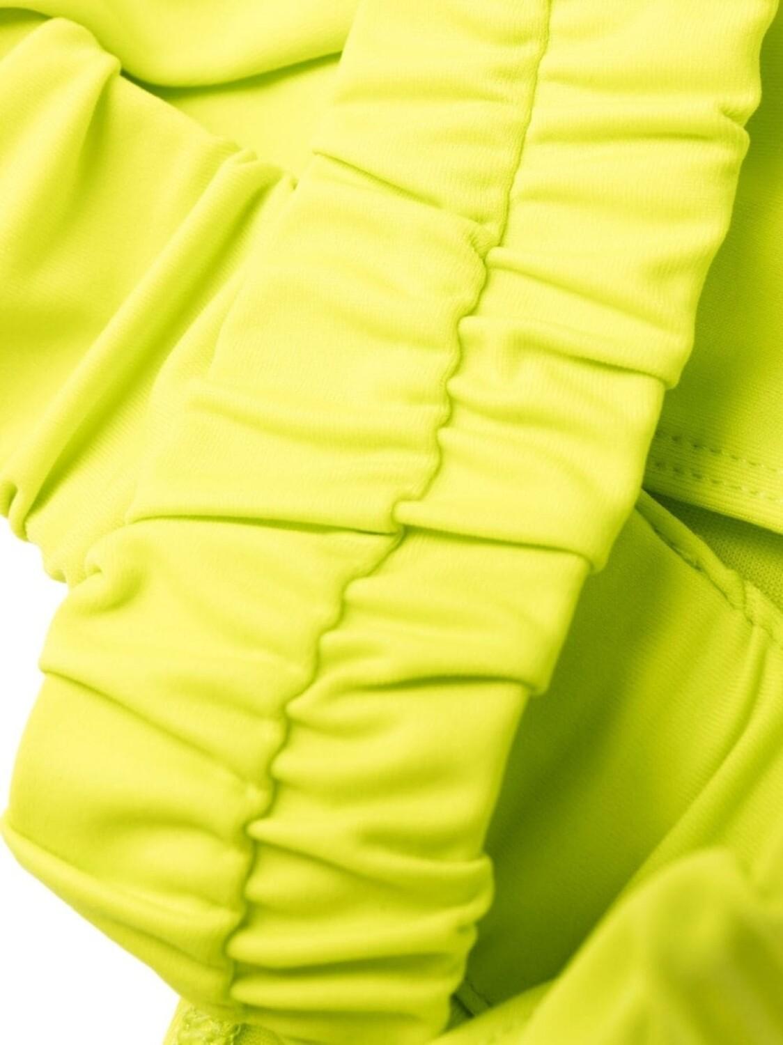Шартрез, эластичный материал, принт с логотипом сзади, детали с оборками, широкие бретели и классические плавки бикини. Пожалуйста, примеряйте купальники и пляжные шорты только поверх собственного белья.