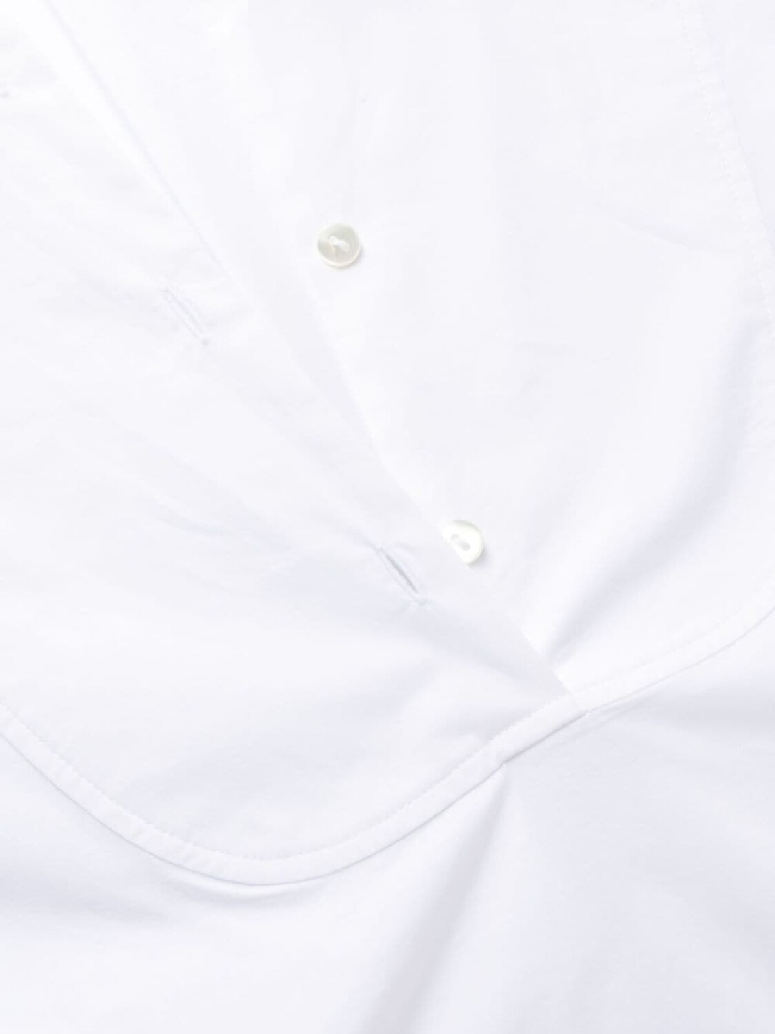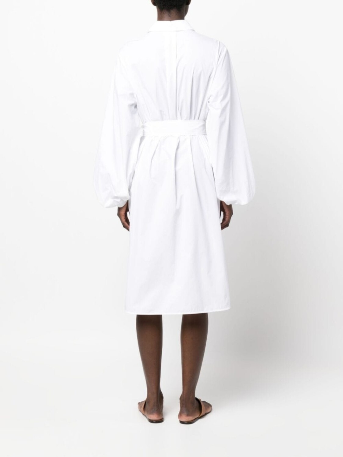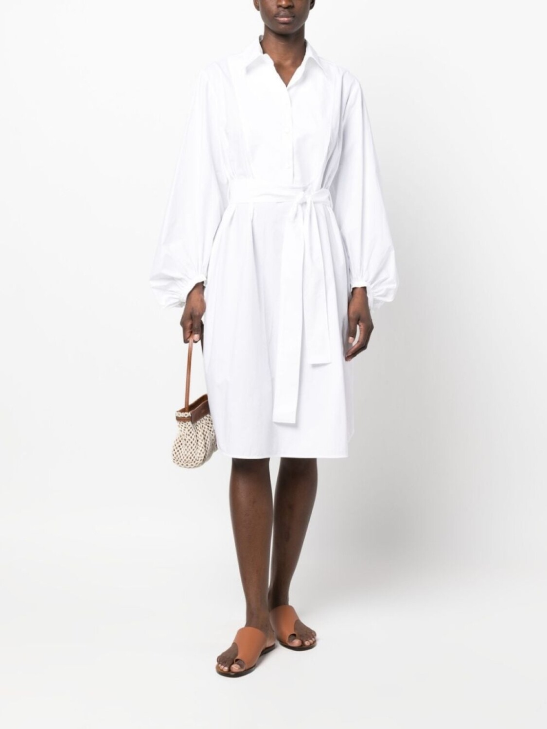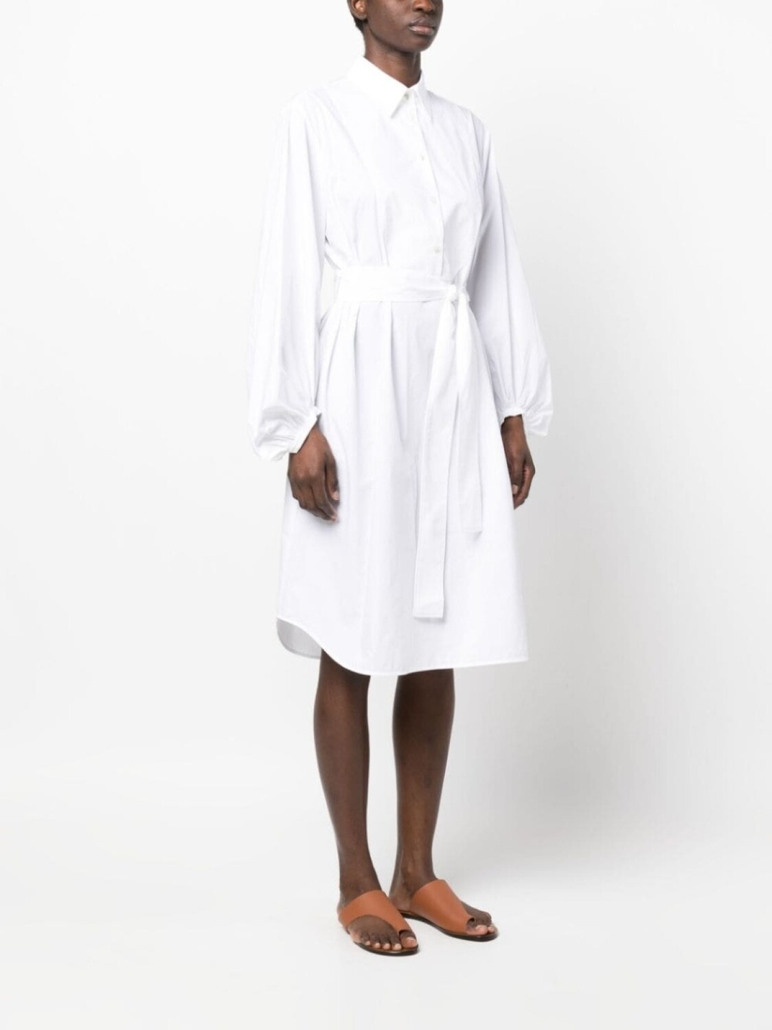Белый, хлопок, съемный пояс, классический воротник, застежка на пуговицах спереди, длинные рукава, кулиска на талии, петли для ремня, прямой подол и длина по колено.