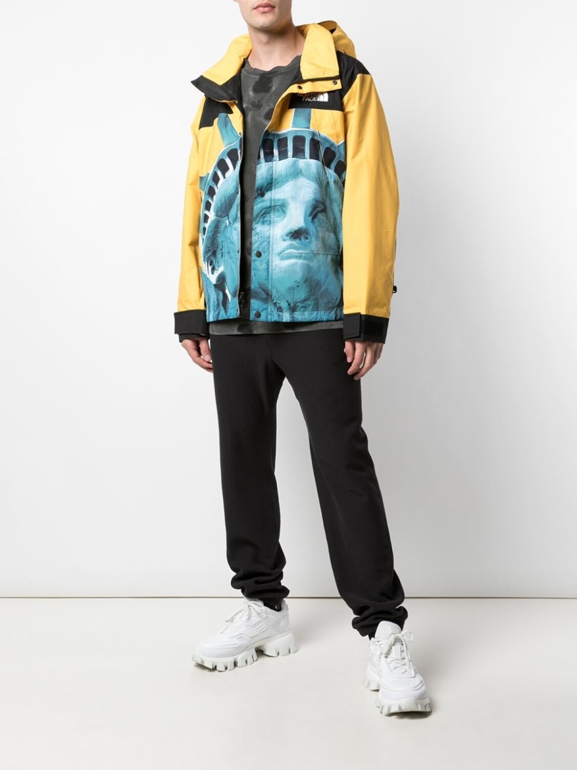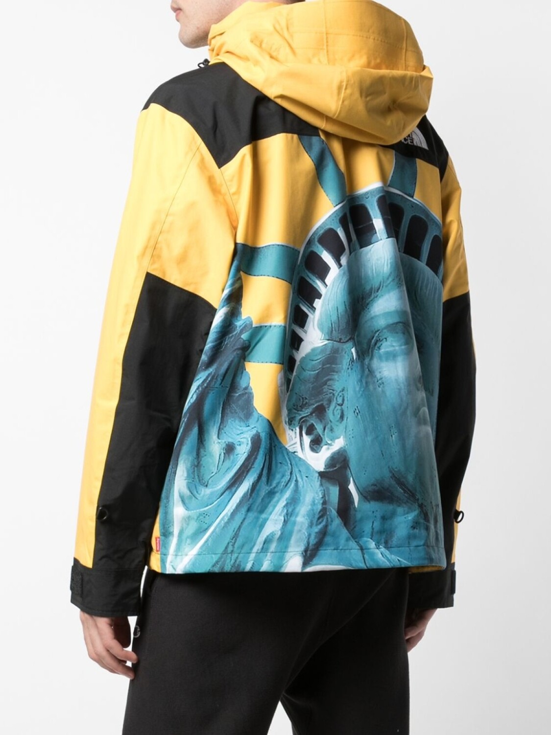 Куртка из коллаборации с The North Face от Supreme. Фотографический принт, капюшон на шнурке, воротник с высокой стойкой, застежка на пуговицах спереди и длинные рукава. Цвет: желтый.