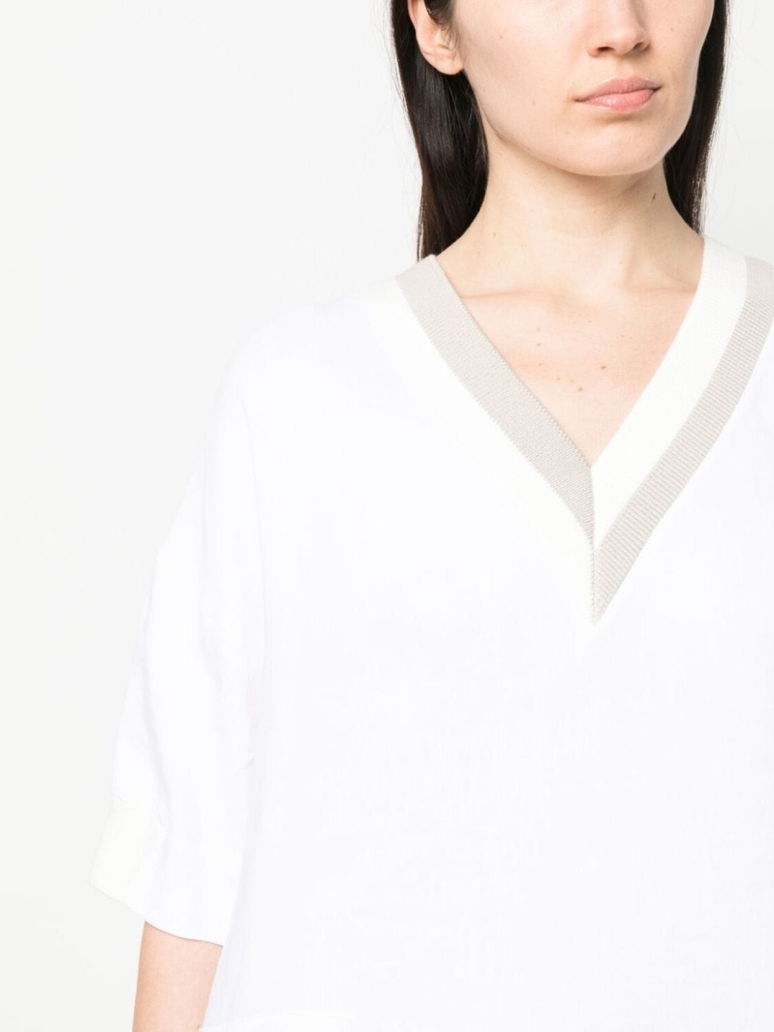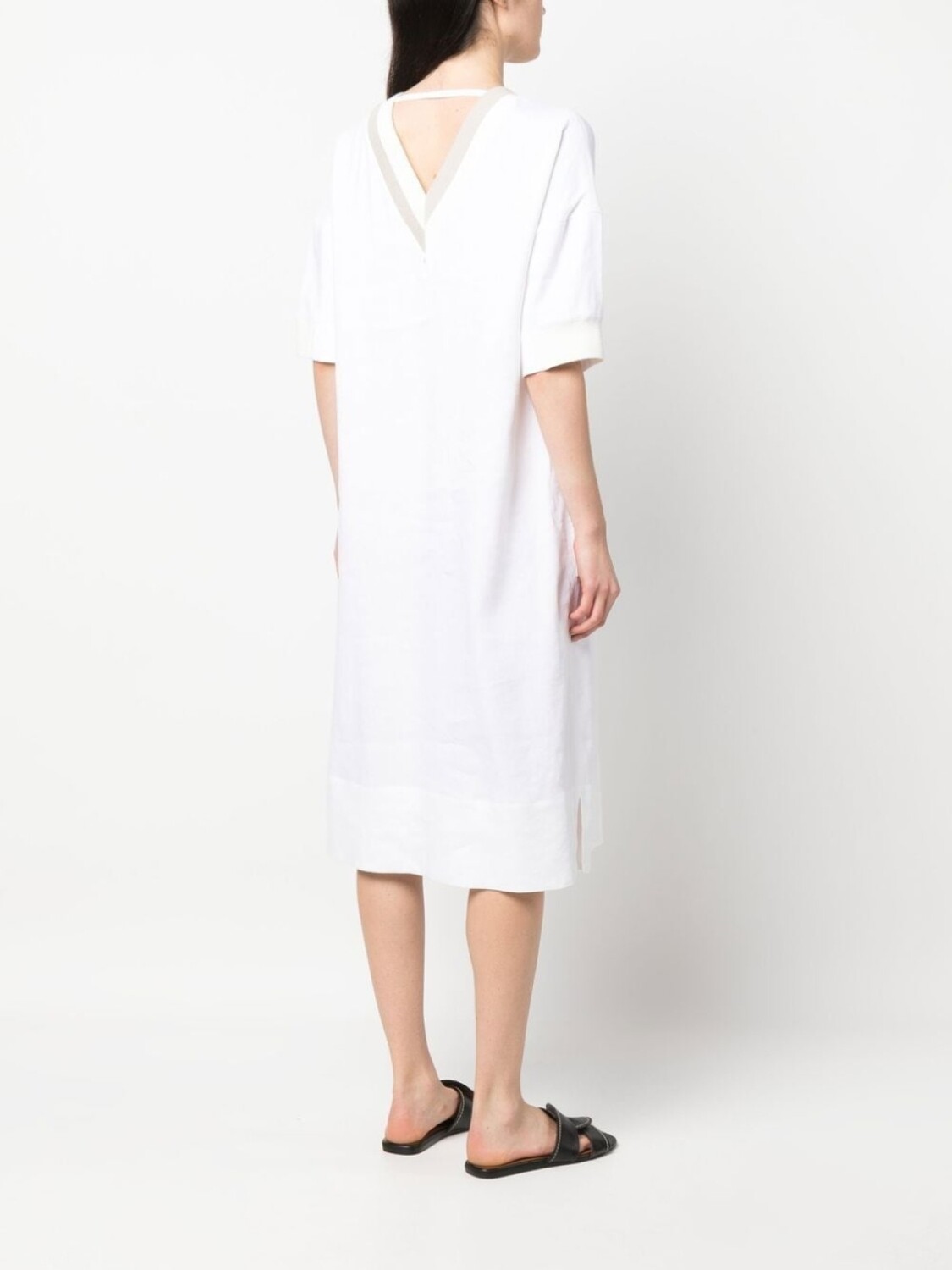 Белый, смесовый лен, V-образный вырез, V-образный вырез сзади, полосатые края, рукава по локоть и длина миди. Ответственный выбор: Этот товар как минимум на 50% состоит из материалов, которые признаны более безопасными для окружающей среды или сертифицированы независимыми организациями.