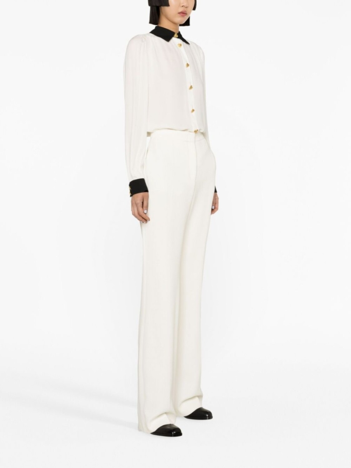 Кремово-белый, потайная застежка на молнии и пуговицах, два вшитых кармана по бокам, прямой крой и прямой подол.