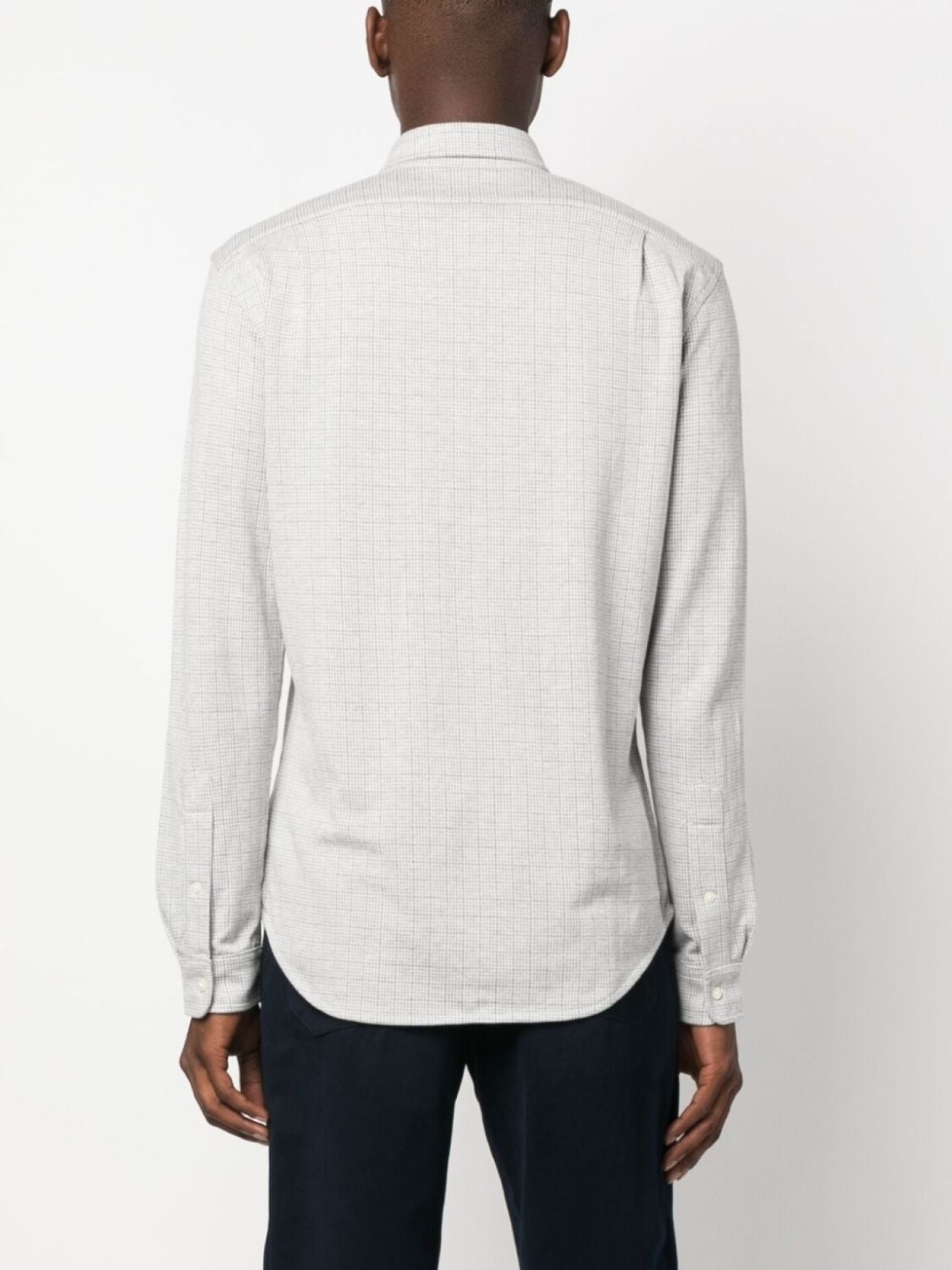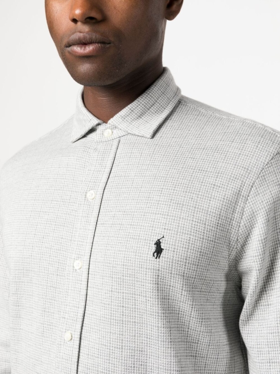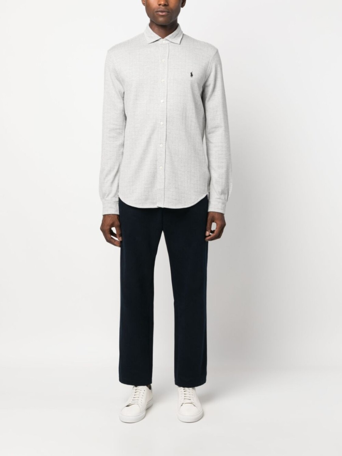 Светло-серый, хлопок, клетчатый узор, вышитый логотип на груди, отложной воротник, застежка на пуговицах спереди, длинные рукава, рукава с манжетами на пуговицах и закругленный подол.