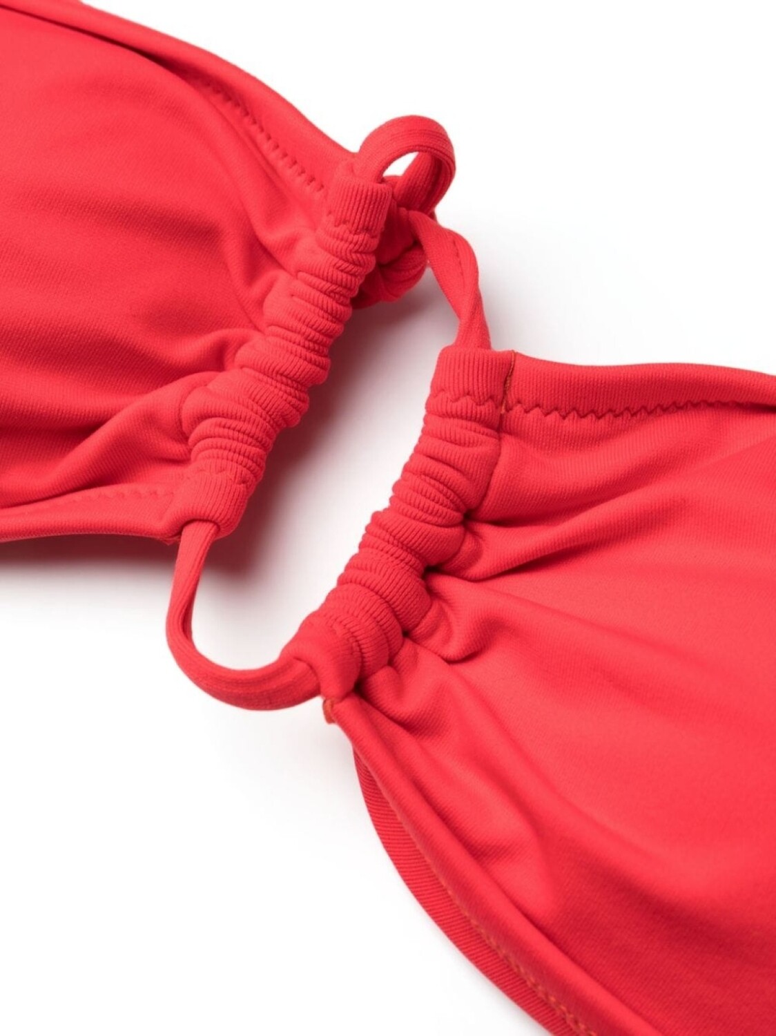 Красный, эластичный материал, дизайн со сборками, модель без косточек, завязки вокруг шеи и застежка на зажиме сзади. Пожалуйста, примеряйте купальники и пляжные шорты только поверх собственного белья.