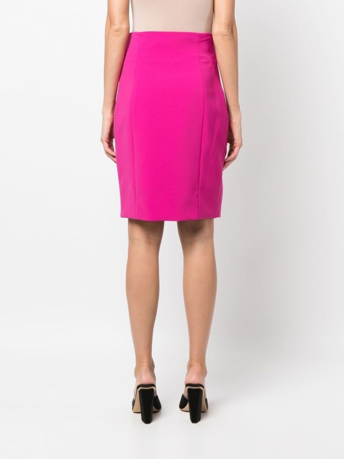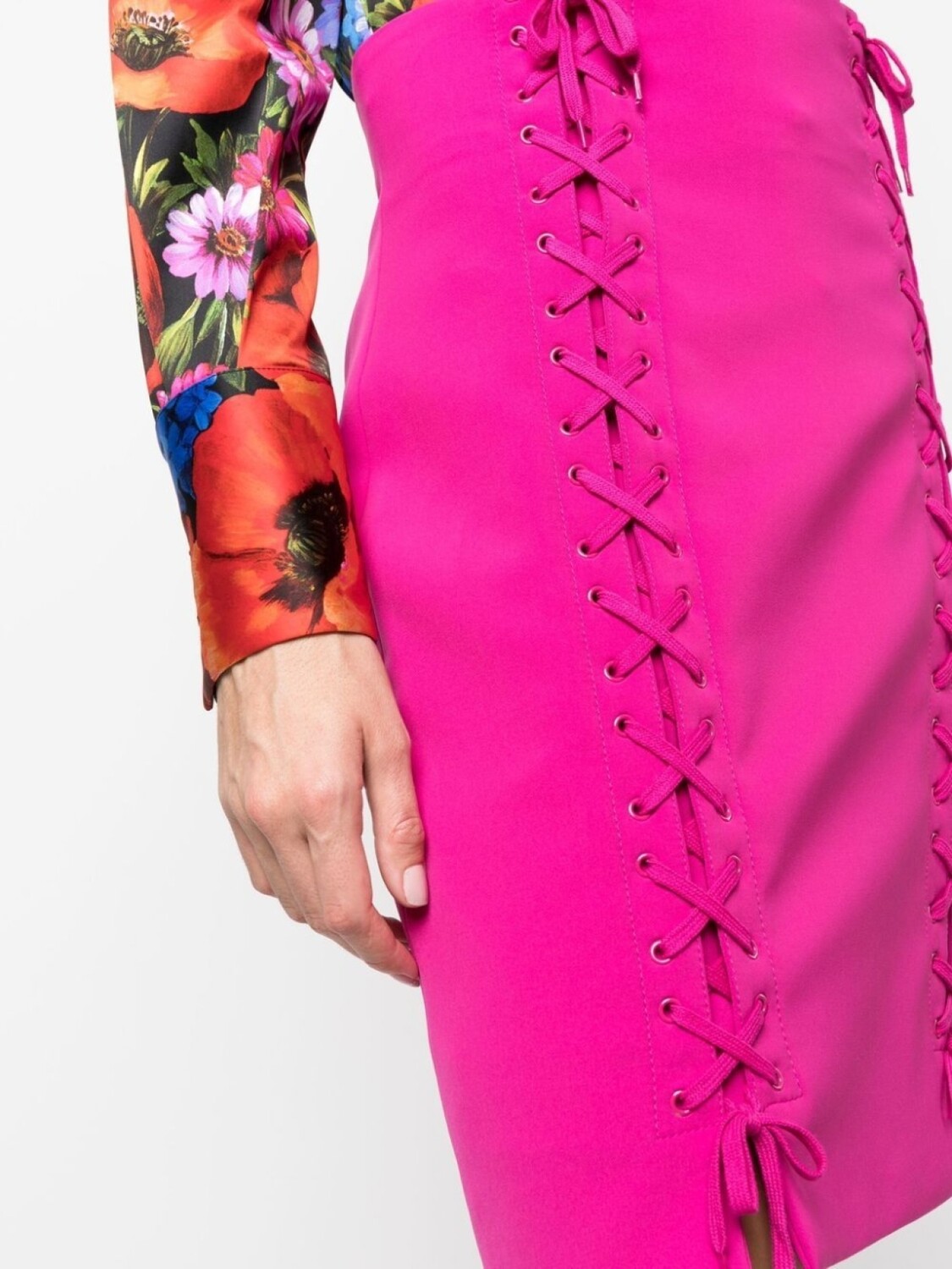 Ярко-розовый, шнуровка, завышенная талия, потайная застежка на молнии сбоку, длина до бедер и прямой подол.