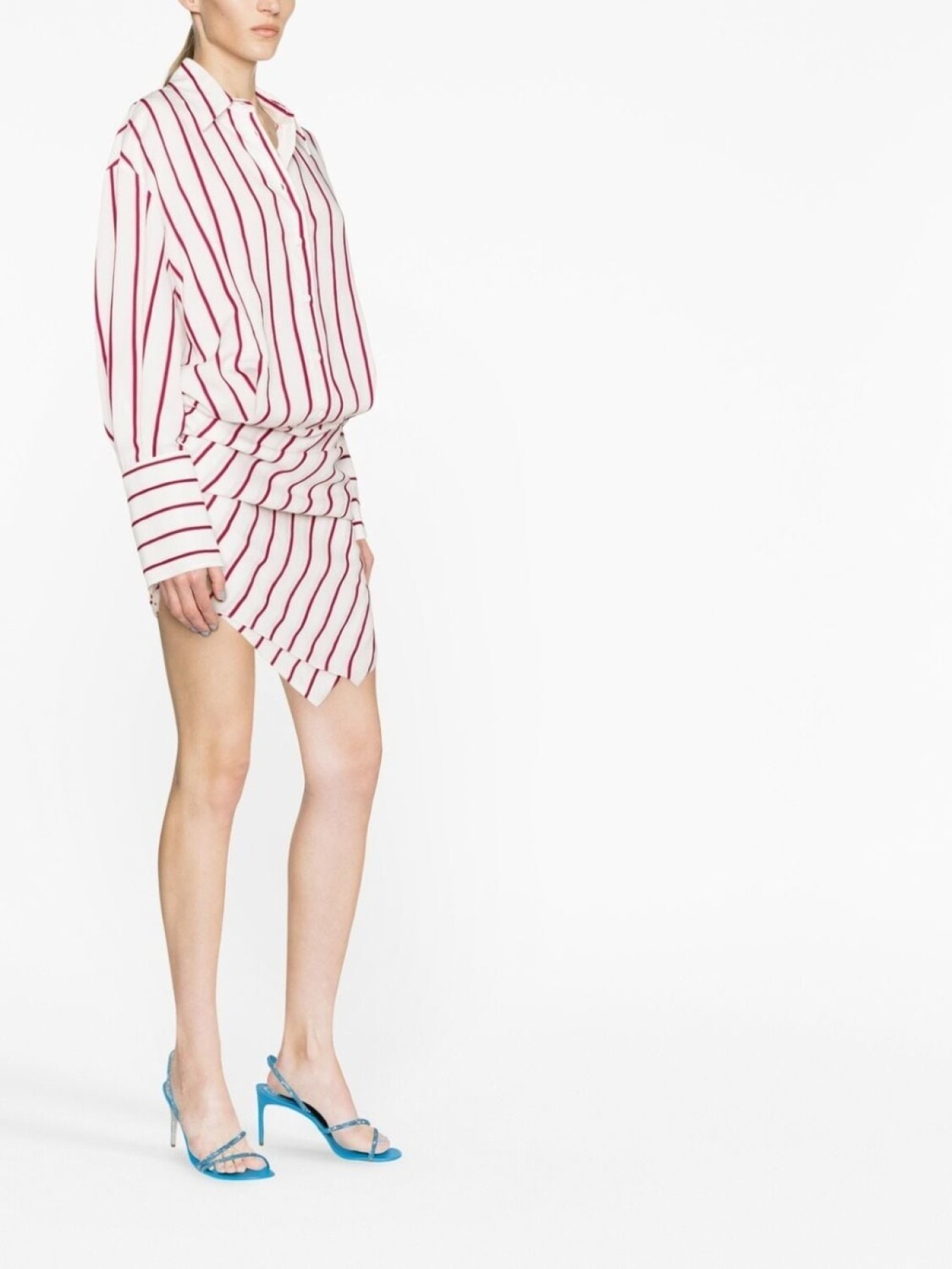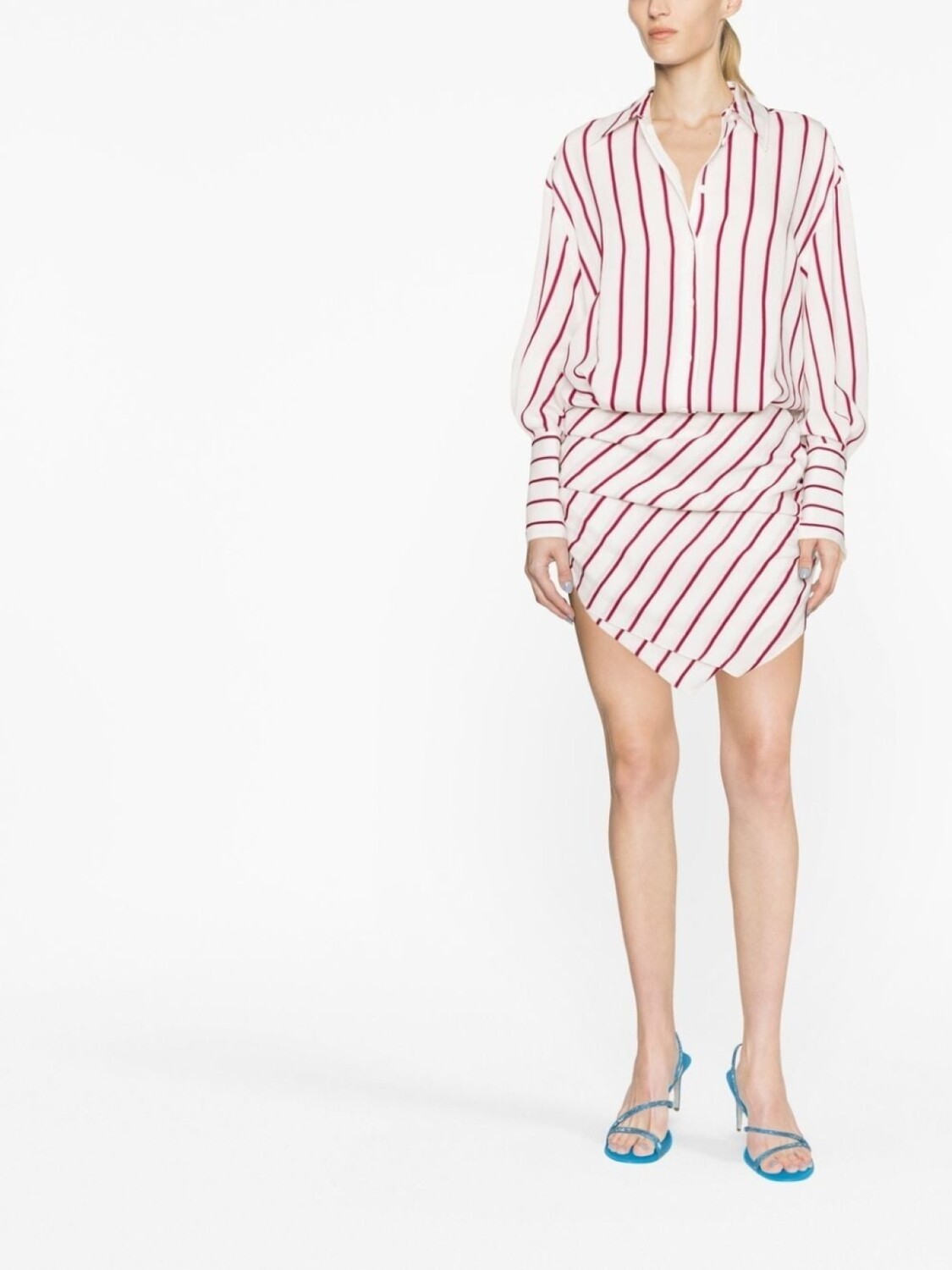 Белый, красный, принт в вертикальную полоску, отложной воротник, застежка на пуговицах спереди, детали с оборками, драпировка, длинные рукава и манжеты на пуговицах.