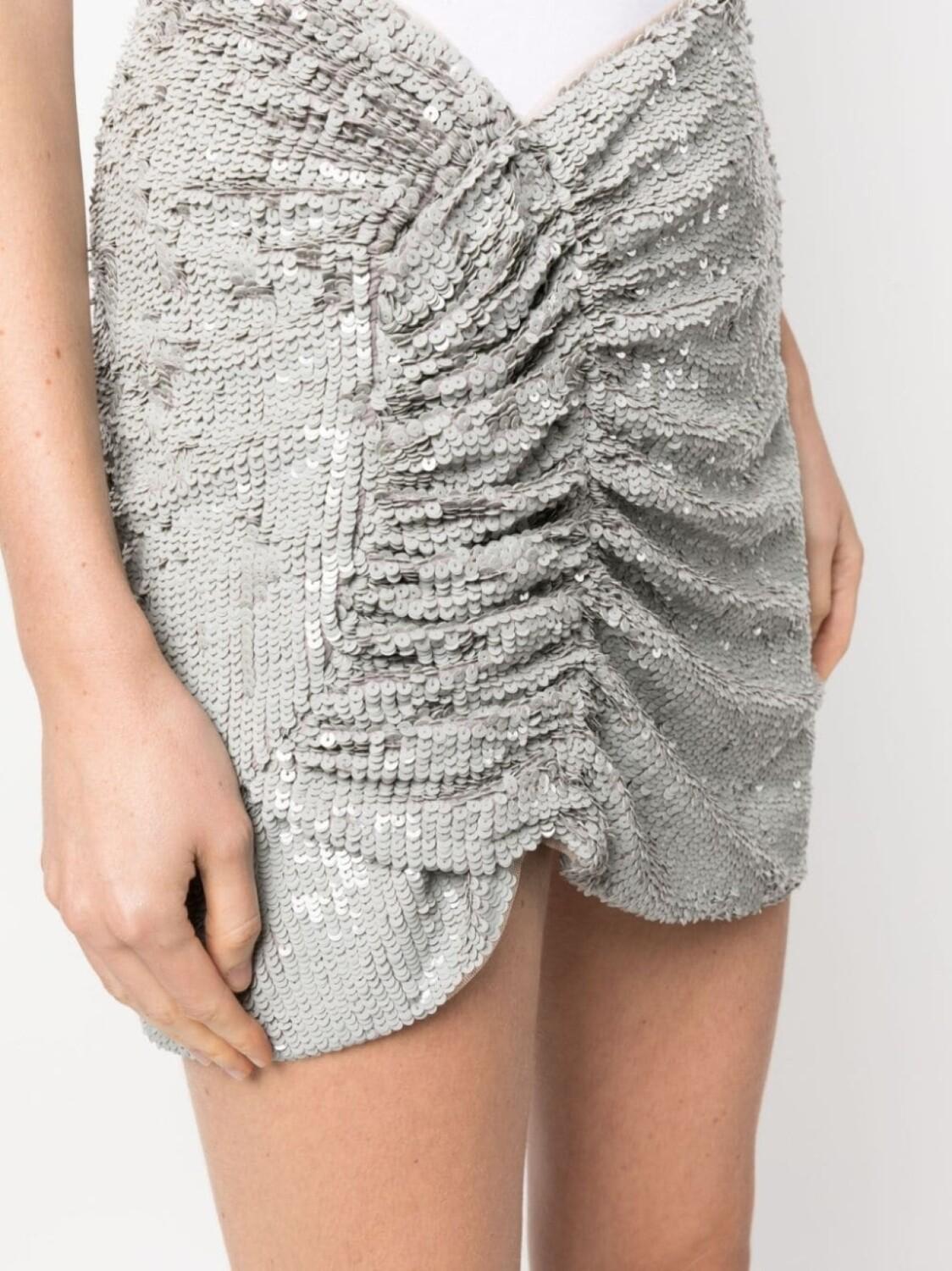 Холодный серый, пайетки, детали с оборками, средняя посадка, пояс с прорезями, застежка на молнии сзади, закругленный подол и длина до бедер.
