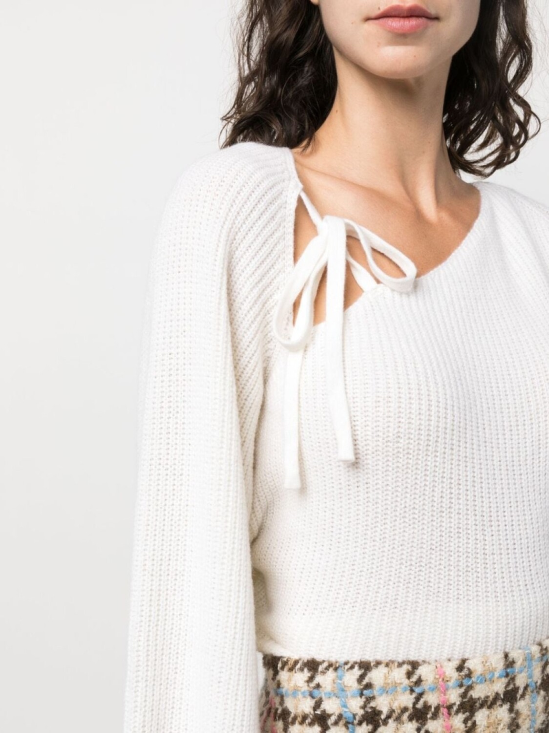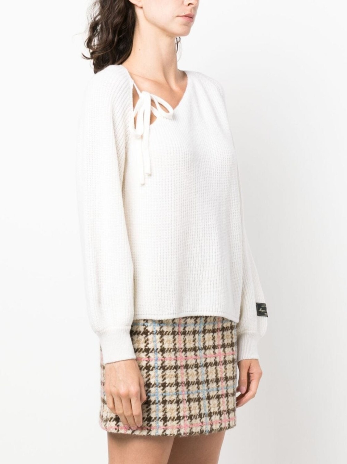 Цвет слоновой кости, смесь шерсти и кашемира, трикотажный материал, трикотаж в рубчик, нашивка с логотипом на рукаве, завязки, асимметричный вырез, объемные рукава, манжеты в рубчик и прямой подол.