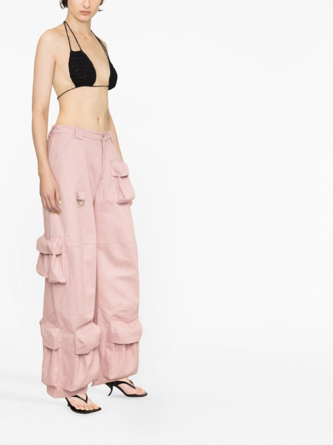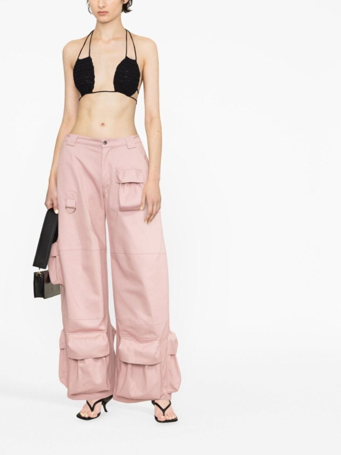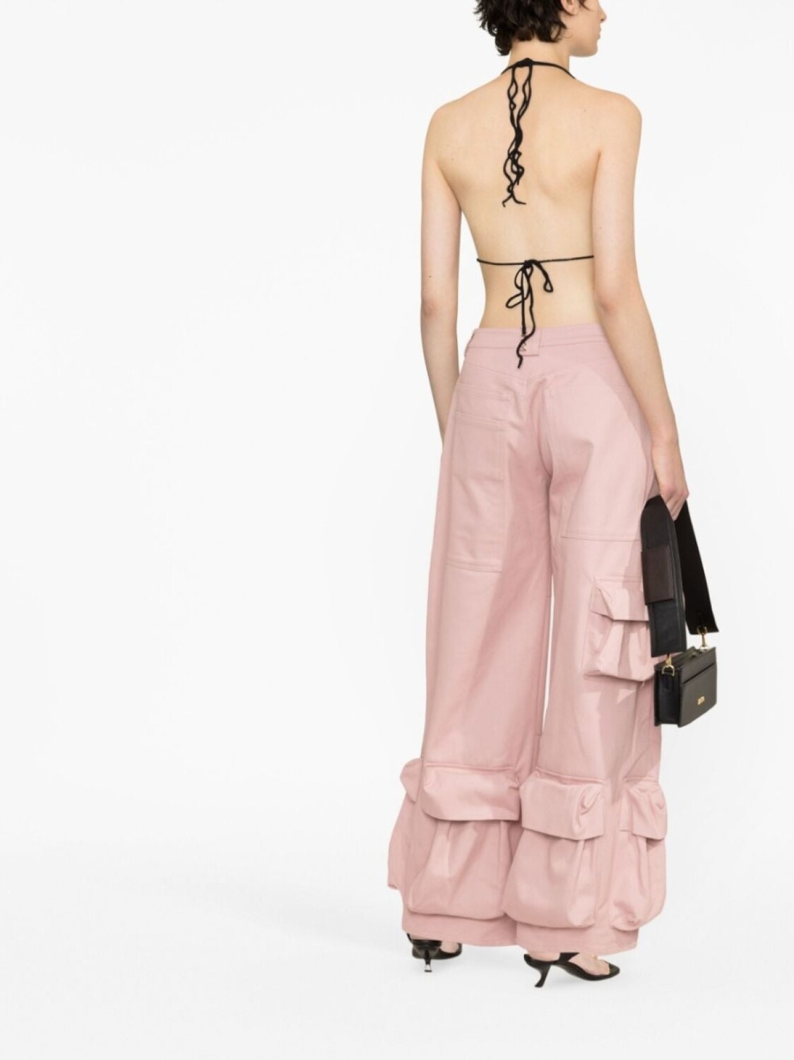 Черный, трикотажный материал, завязки вокруг шеи, застежка на завязке сзади и открытая спина. Пожалуйста, примеряйте купальники и пляжные шорты только поверх собственного белья.