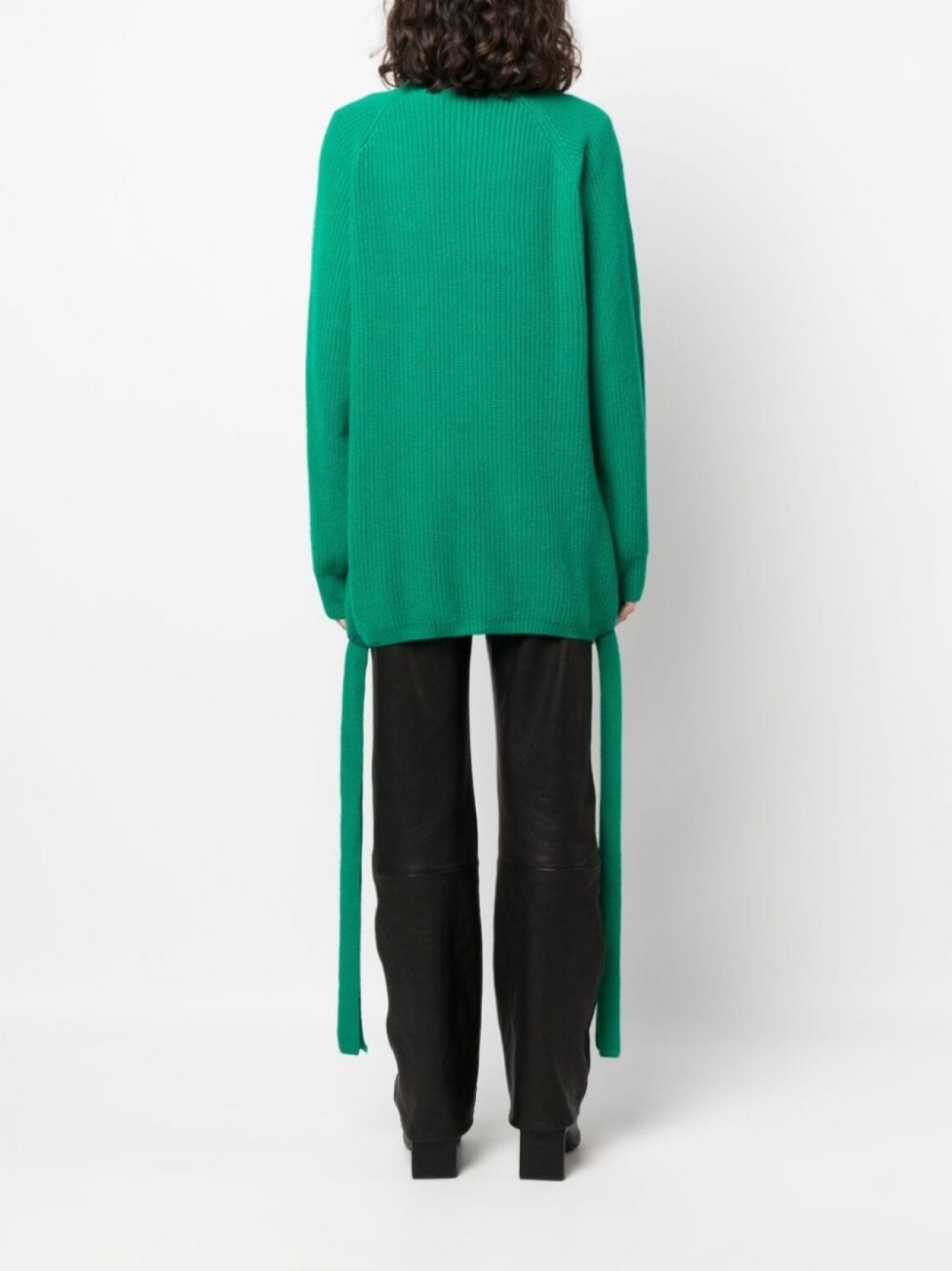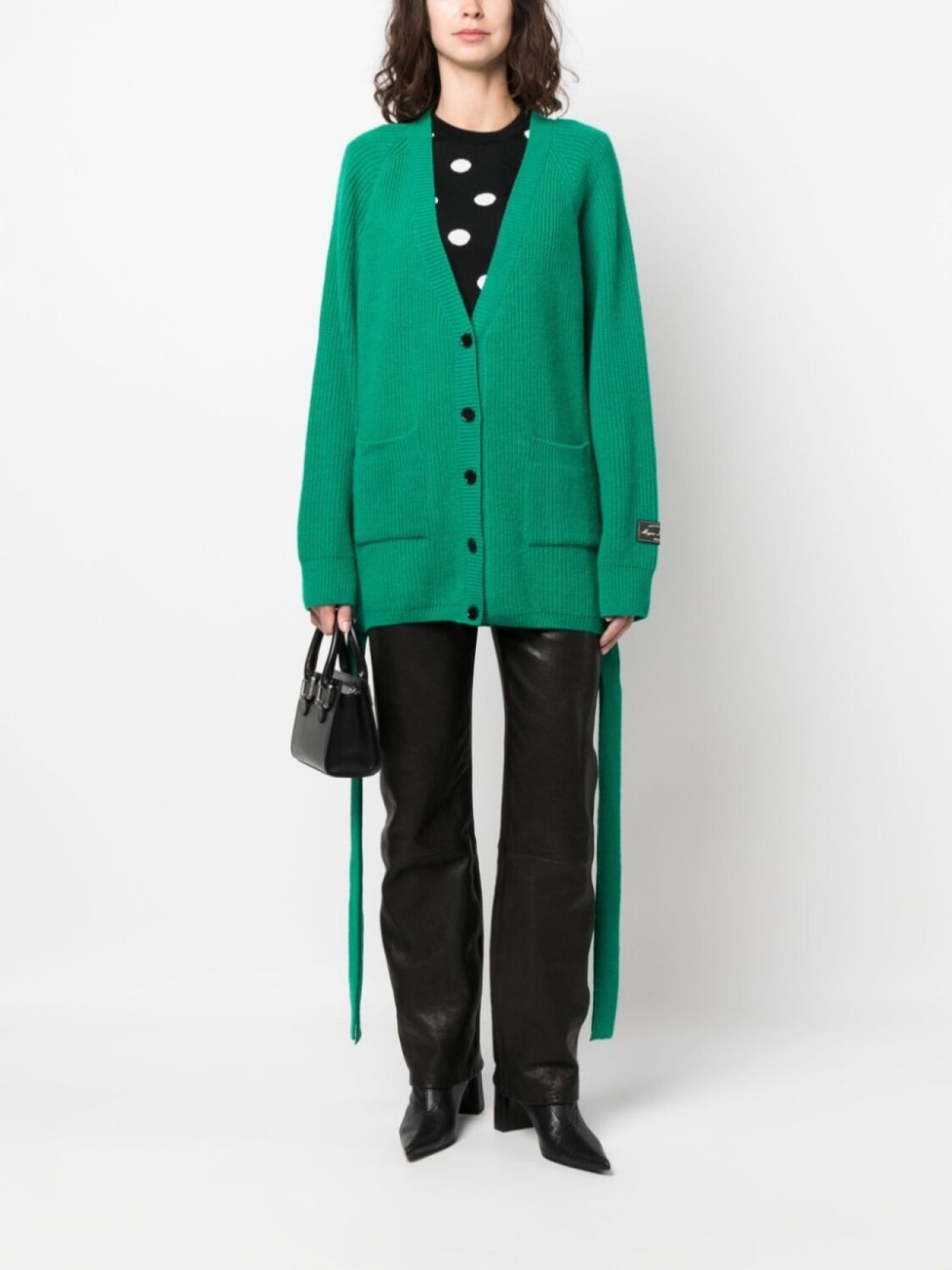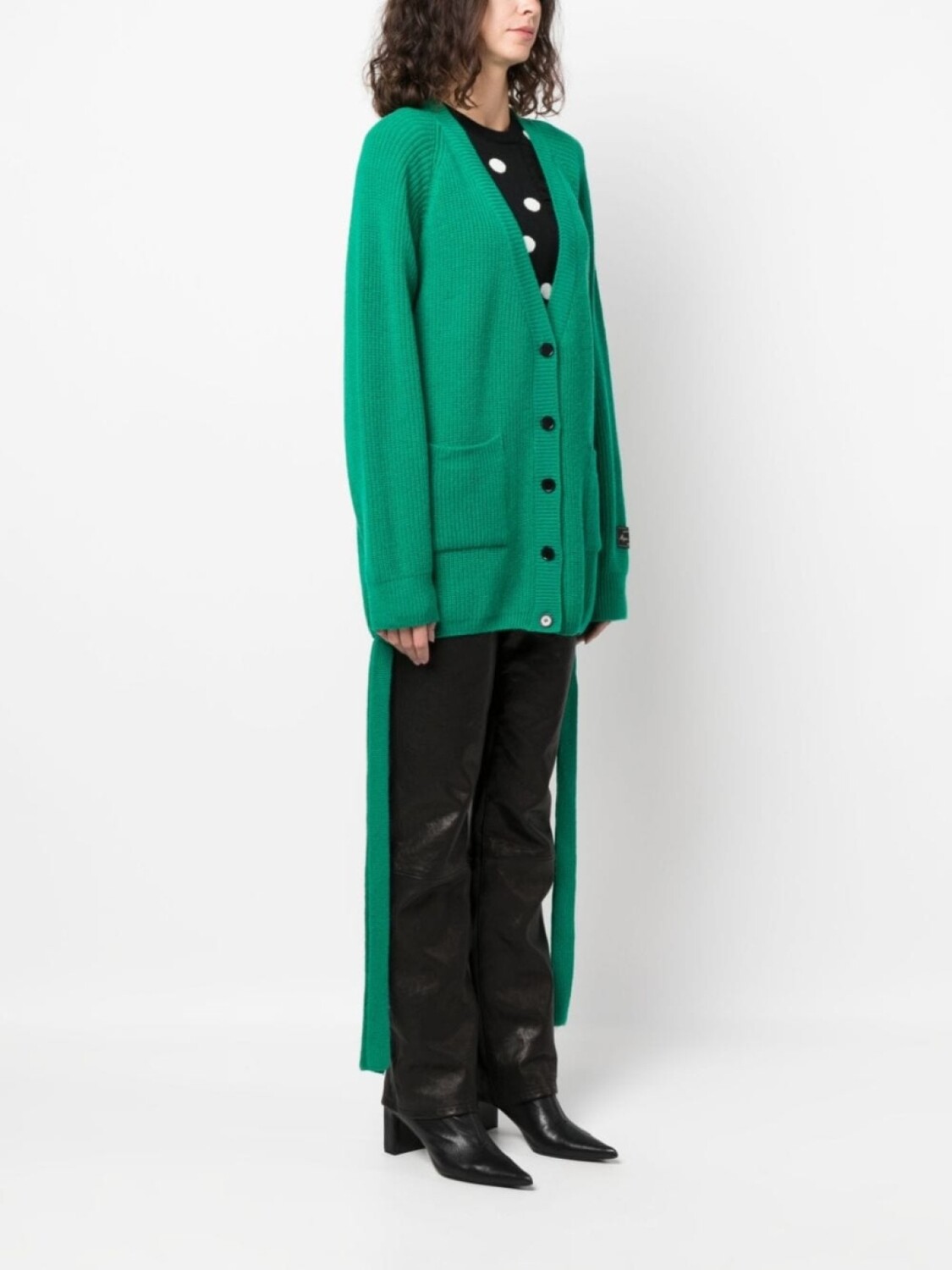 Нефритовый, смесь шерсти и кашемира, трикотажный материал, трикотаж в рубчик, нашивка с логотипом на рукаве, драпировка, глубокий V-образный вырез, застежка на пуговицах спереди, длинные рукава реглан, два накладных кармана спереди и прямой подол.