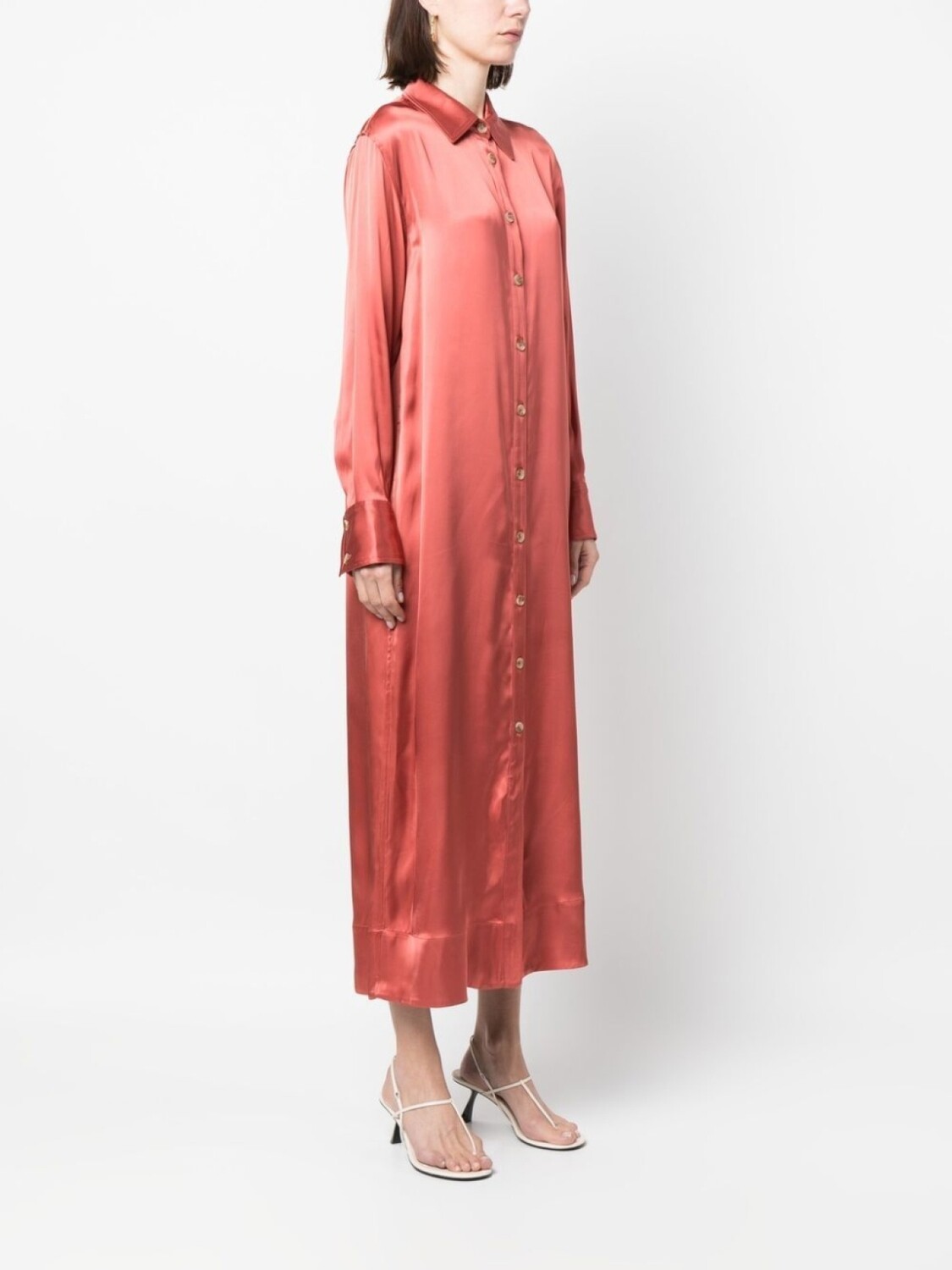Светло-красный, сатиновый финиш, классический воротник, застежка на пуговицах спереди, длинные рукава, манжеты на пуговицах и длина миди.