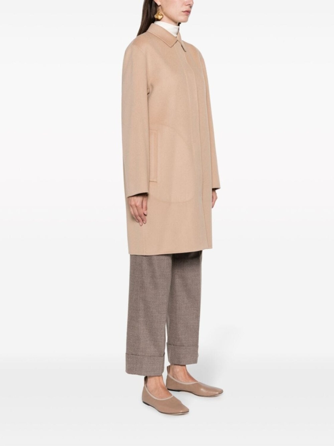 Бежево-коричневый, смесь шерсти и кашемира, классический воротник, длинные рукава, два вшитых кармана по бокам, потайная застежка спереди, цельная подкладка, прямой подол и длина до бедер.