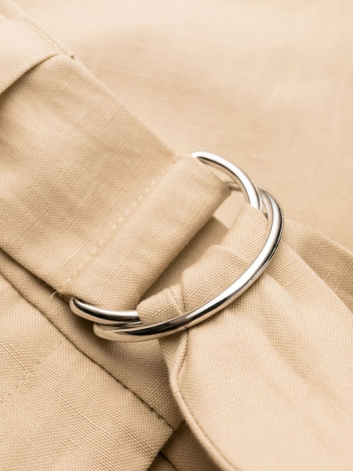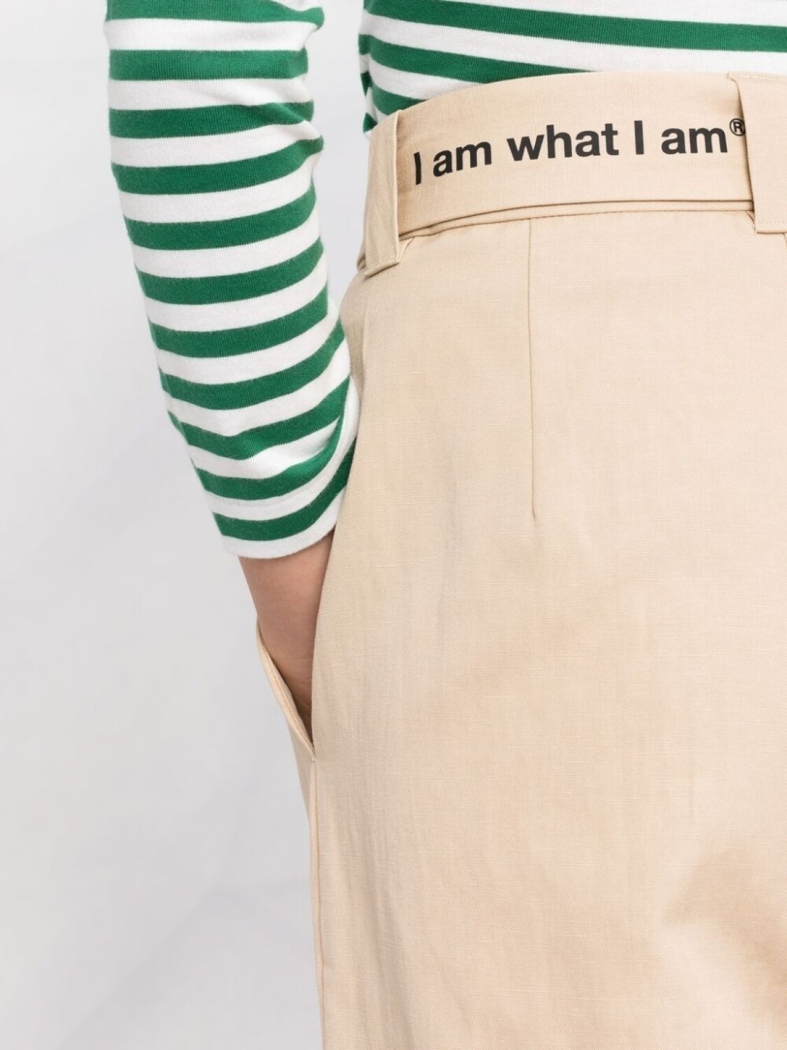 Принт с надписью сзади, ремень с D-образной пряжкой, завышенная талия, два прорезных кармана по бокам, прямой крой и подвернутые манжеты.