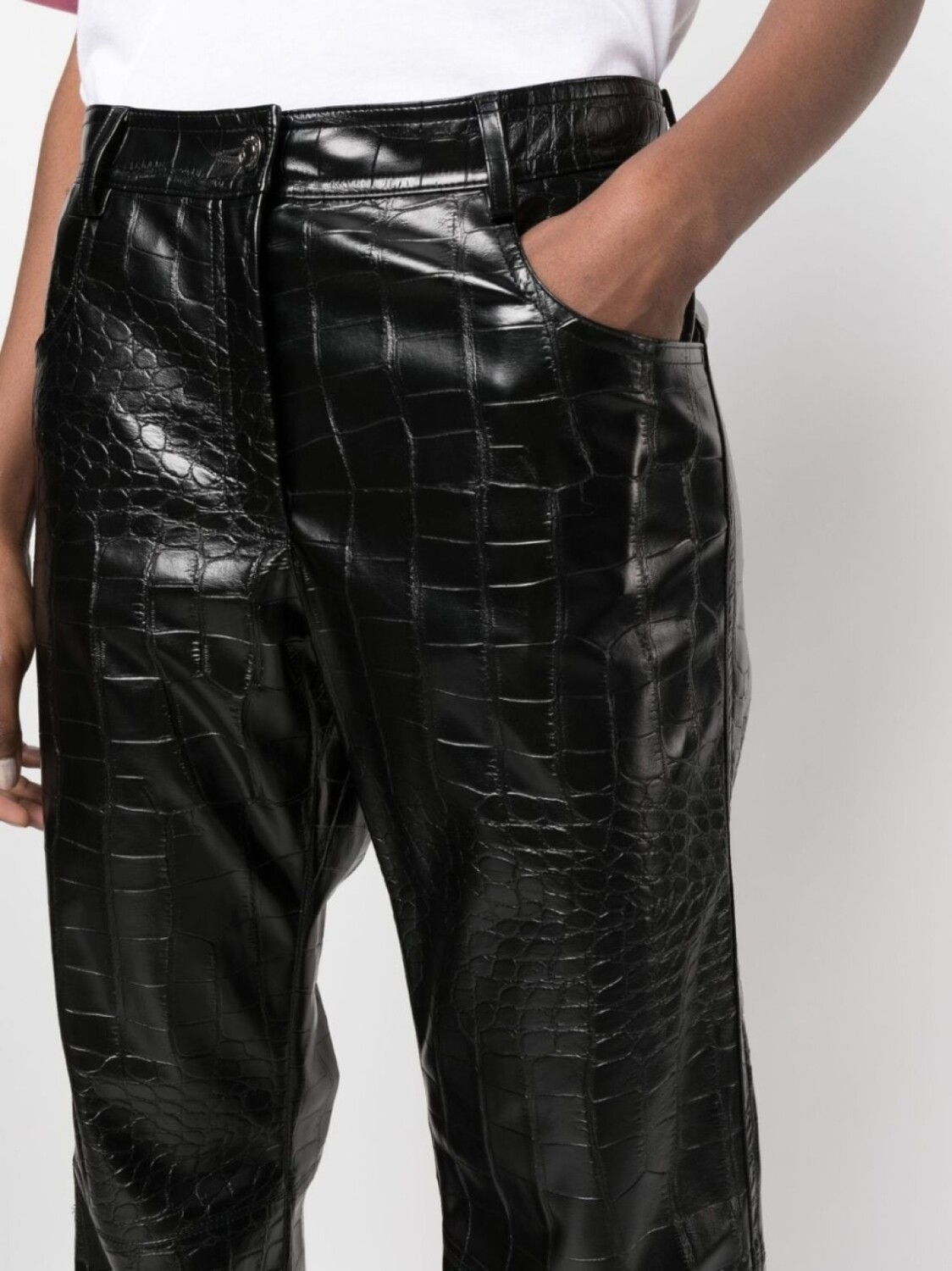 Черный, тиснение под кожу крокодила, нашивка с логотипом сзади, завышенная линия талии, прямой крой, петли для ремня, застежка на молнии и пуговице спереди, два кармана по бокам и два накладных кармана сзади.