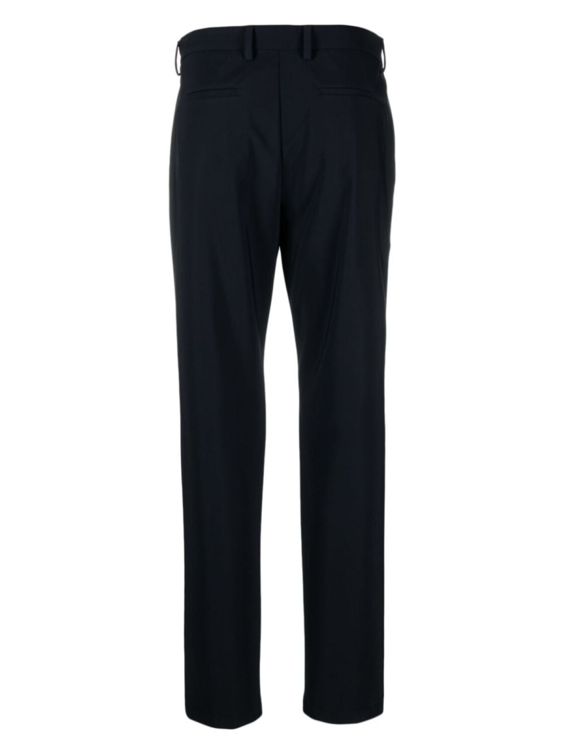 Темно-синий, эластичный материал, строчка в тон, петли для ремня, потайная застежка на молнии и пуговицах, узкий крой, два прорезных кармана по бокам, два кармана с листочкой сзади и прямой подол.