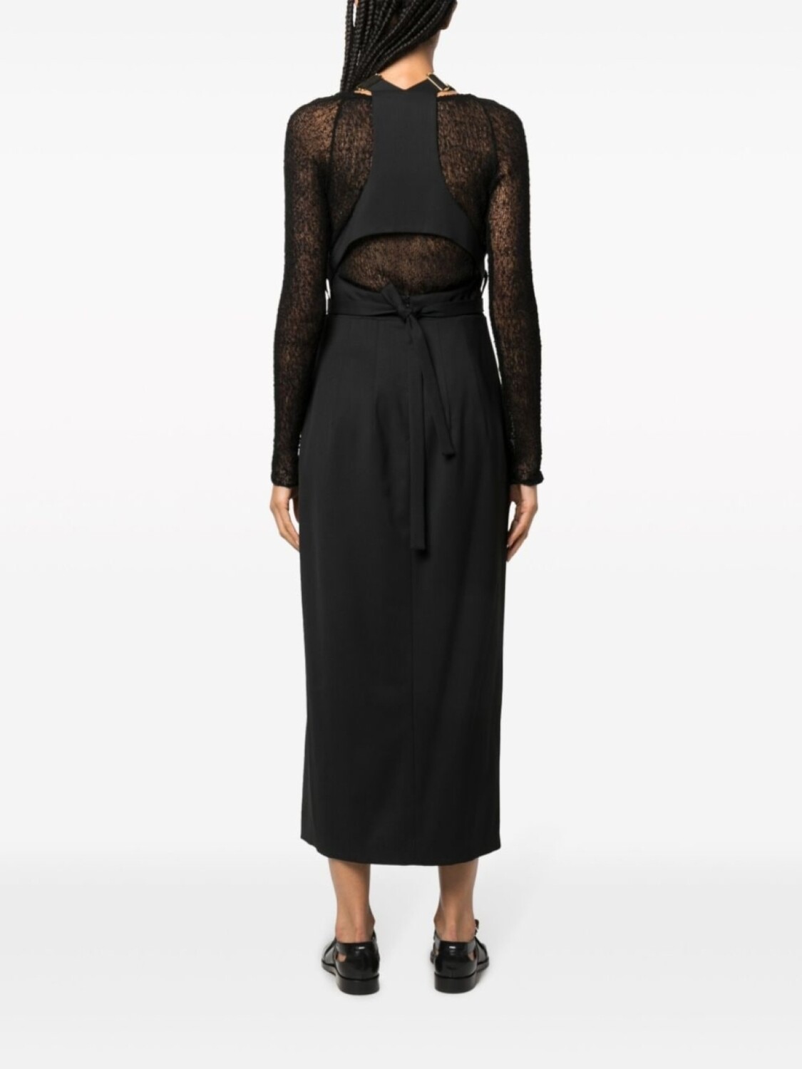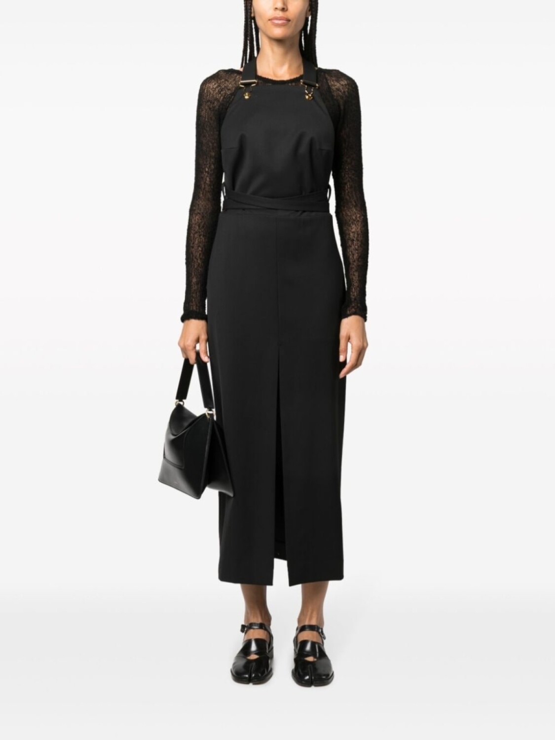 Черный, смесовая необработанная шерсть, вырезные детали, квадратный вырез, застежка на зажиме, без рукавов, петли для ремня, разрез спереди и длина до середины голени.