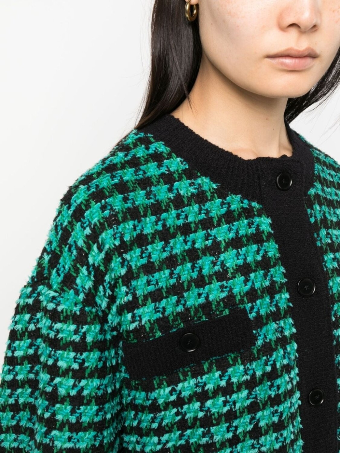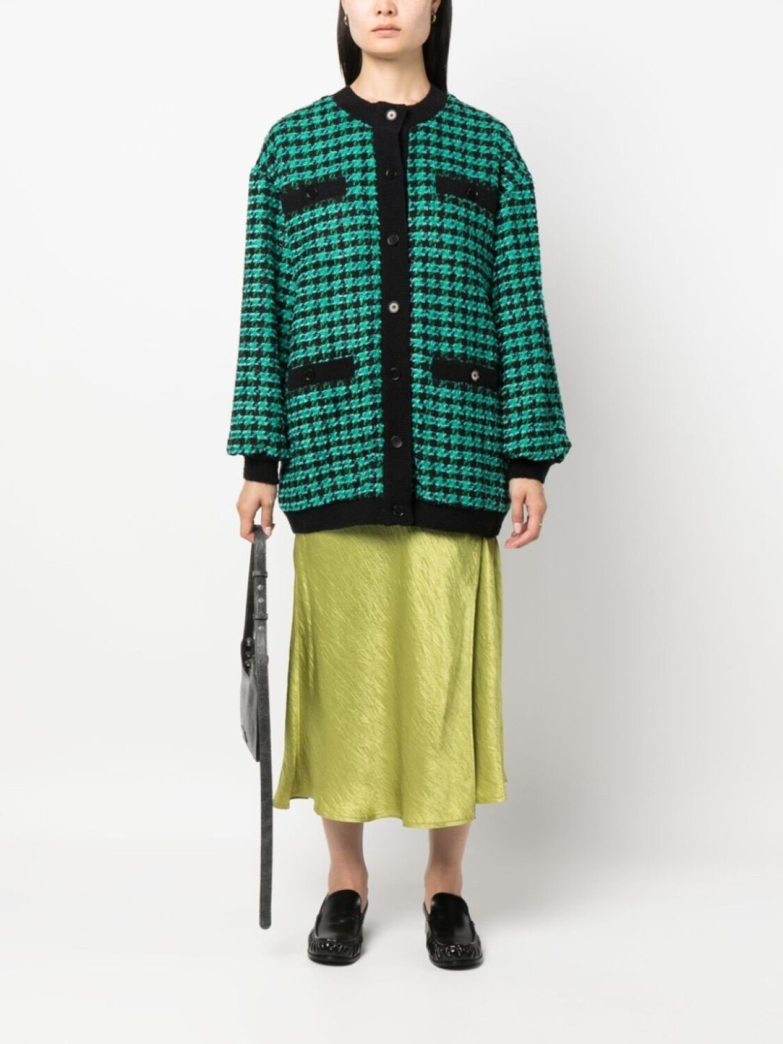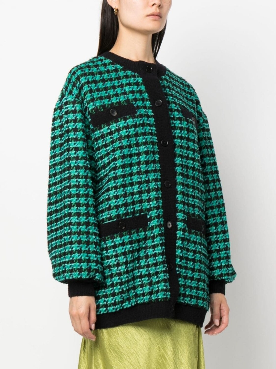 Сине-зеленый, черный, смесь хлопка и шерсти, твидовая ткань, узор в ломаную клетку, встречная складка, круглый вырез, застежка на пуговицах спереди, четыре накладных кармана спереди, приспущенные плечи и длинные рукава.