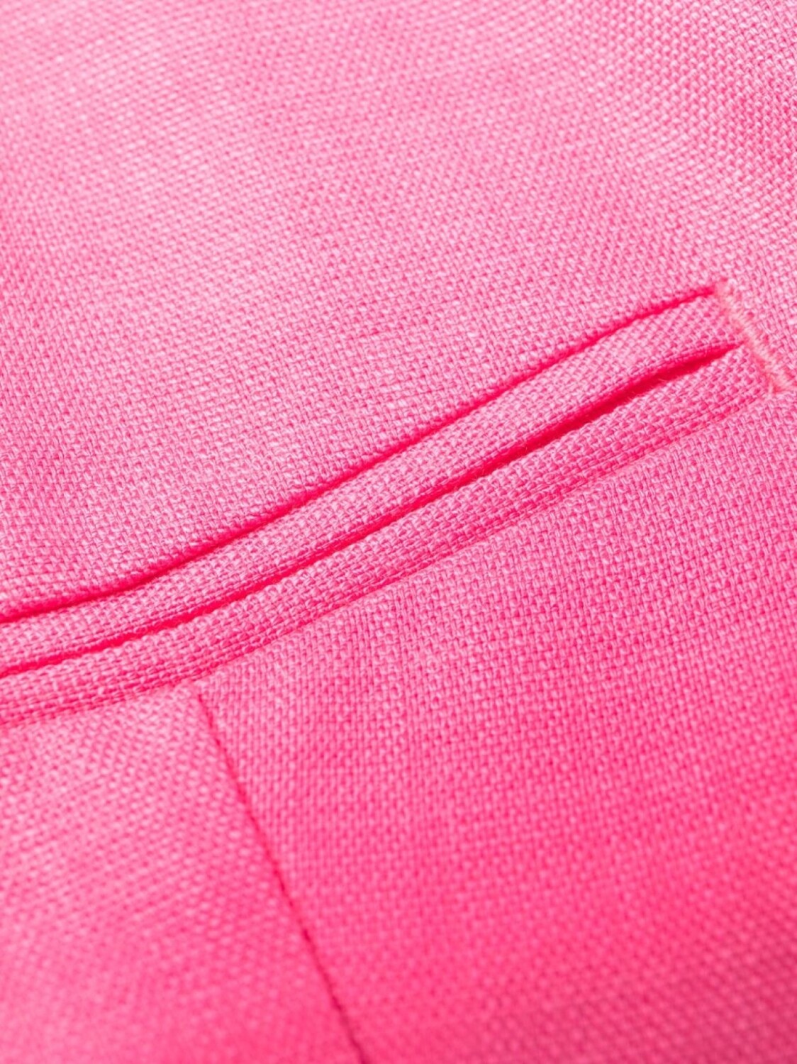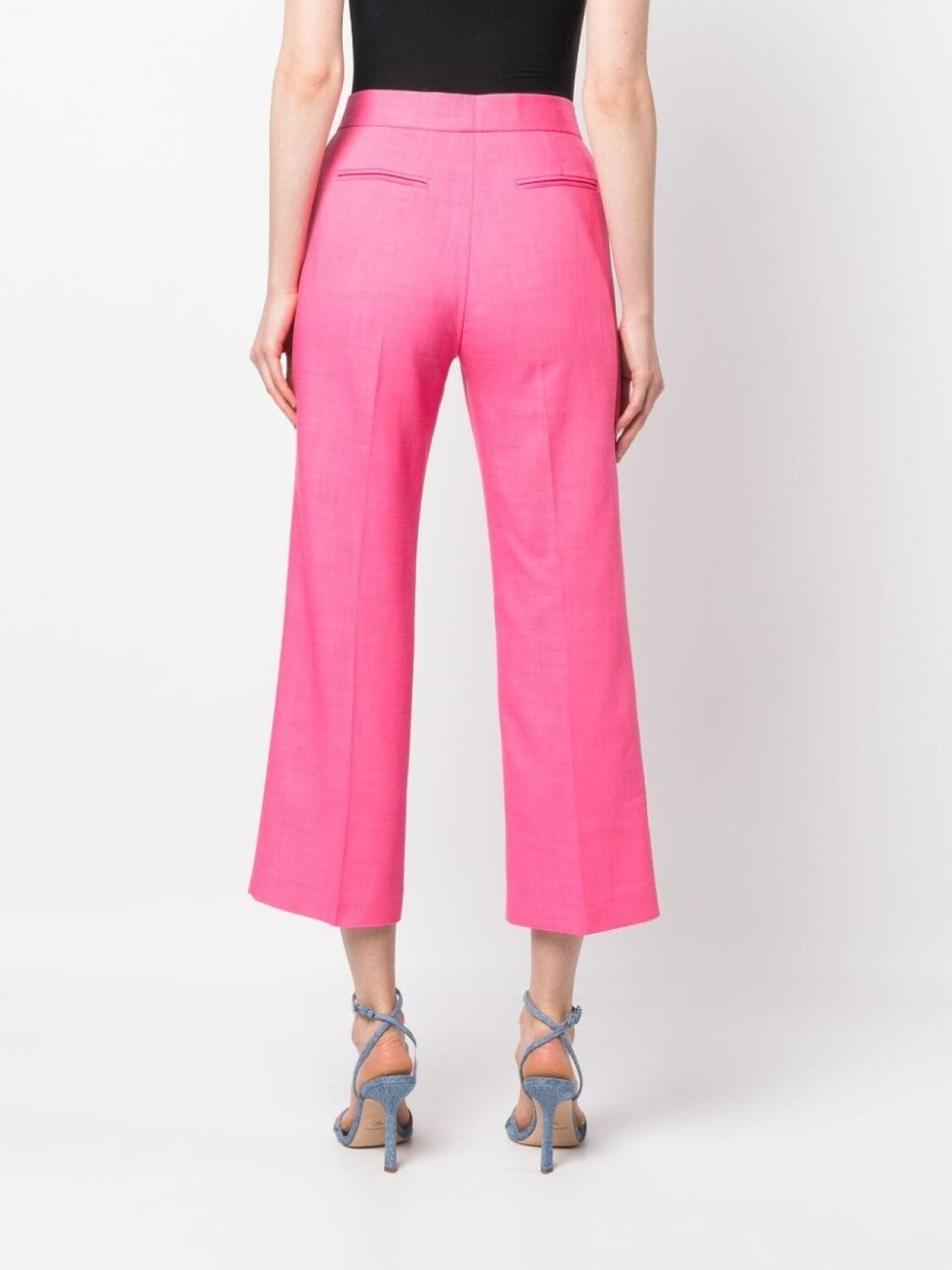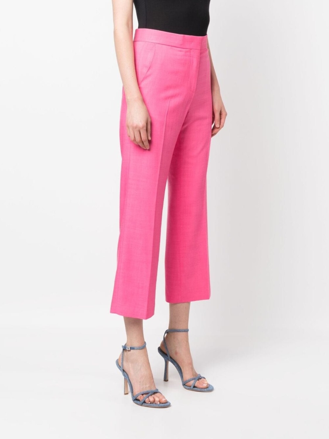 Нежно-розовый, стрелки, завышенная талия, потайная застежка спереди, два вшитых кармана по бокам, два прорезных кармана сзади и укороченная длина.
