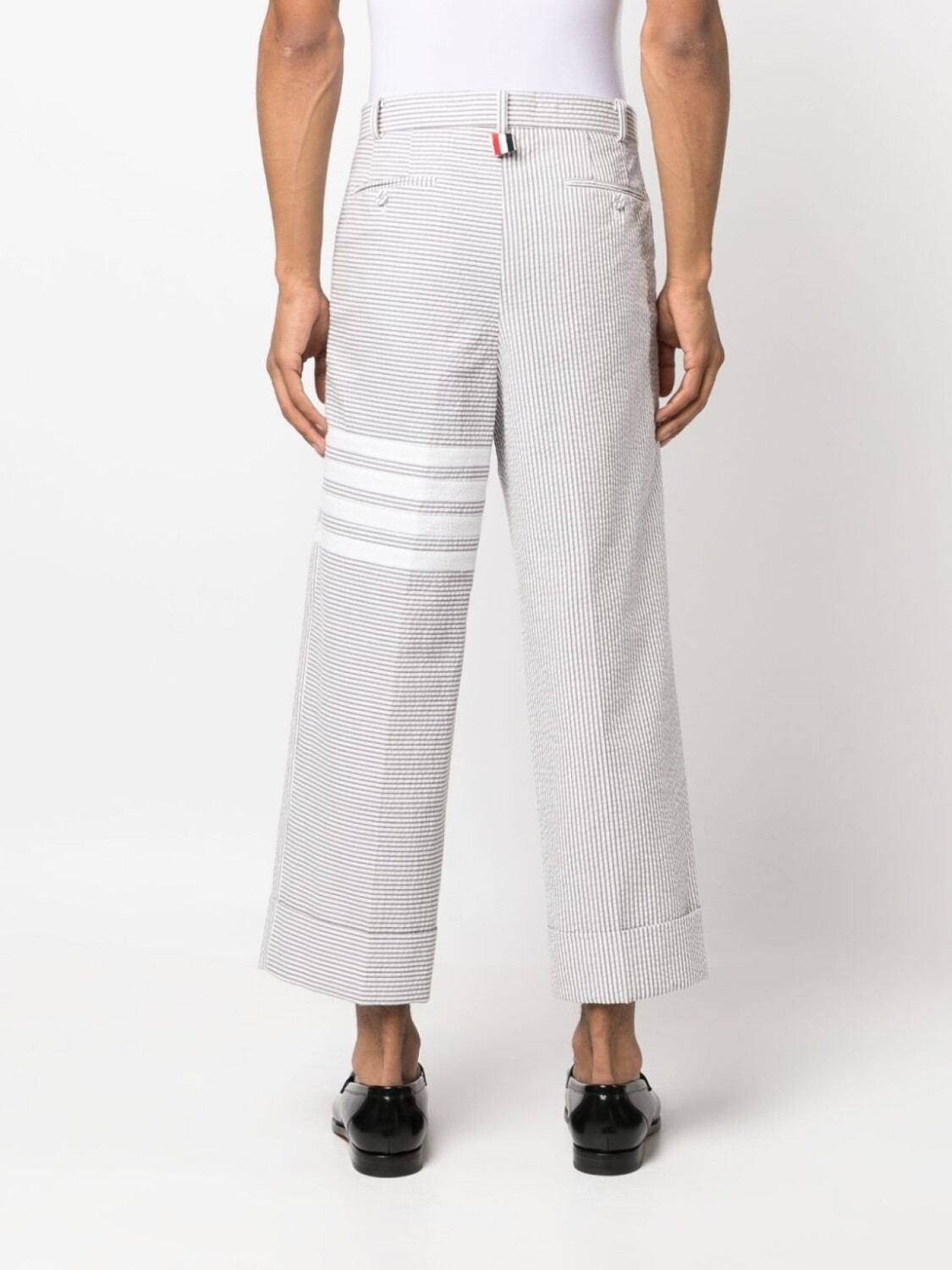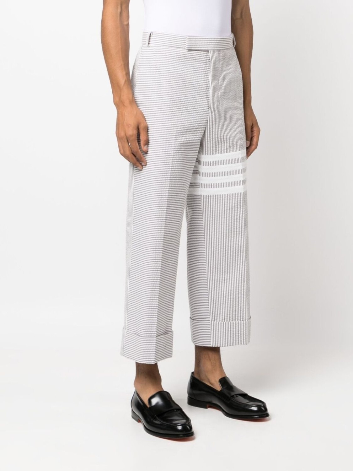 Светло-серый, белый, хлопок, узор в вертикальную полоску, знаковая деталь в полоску, полоски RWB, полоски 4-Bar, низкая посадка, петли для ремня, потайная застежка на молнии и пуговицах, два прорезных кармана по бокам, два прорезных кармана на пуговицах сзади и укороченная длина.