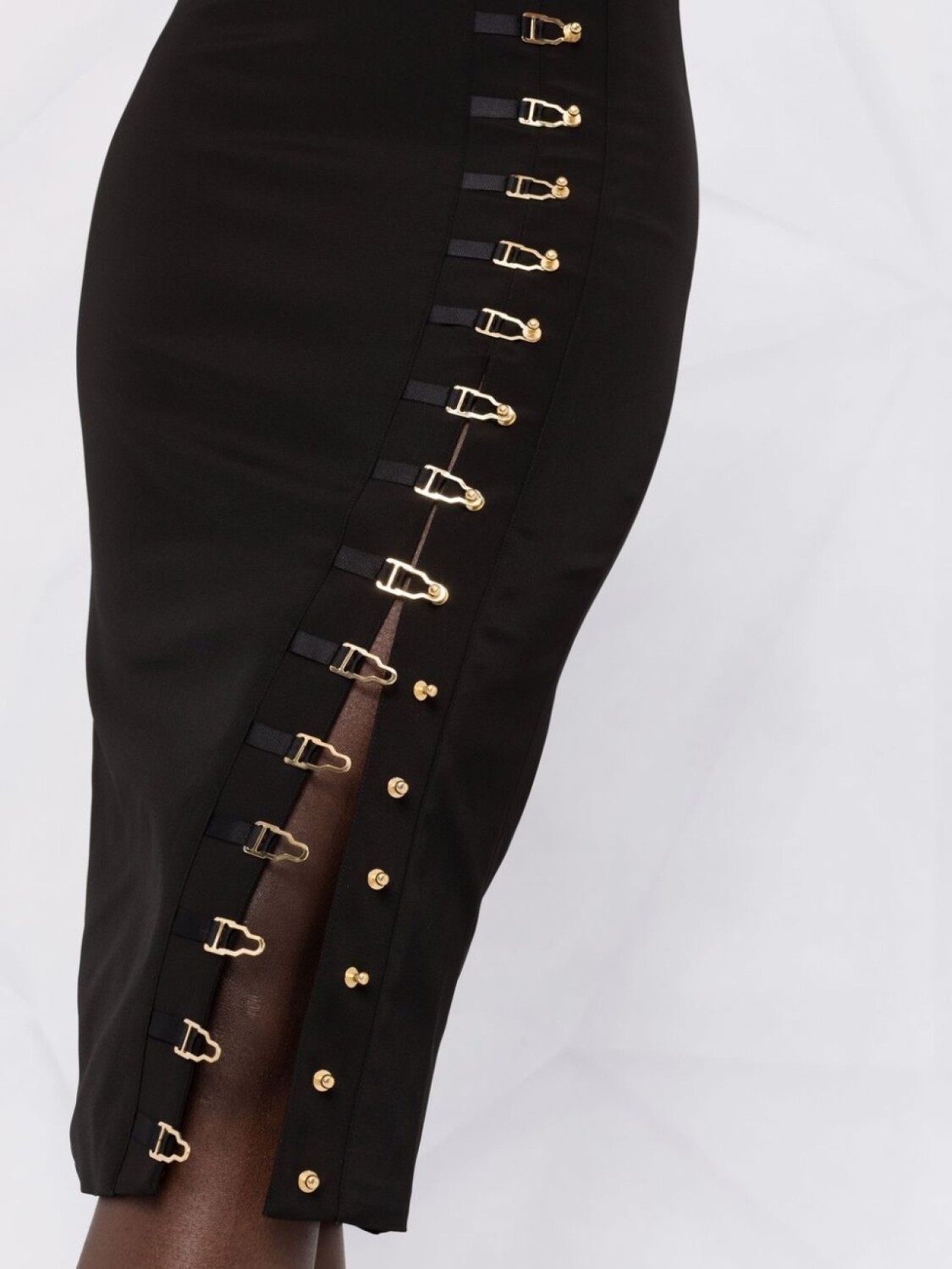 Застежка на крючке спереди, открытые плечи, потайная застежка на молнии сзади, разрез спереди и длина по колено. Цвет: черный.