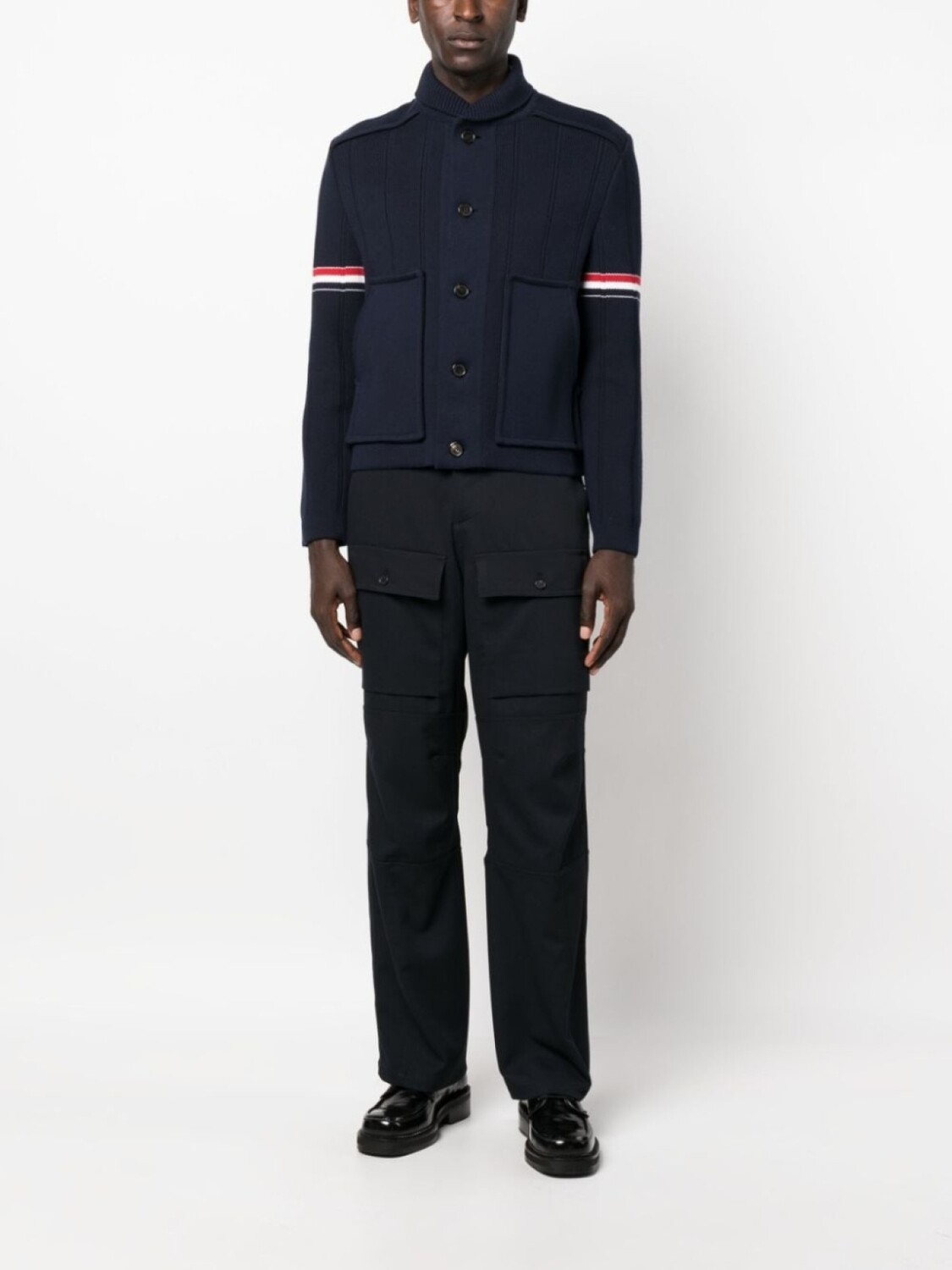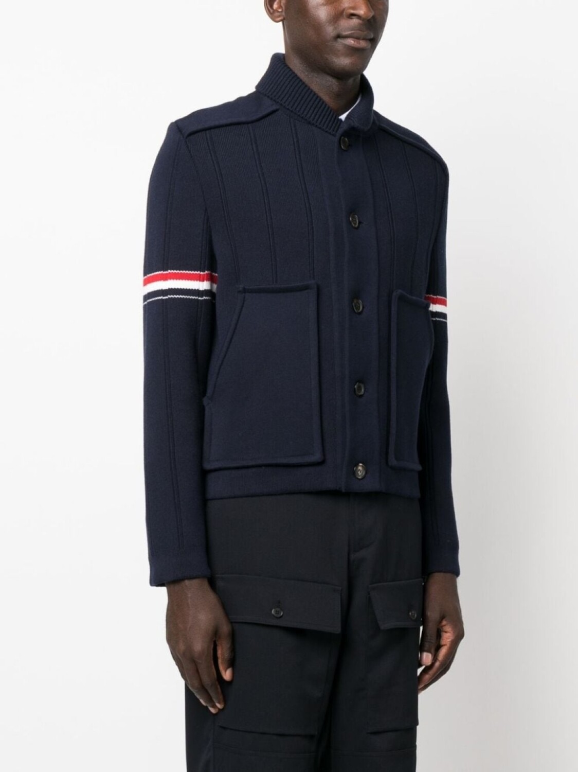 Темно-синий, хлопок, полоски RWB, длинные рукава и застежка на пуговицах спереди.
