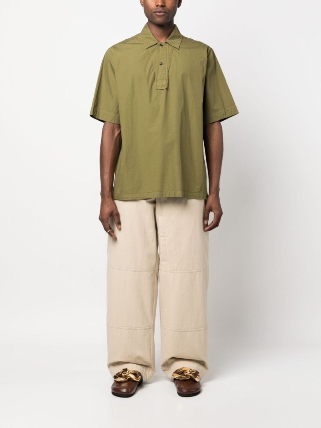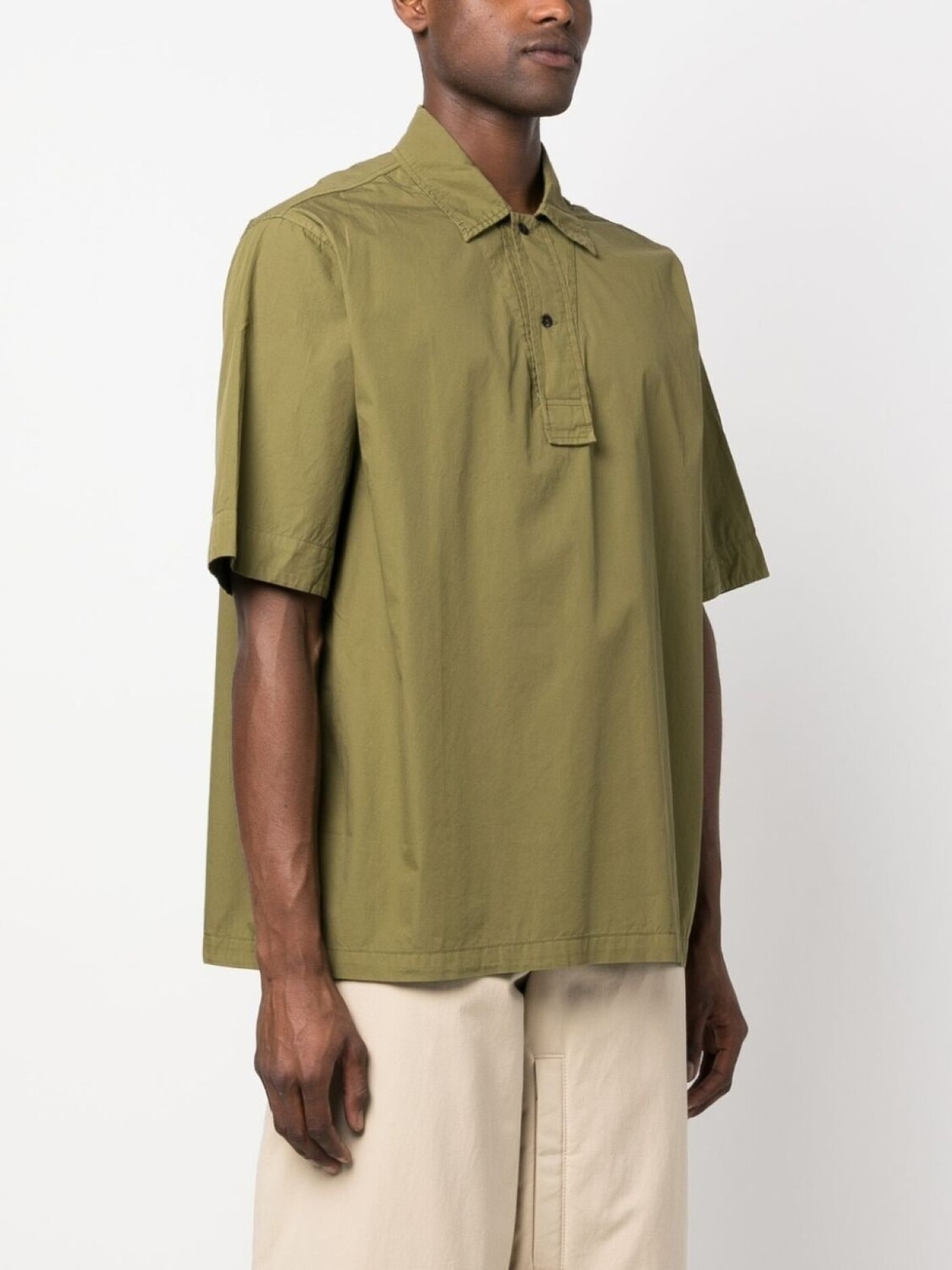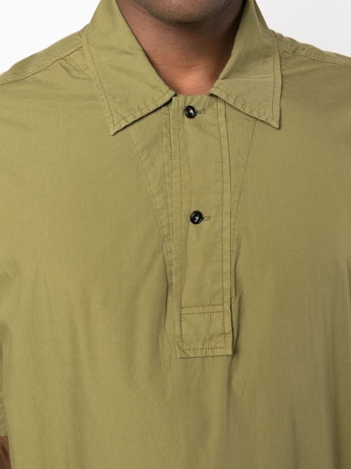 Оливково-зеленый, хлопок, воротник поло, застежка на пуговицах спереди, короткие рукава и прямой подол.