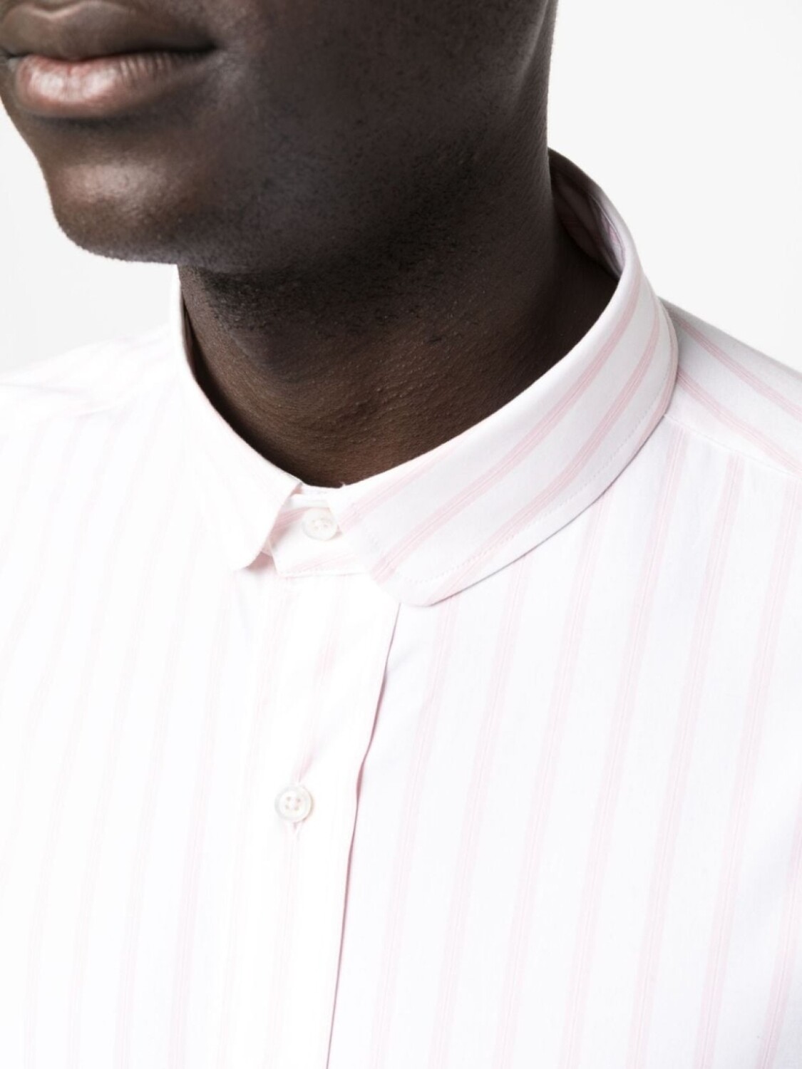 Светло-розовый, кремовый, хлопок, узор в вертикальную полоску, нашивка с логотипом спереди, застежка на пуговицах спереди, закругленный воротник, знаковая деталь в полоску, длинные рукава и закругленный подол.