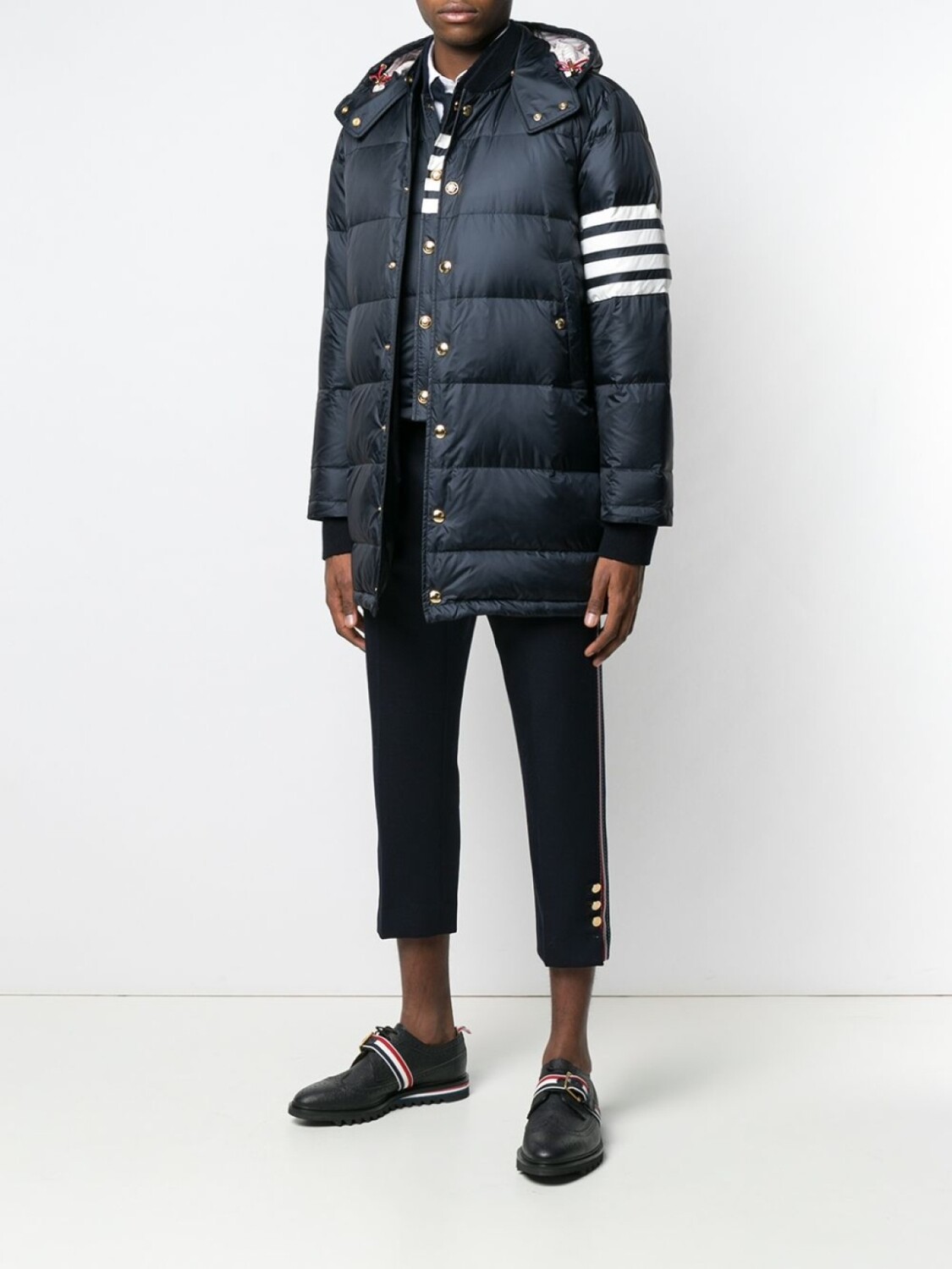Пуховик с полосками 4-Bar от THOM BROWNE. Прямой крой, застежка на кнопках, воротник с высокой стойкой, капюшон, боковые карманы, узкие манжеты и подкладка. Цвет: темно-синий.