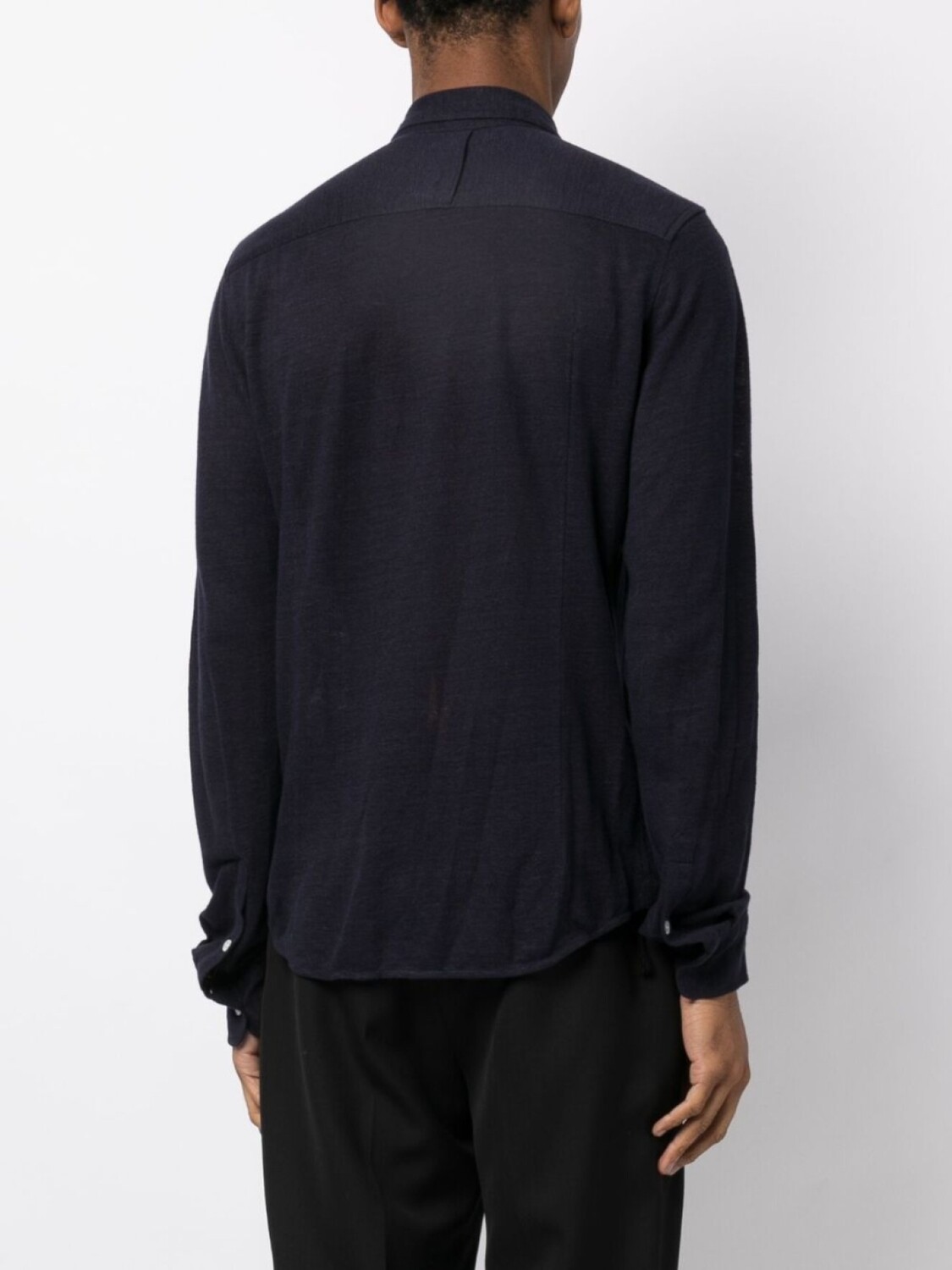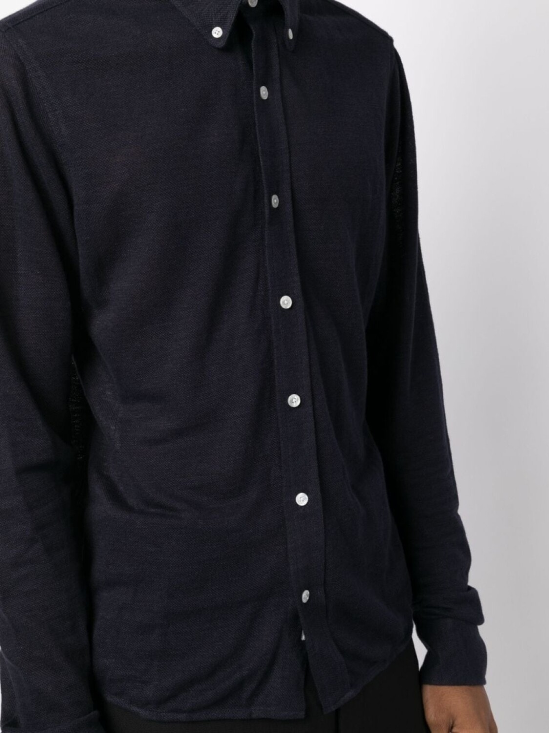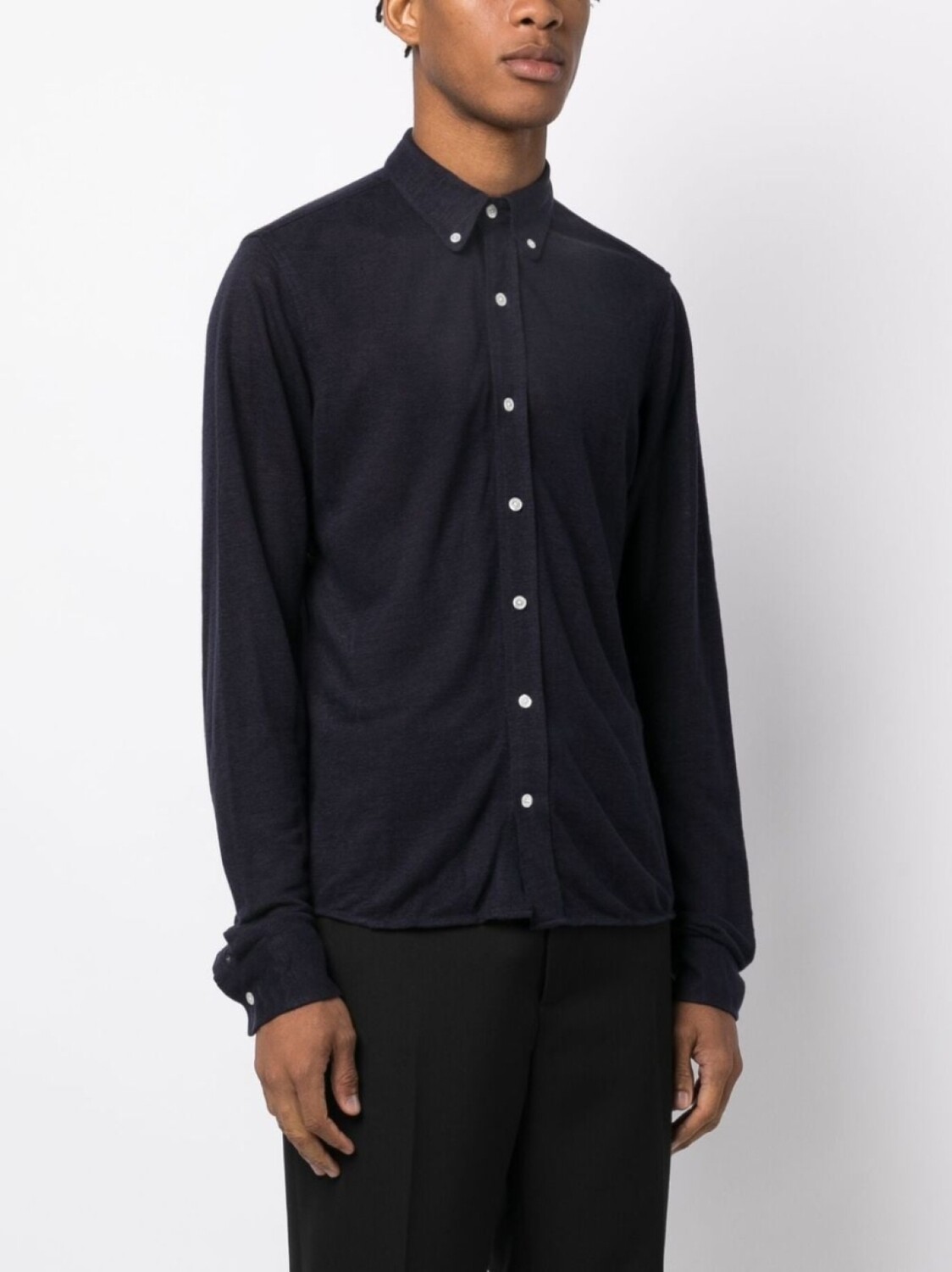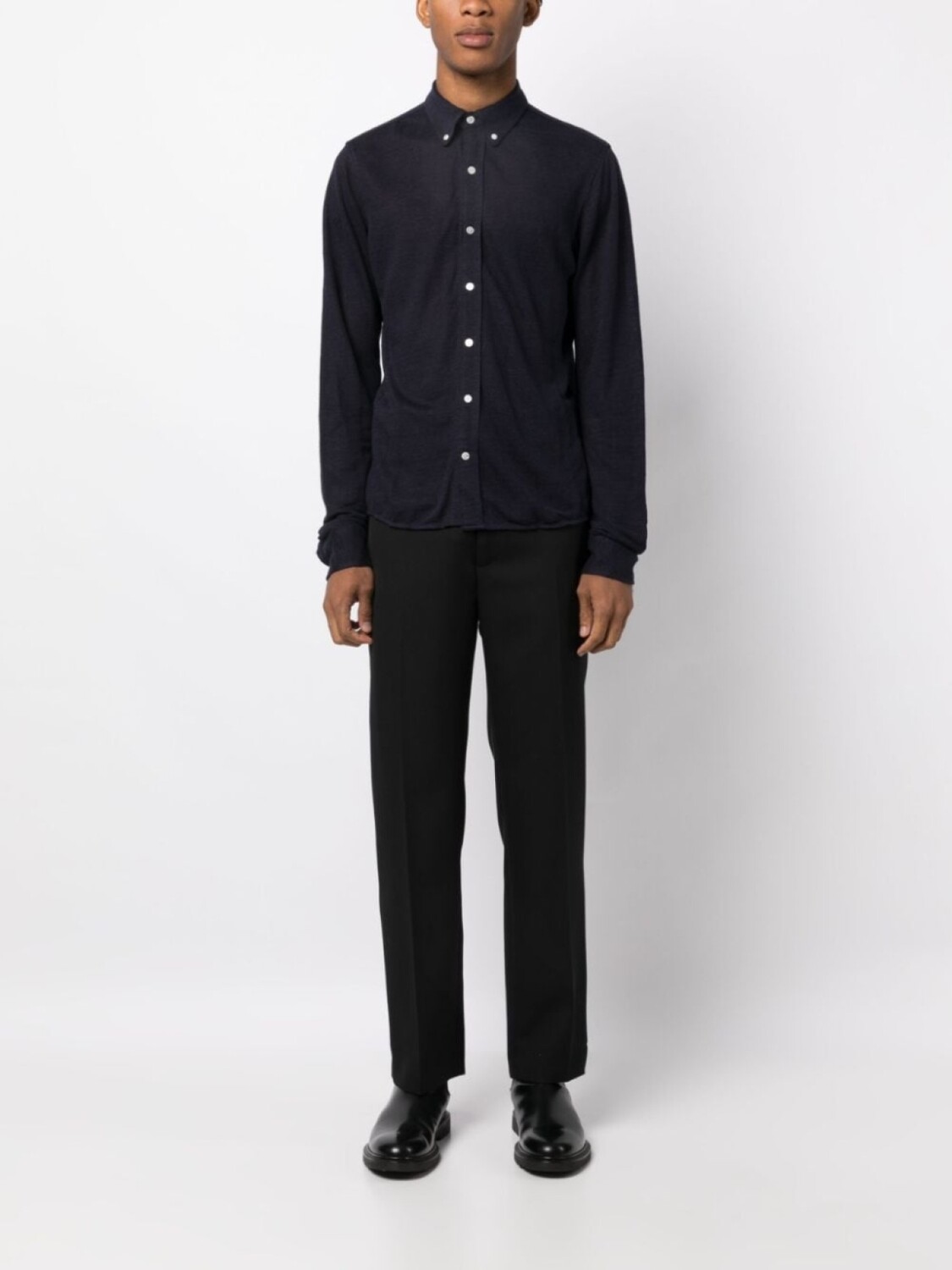 Темно-синий, хлопок, воротник на пуговицах, застежка на пуговицах спереди, длинные рукава, рукава с манжетами на пуговицах и прямой подол.