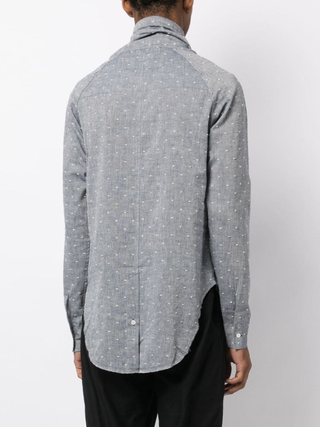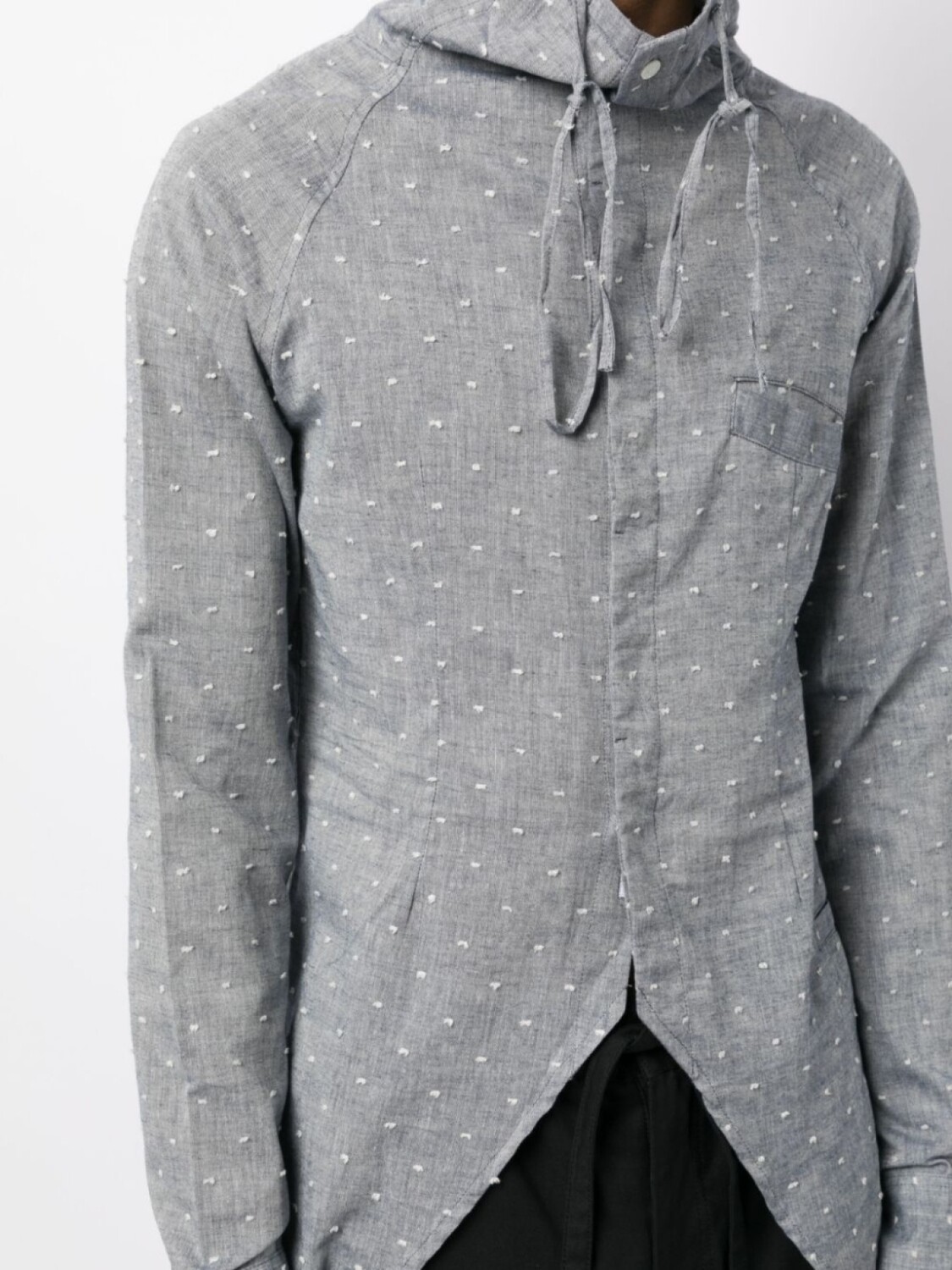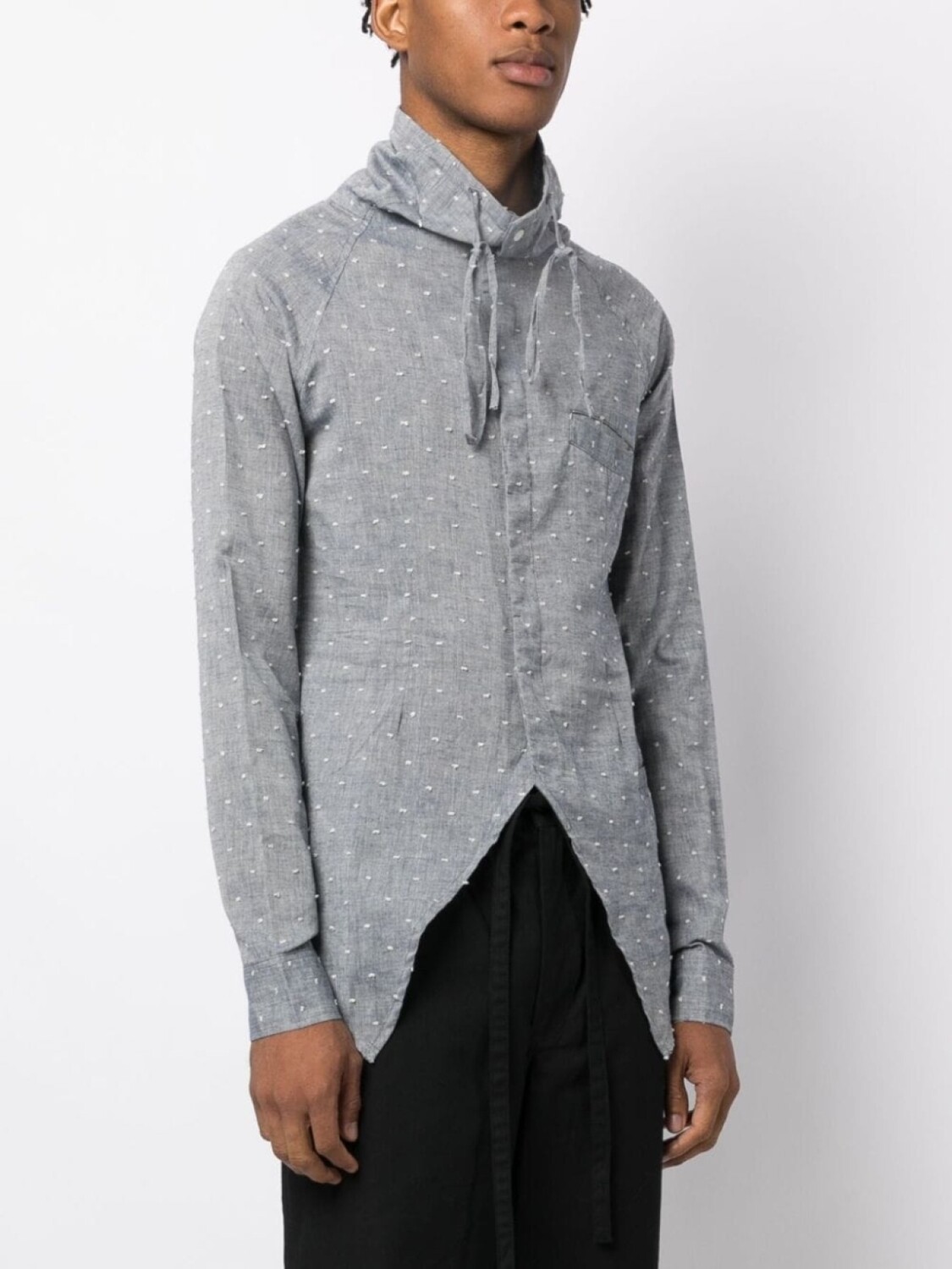 Сине-серый, смесь хлопка и льна, принт в горох, воротник-стойка, воротник с кулиской, потайная застежка спереди, прорезной карман спереди, длинные рукава, рукава с манжетами на пуговицах и асимметричный подол.