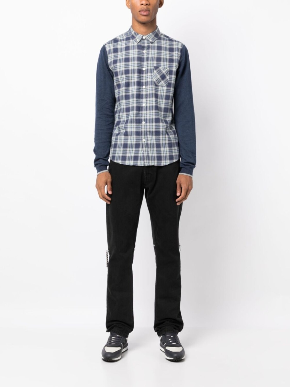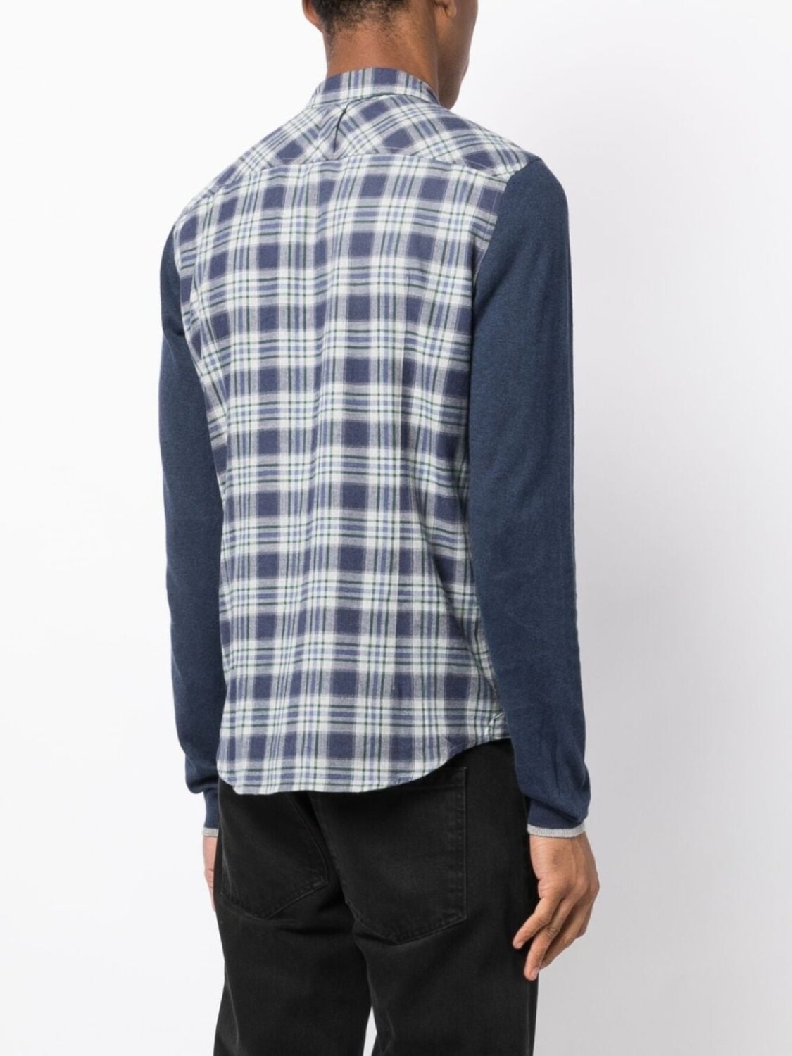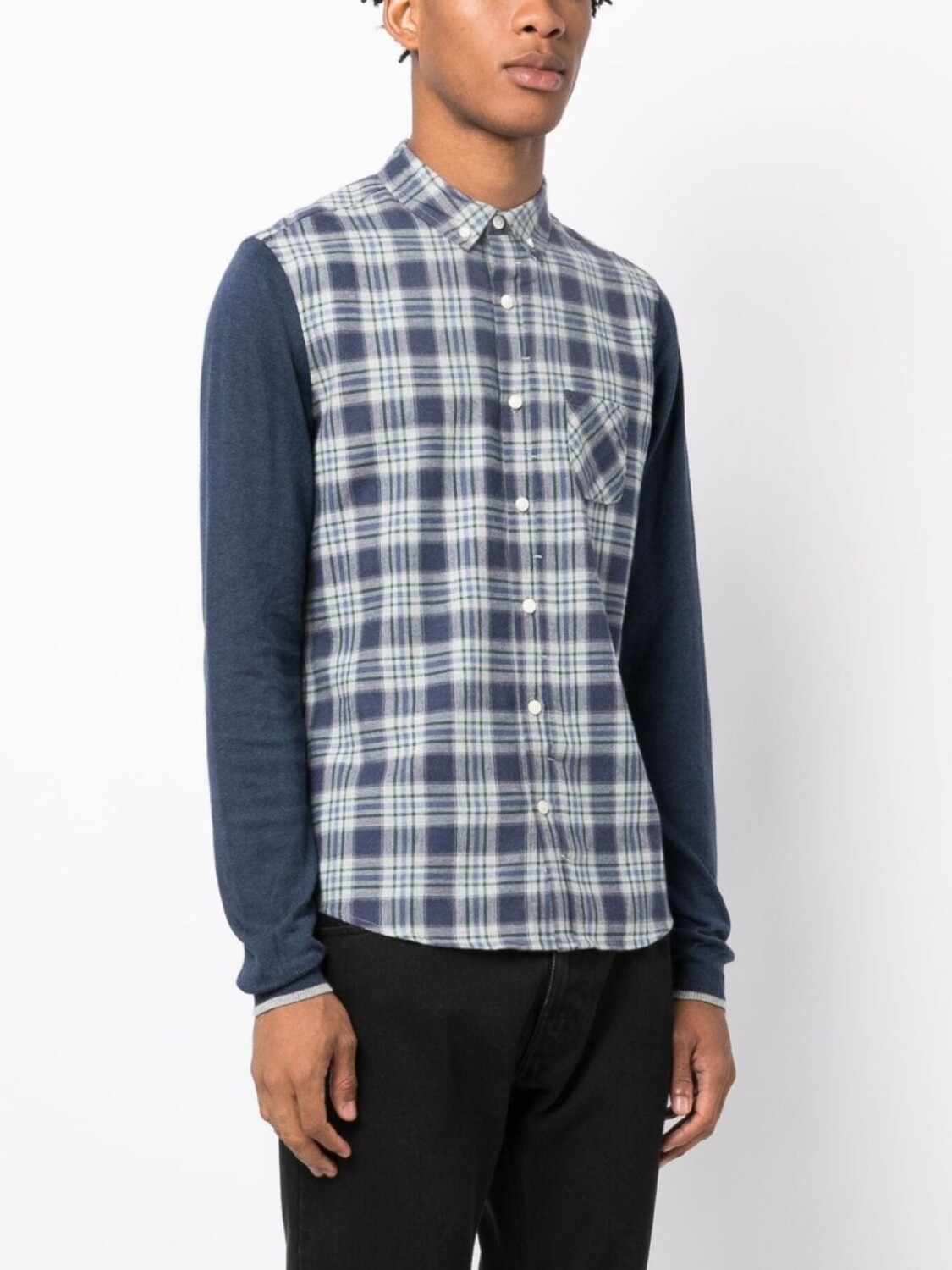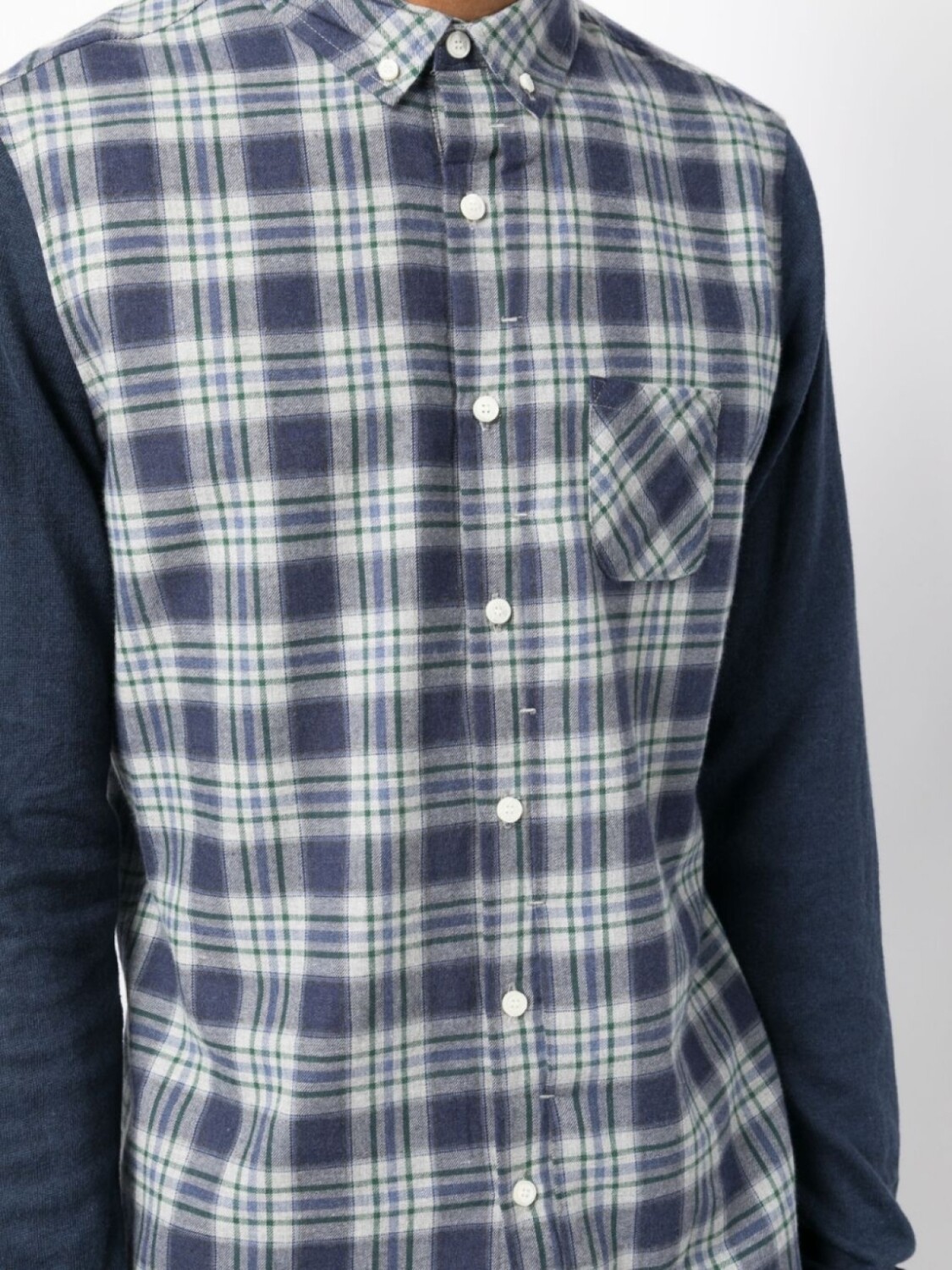 Темно-синий, хлопок, принт в клетку, воротник на пуговицах, застежка на пуговицах спереди, нагрудный накладной карман, длинные рукава и закругленный подол.