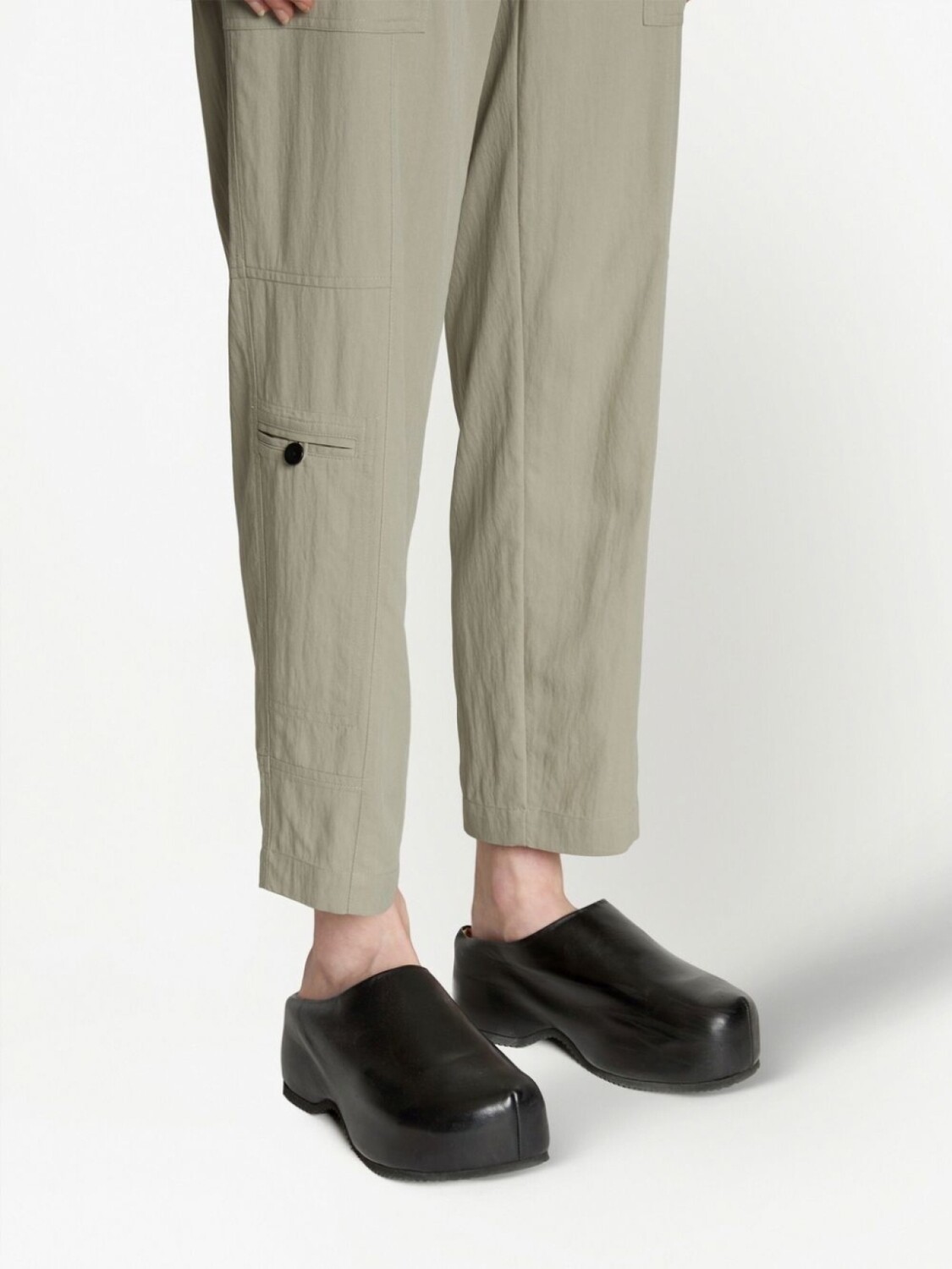 Холодный серый, петли для ремня, эластичный пояс, зауженный крой, потайная застежка на молнии и пуговицах, два накладных кармана по бокам, два кармана на пуговице по бокам и два накладных кармана сзади.