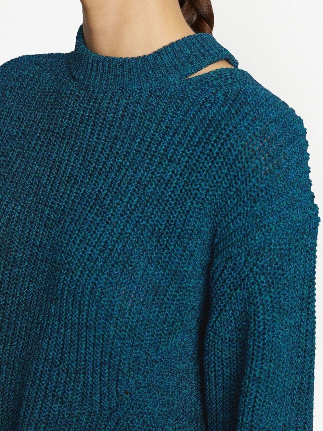 Сине-зеленый, смесовый переработанный полиэстер, переработанный хлопок, трикотаж в рубчик, вырезные детали, круглый вырез, приспущенные плечи, длинные рукава, вырез сзади и отделка в рубчик.