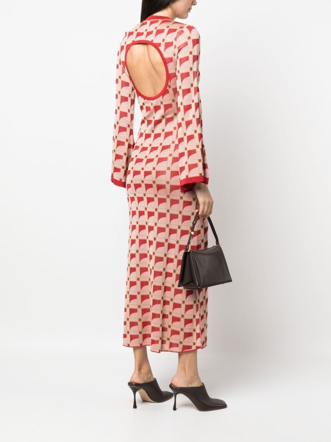 Кораллово-розовый, разноцветный, жаккардовая модель, силуэт трапеция, открытая спина, круглый вырез, длинные рукава и длинная модель.