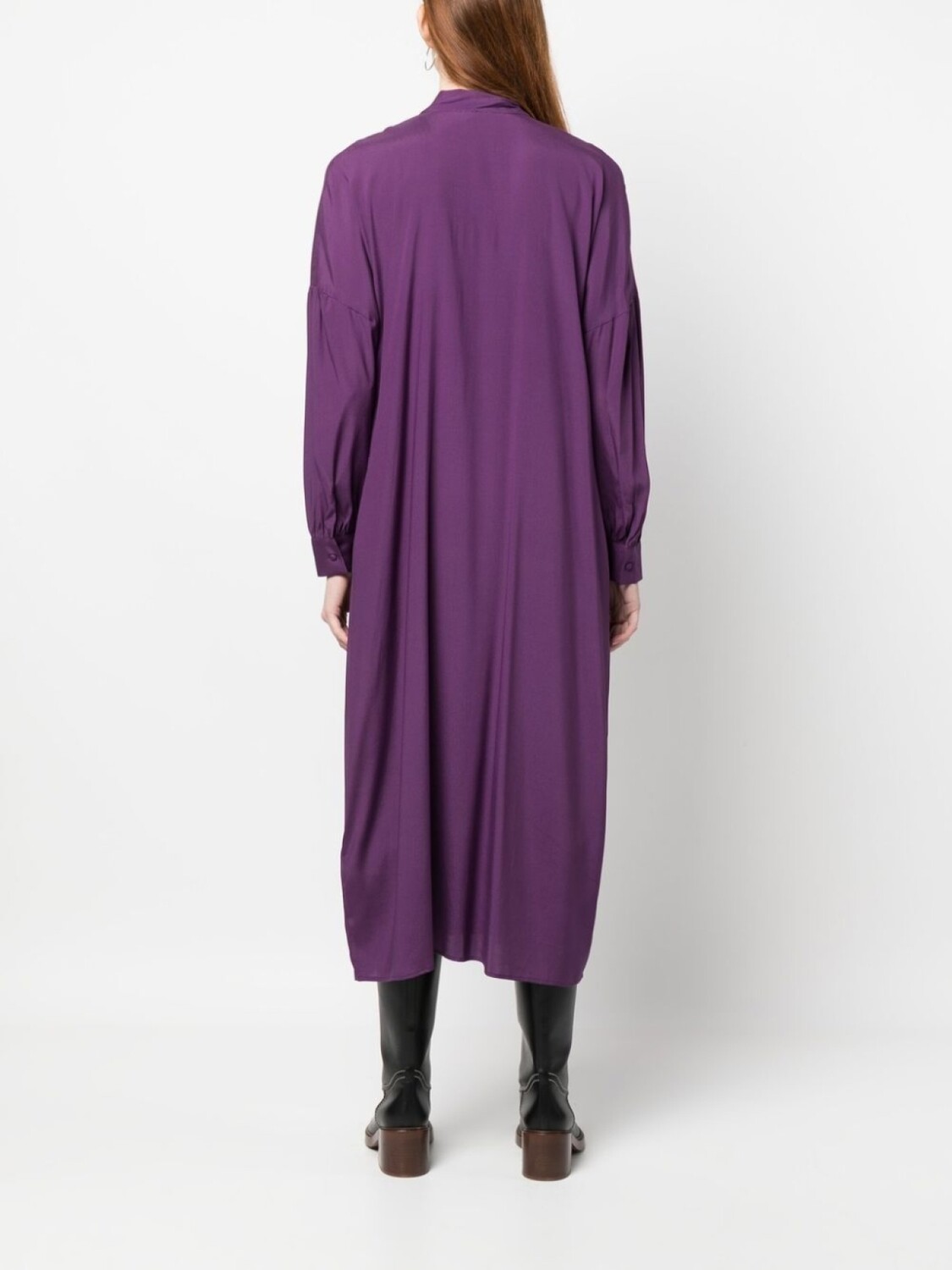 Декоративный шарф, круглый вырез, длинные рукава, манжеты на пуговицах, расклешенный крой, длина миди и прямой подол.