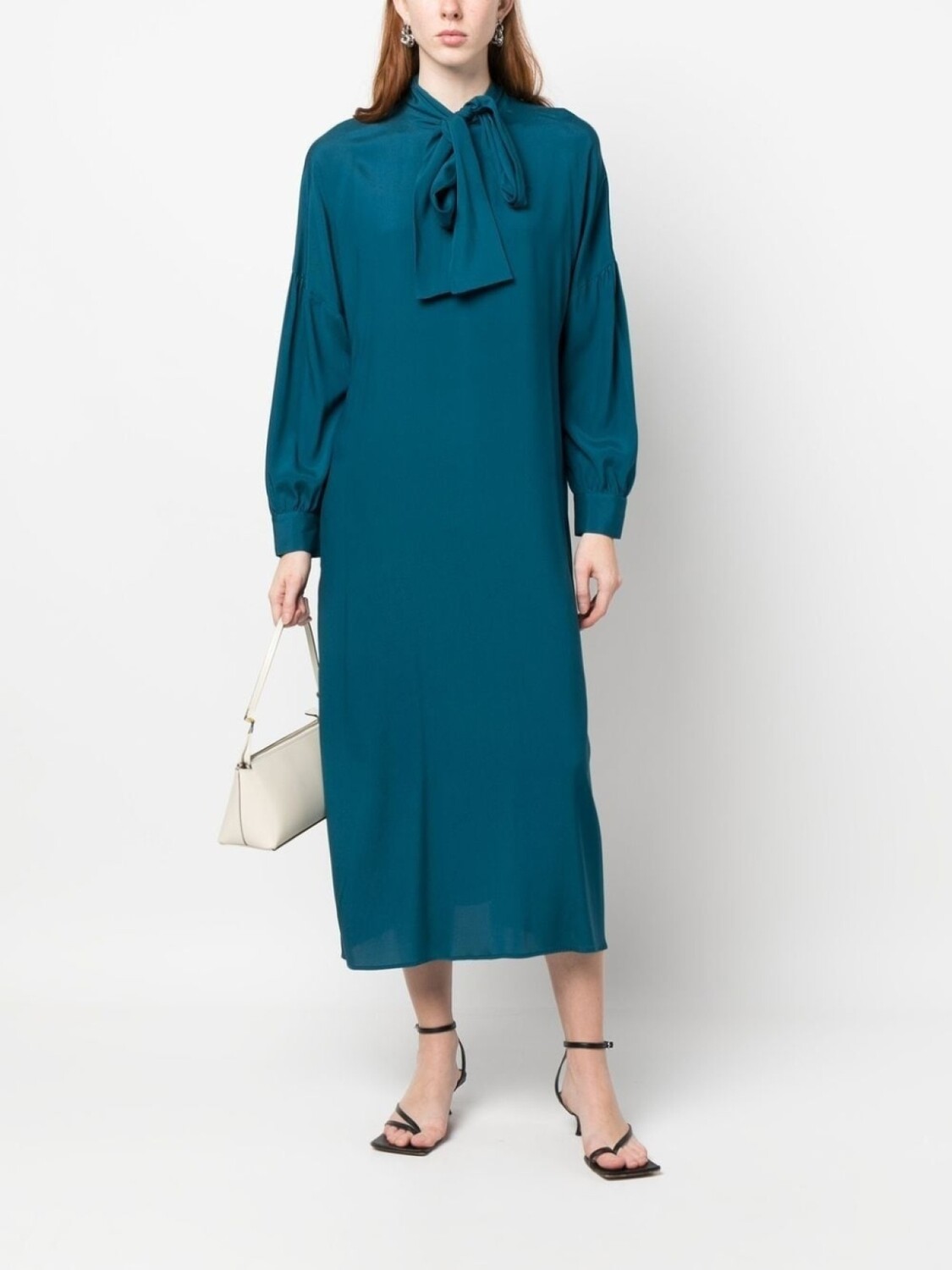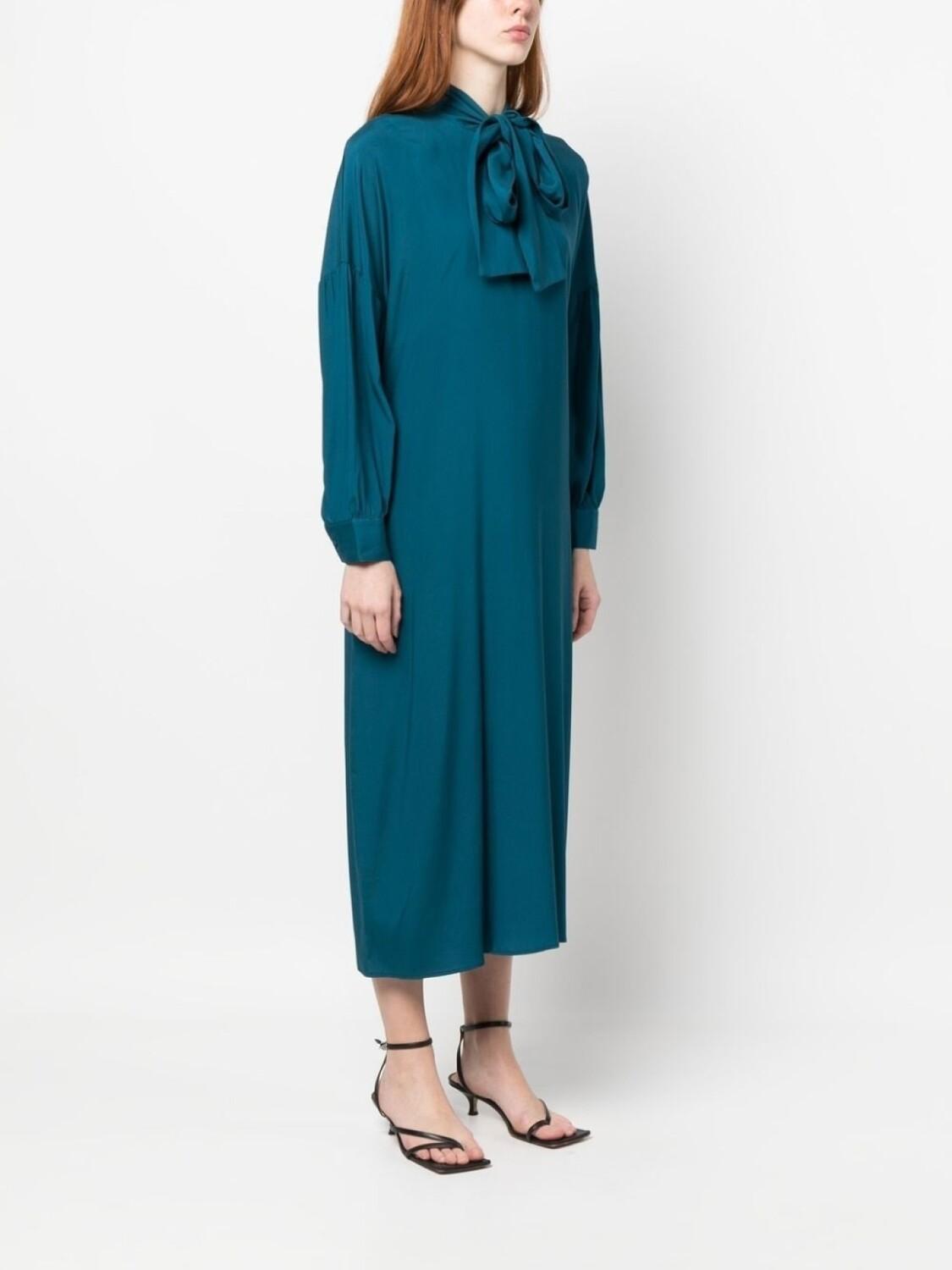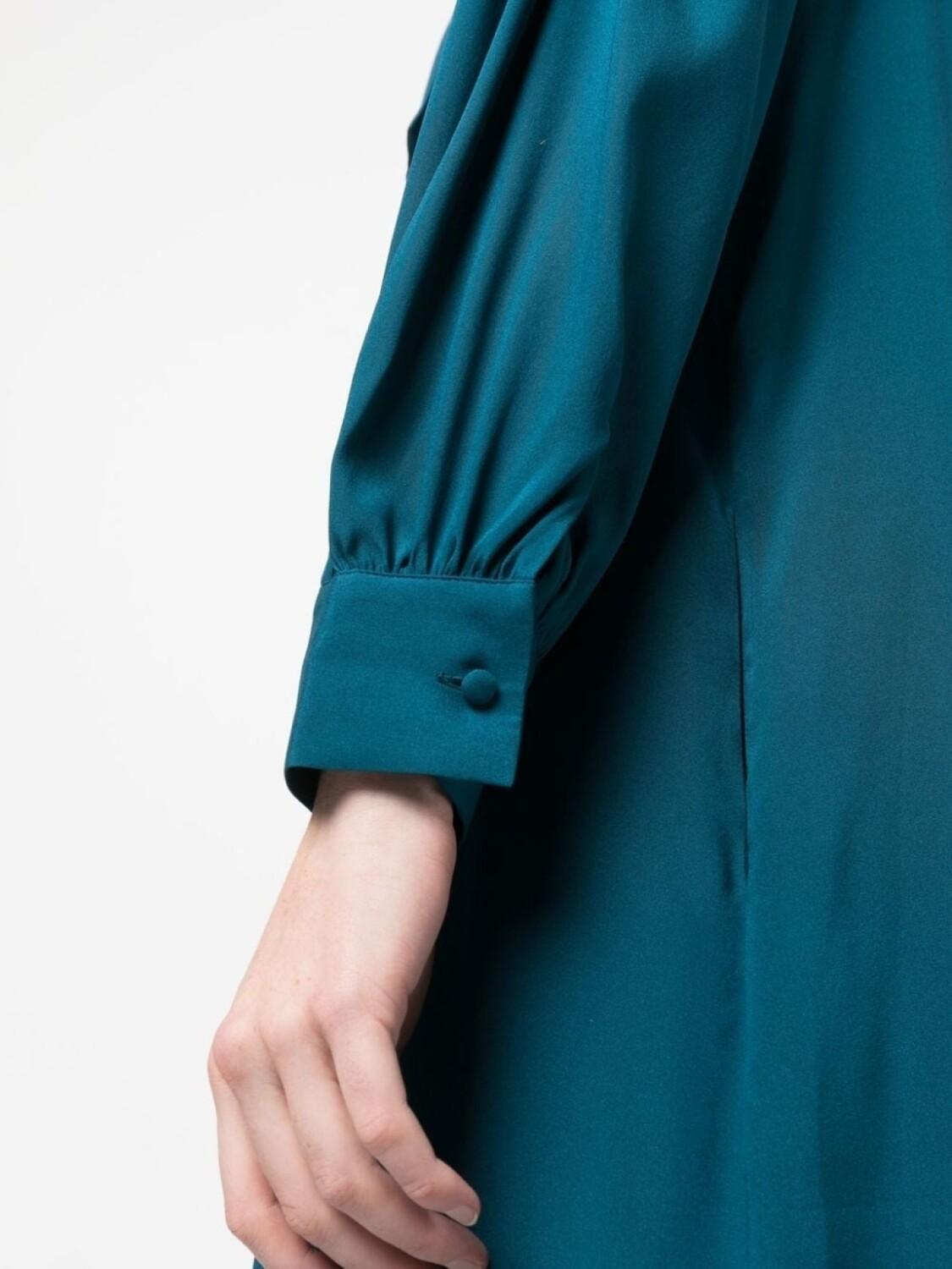 Декоративный шарф, круглый вырез, длинные рукава, манжеты на пуговицах, расклешенный крой, длина миди и прямой подол.
