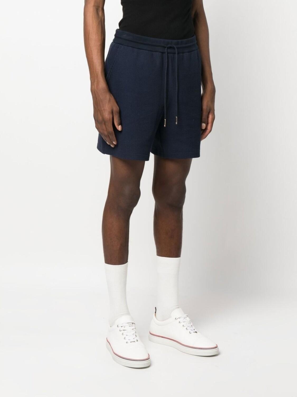 Темно-синий, фактурная отделка, нашивка с логотипом сбоку, кулиска на талии, два прорезных кармана по бокам и задние карманы с листочкой.