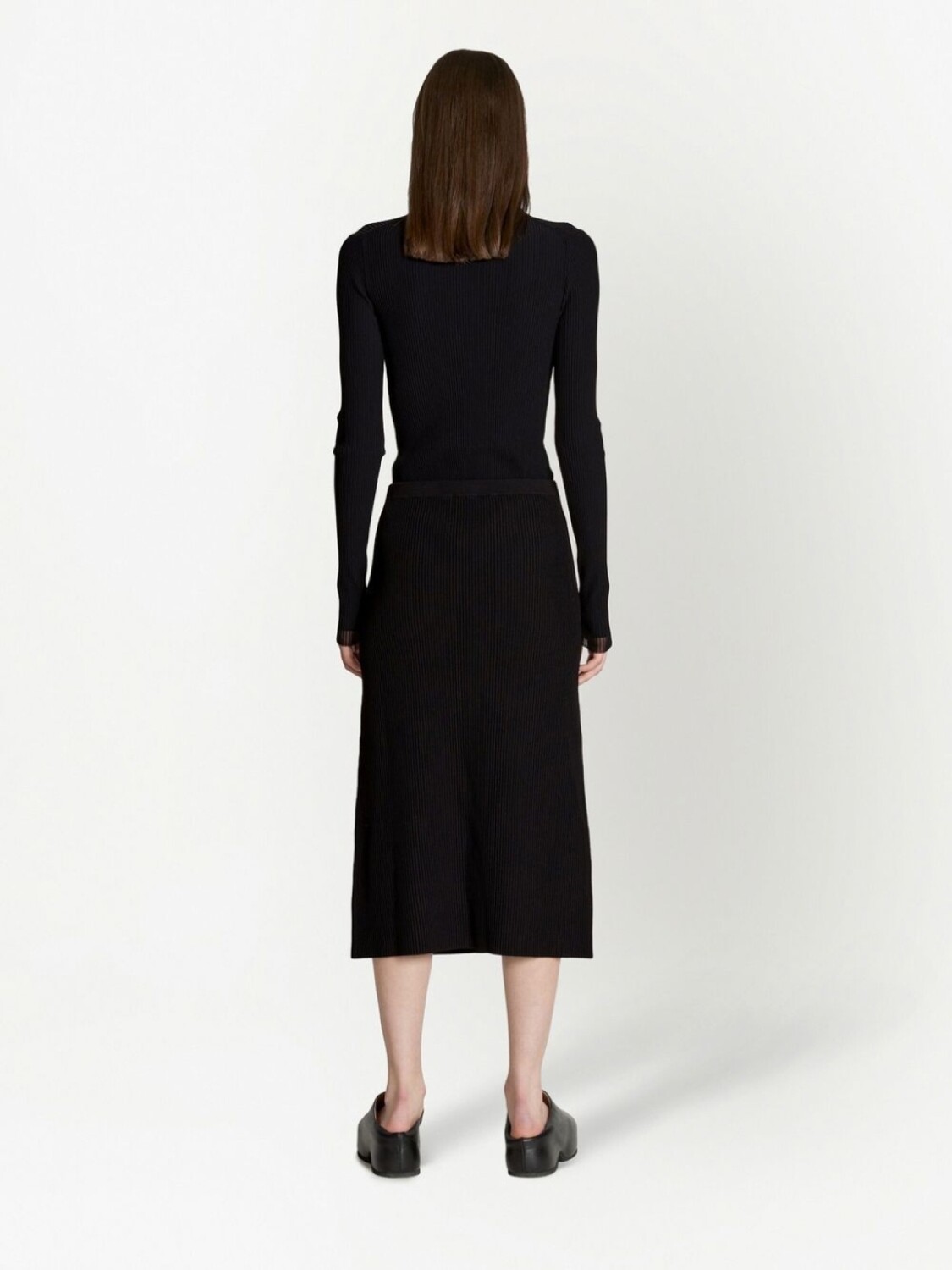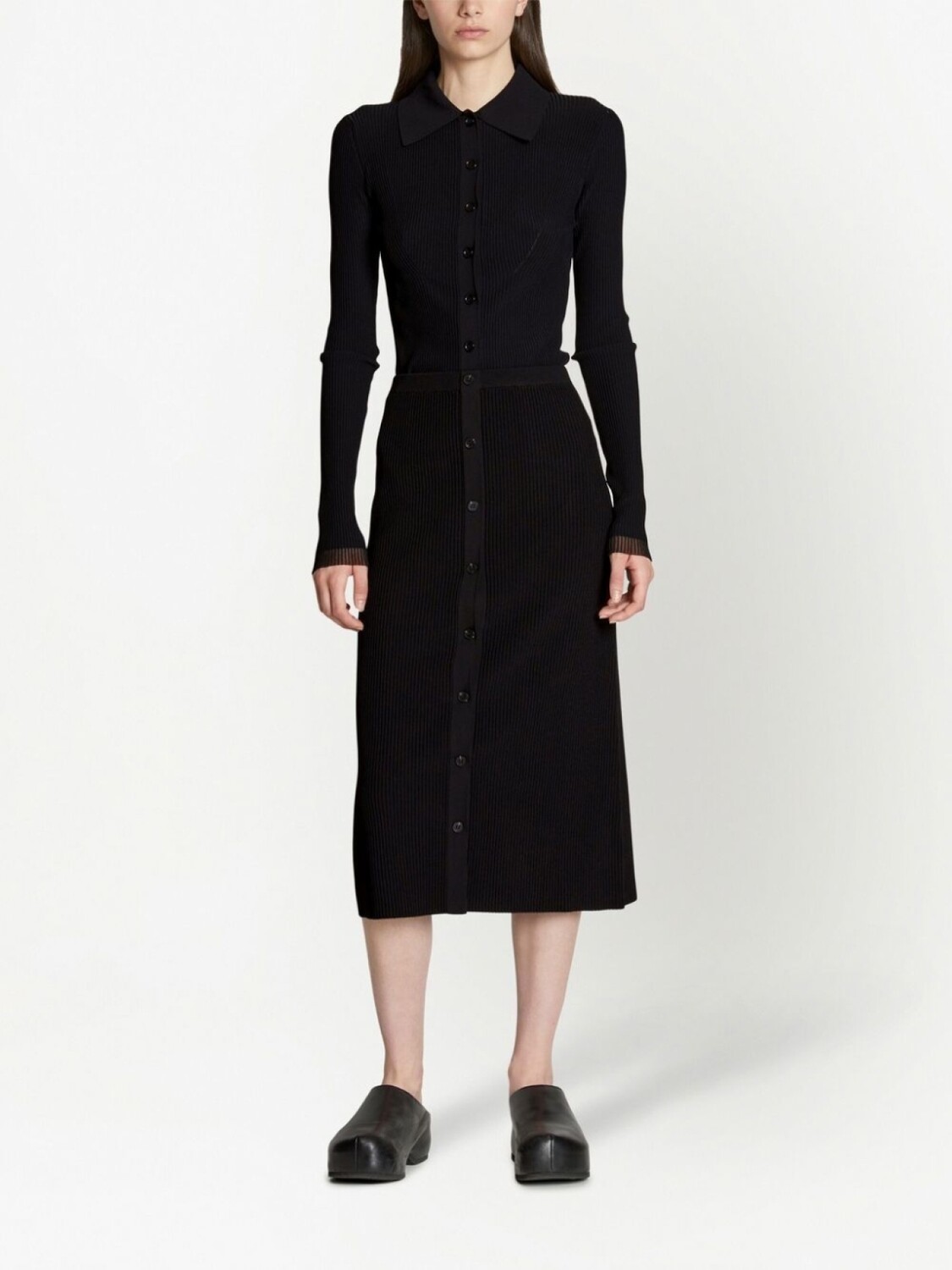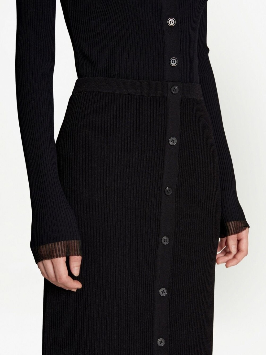 Черный, трикотаж в рубчик, завышенная талия, застежка на пуговицах спереди, прямой подол и длина миди.