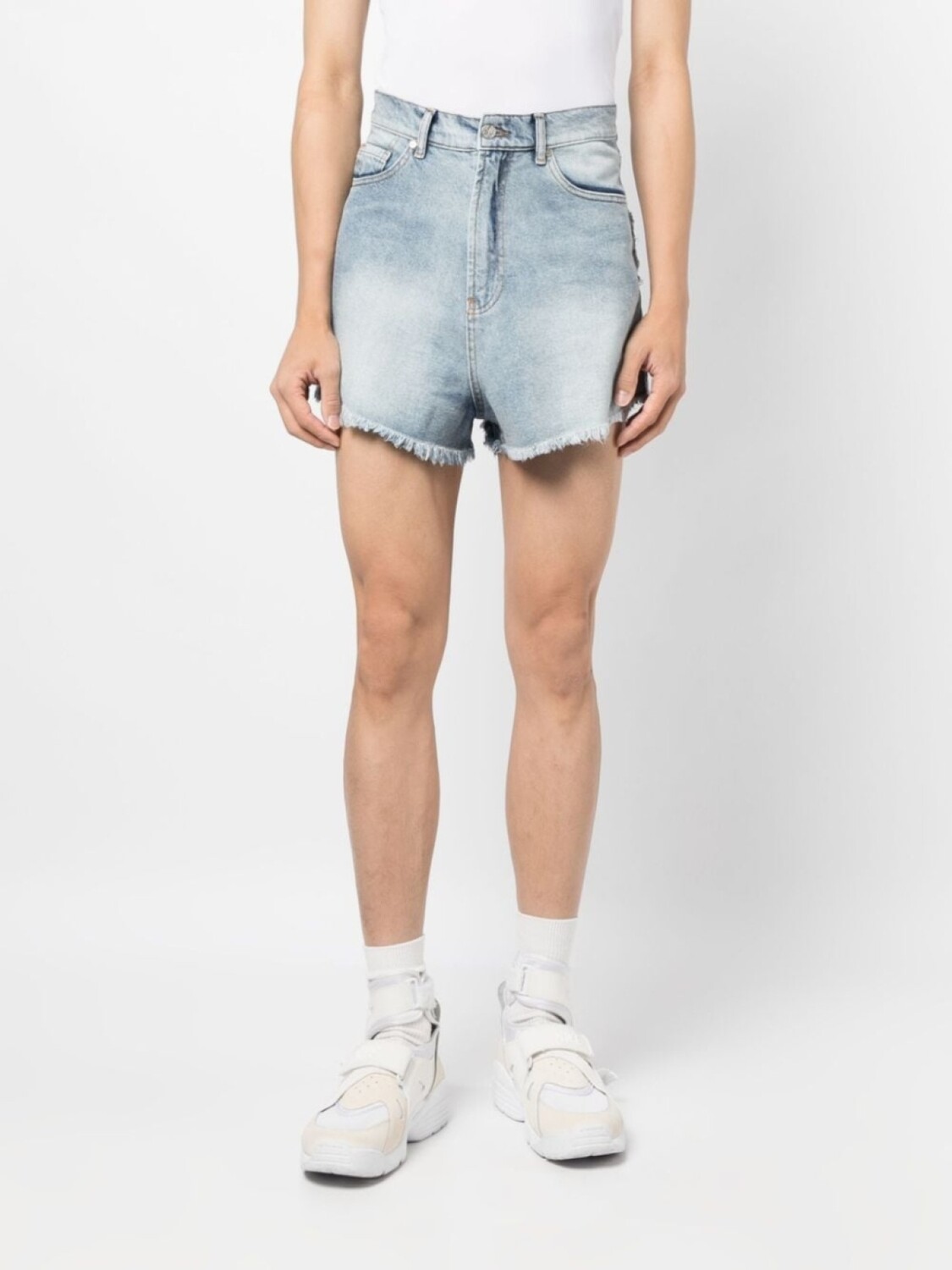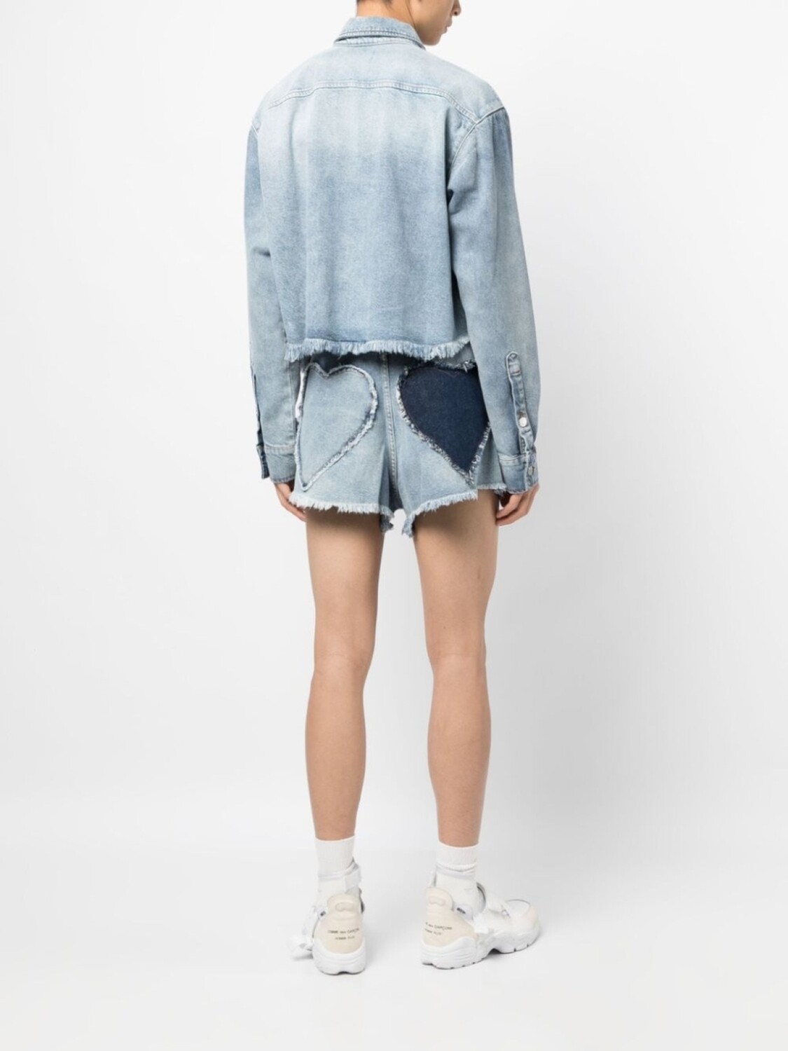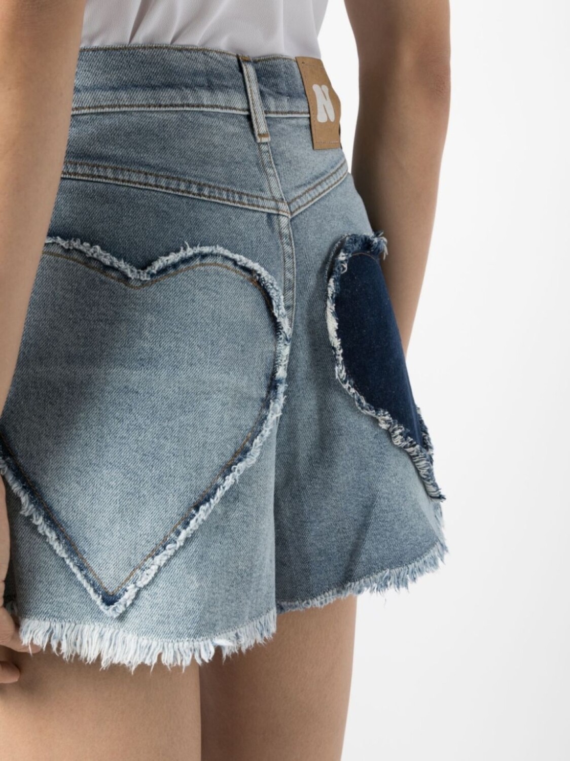 Голубой, хлопок, деним, обработанный деним, эффект потертости, нашивка в форме сердца, нашивка с логотипом сзади, петли для ремня, потайная застежка на молнии и пуговицах, два кармана по бокам, отделение для монет и необработанный подол. Это унисекс-модель. Обратите внимание, что для нее используется мужская размерная сетка.