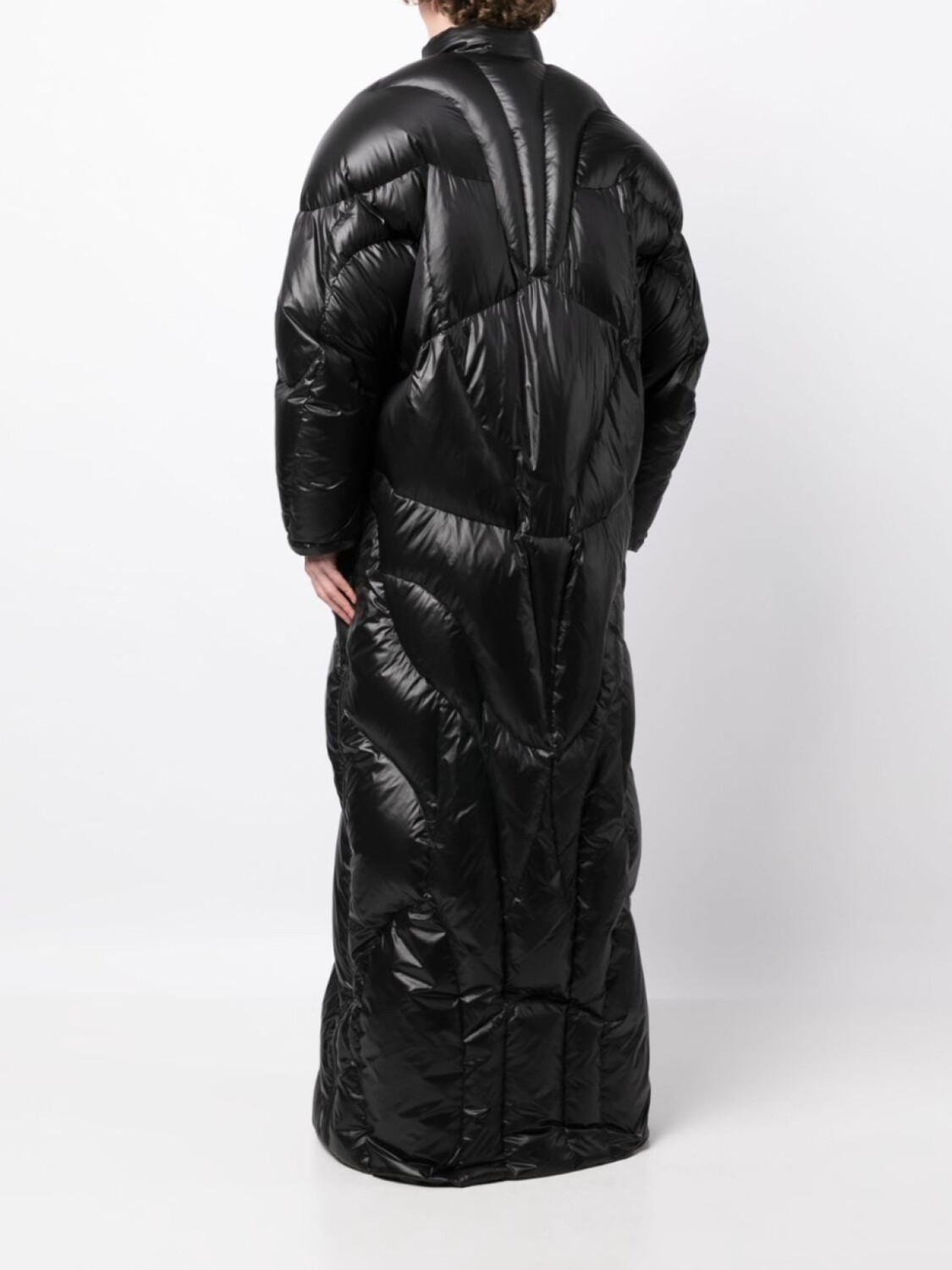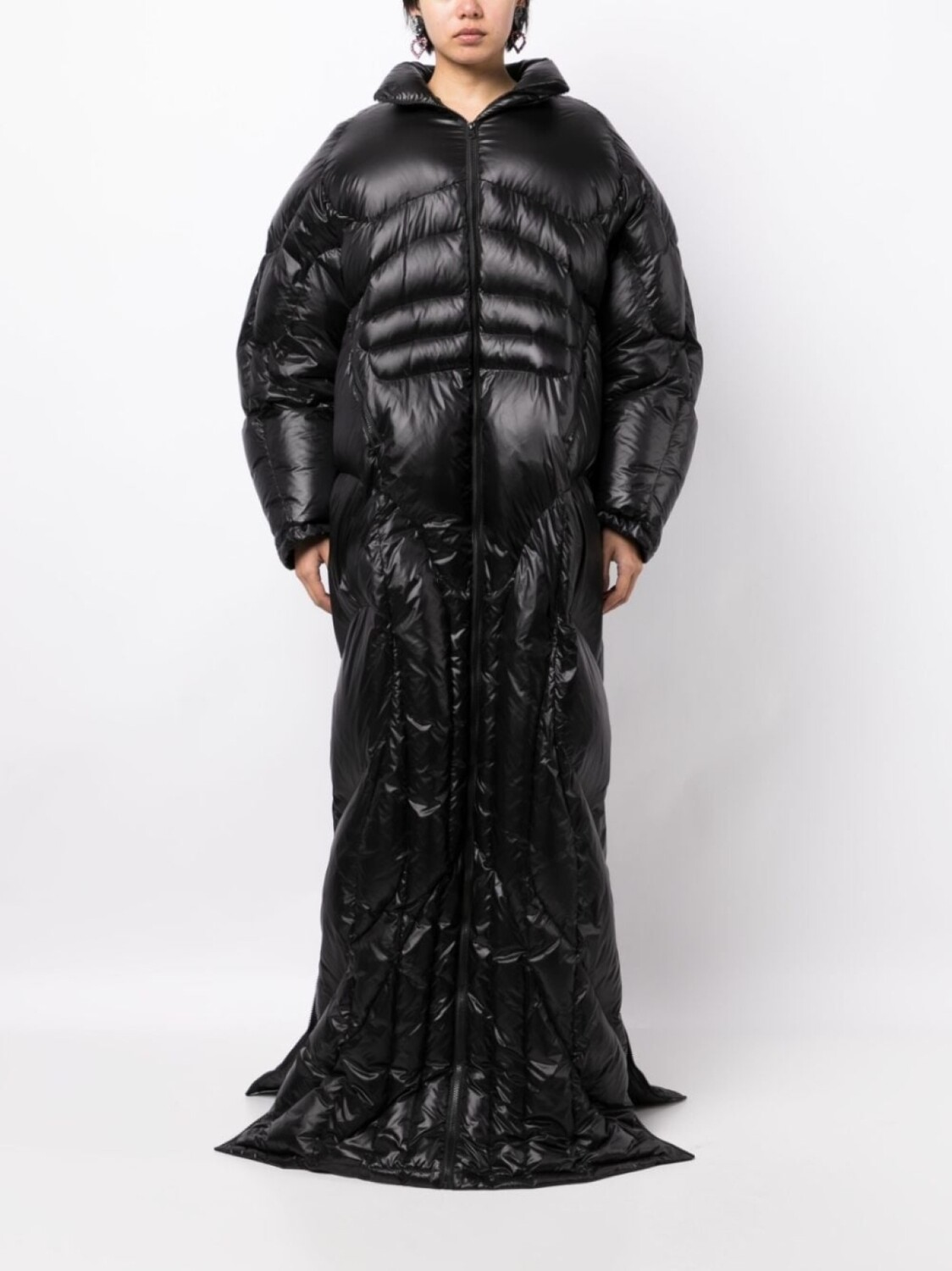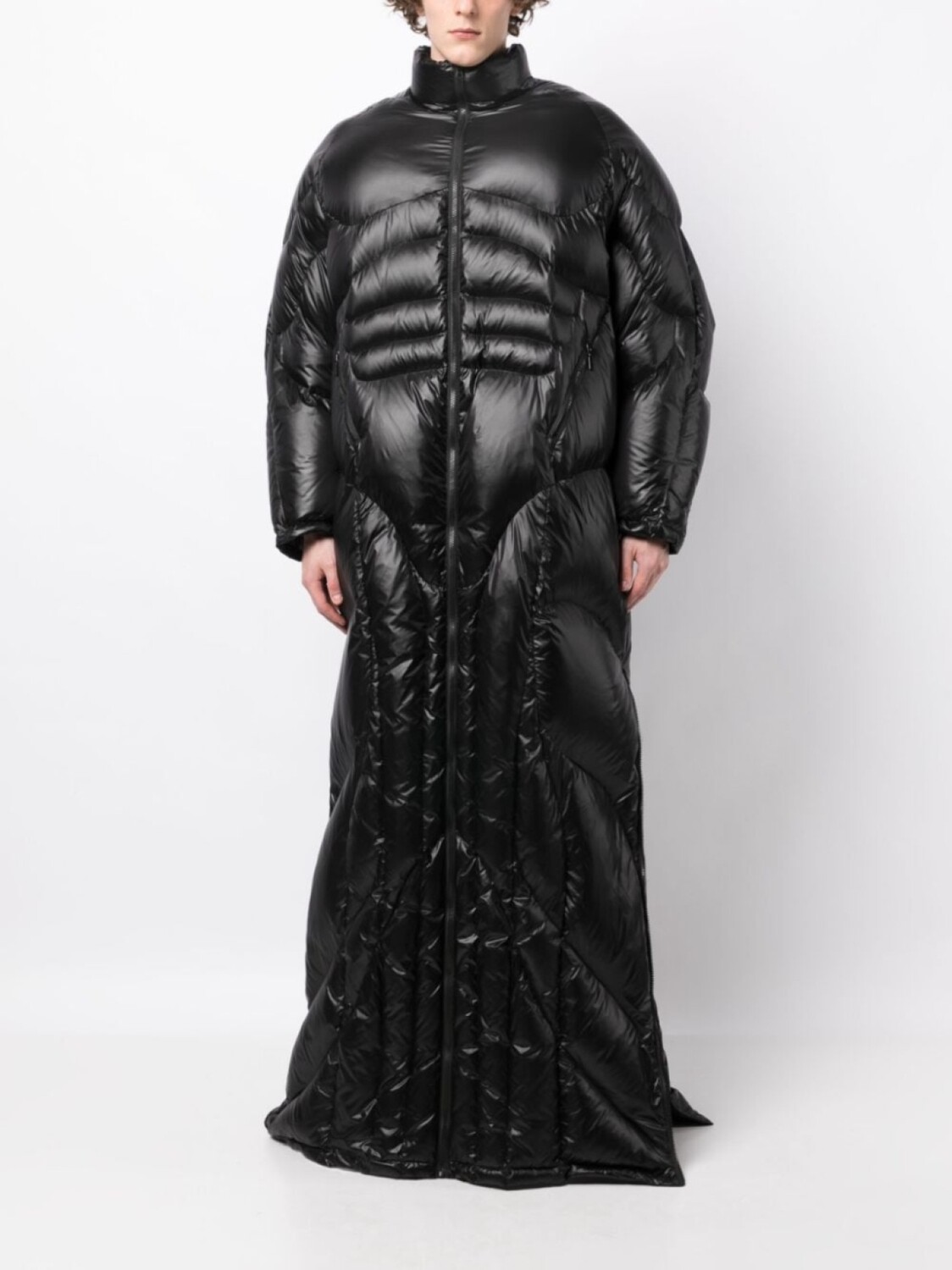 Черный, наполнитель из пуха и перьев, стеганая модель, дутый материал, детали с молниями, воротник-стойка, застежка на молнии спереди, длинные рукава, несколько карманов на молнии и длина макси. Это унисекс-модель. Обратите внимание, что для нее используется мужская размерная сетка.
