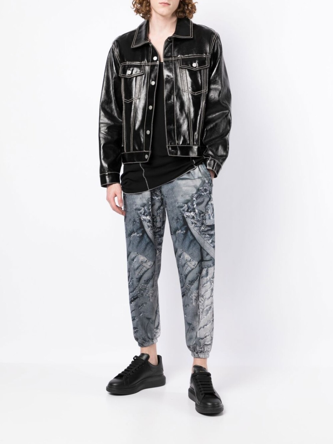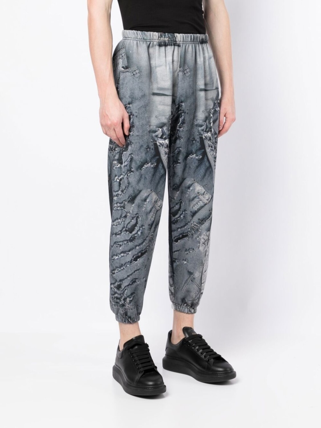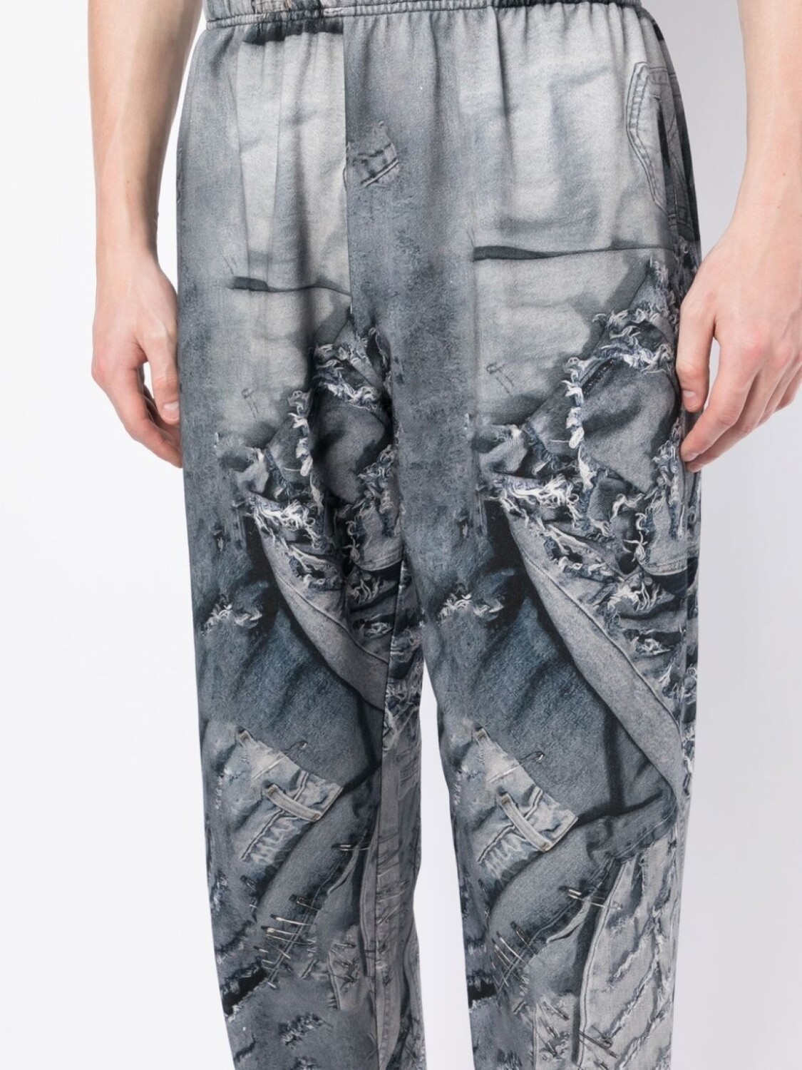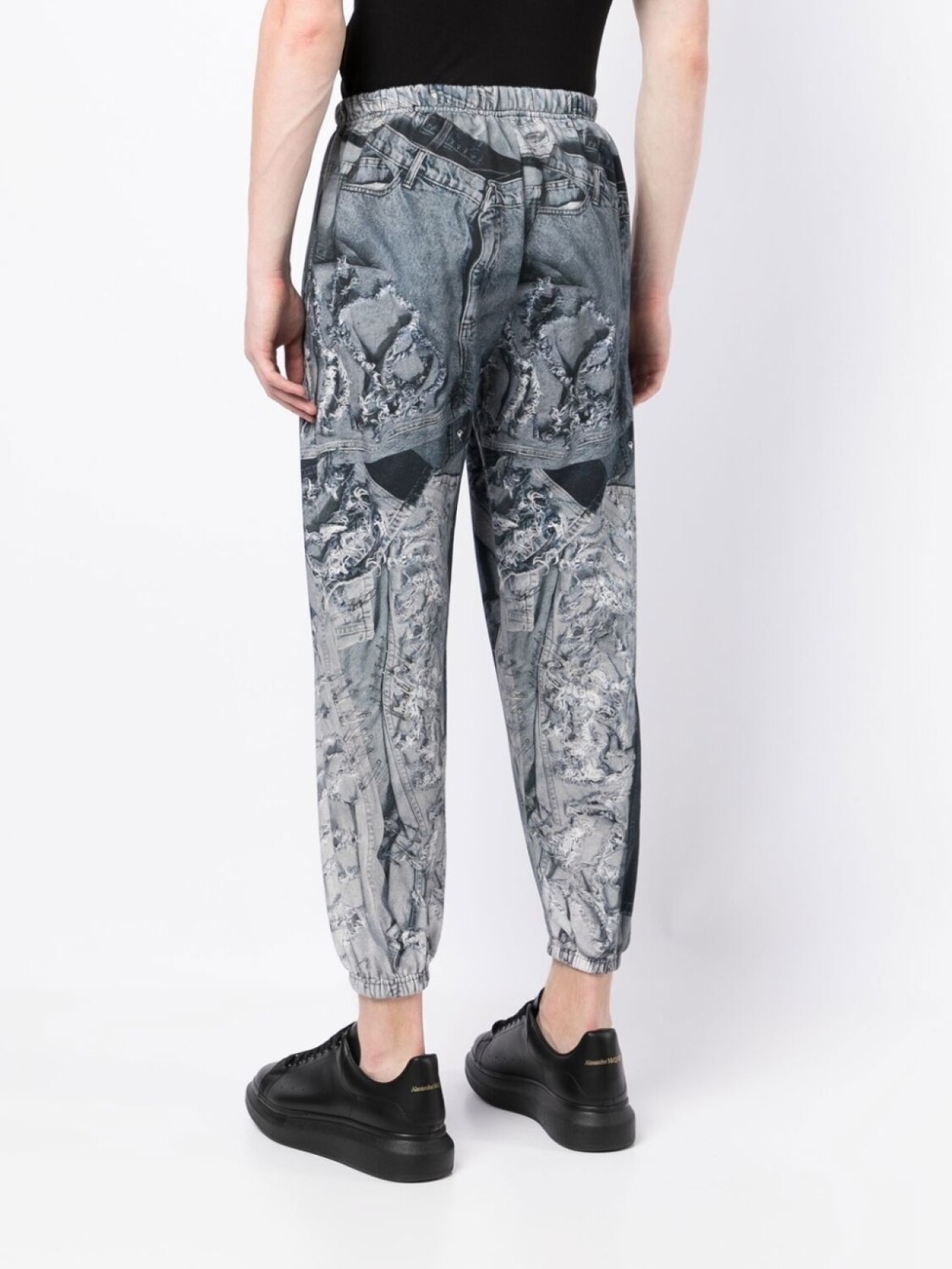 Голубой, хлопок, сплошной графичный принт, зауженный крой, укороченная длина, завышенная талия, эластичный пояс, эластичные манжеты и прорезные карманы по бокам. Это унисекс-модель. Обратите внимание, что для нее используется мужская размерная сетка.