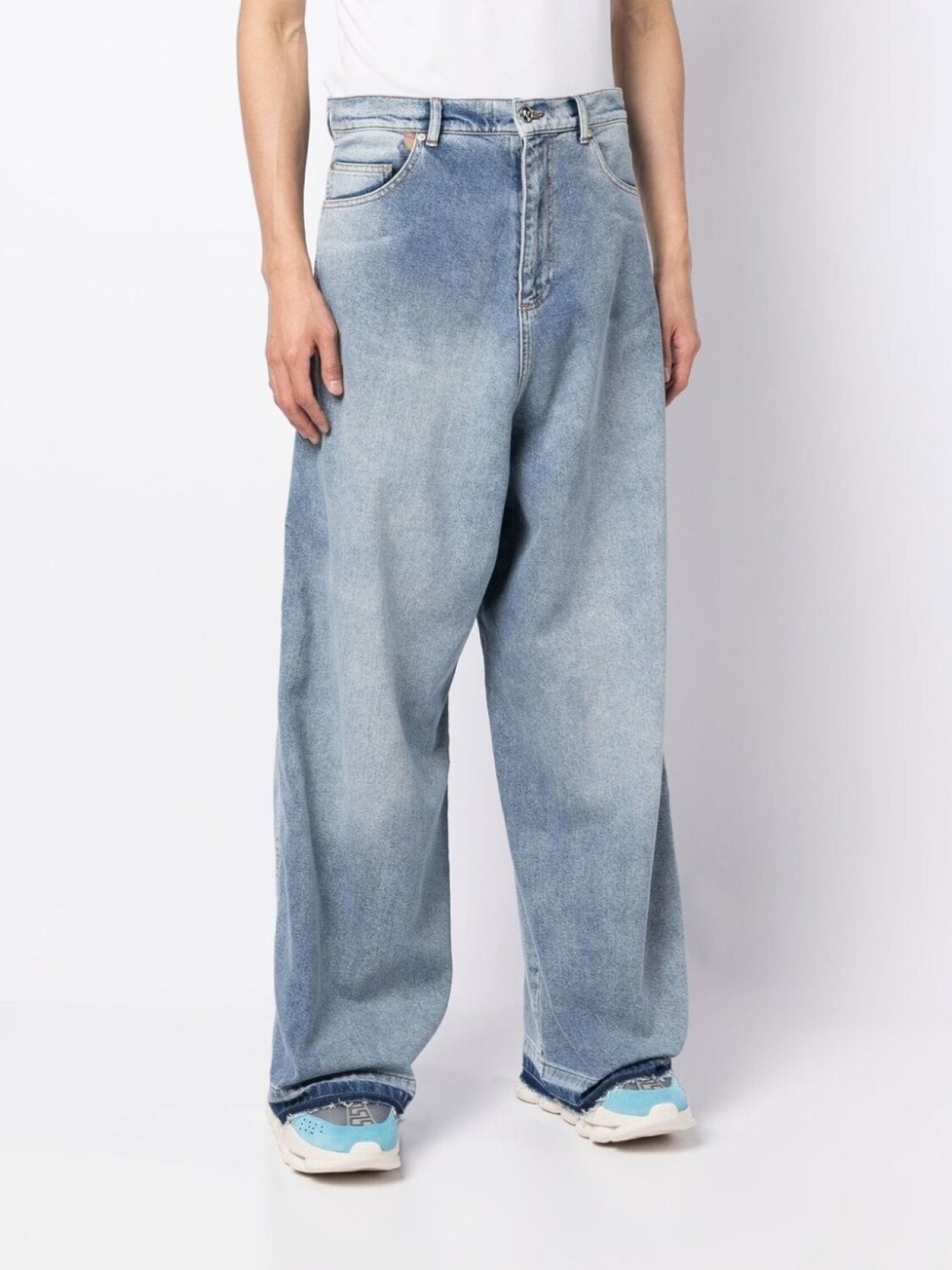 Голубой, хлопок, эффект потертости, нашивка с логотипом сзади, петли для ремня, застежка на молнии и пуговице спереди, застежка на молнии сзади, пять карманов и широкий крой.