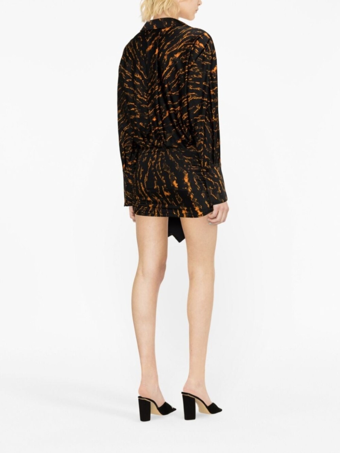 Черный, сатиновая фактура, абстрактный принт, классический воротник, застежка на пуговицах спереди, длинные рукава, асимметричный подол и длина до бедер.