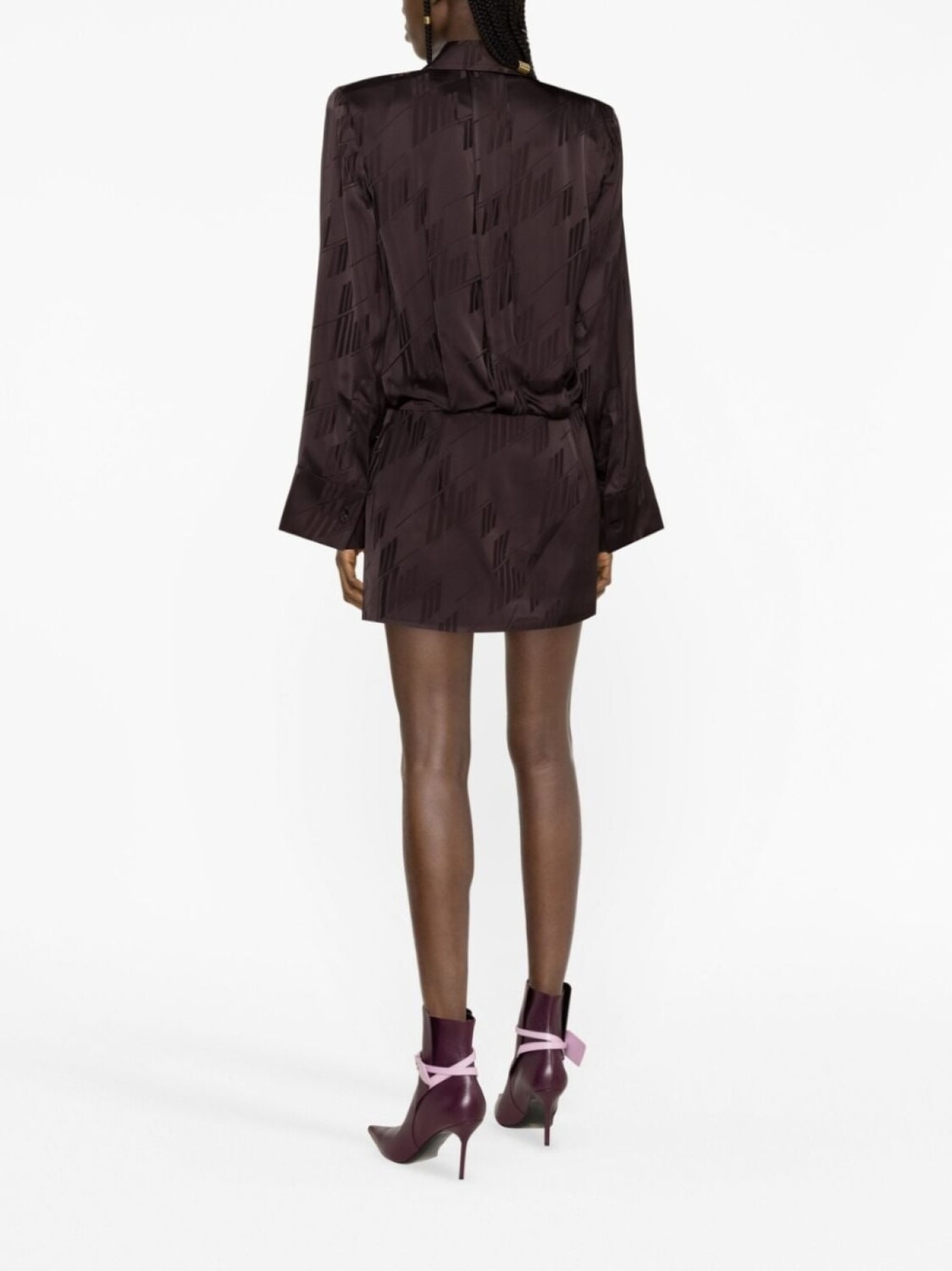 Шоколадный, сатиновая фактура, сплошной принт с логотипом, классический воротник, застежка на пуговицах спереди, кулиска на талии, длинные широкие рукава и прямой подол.