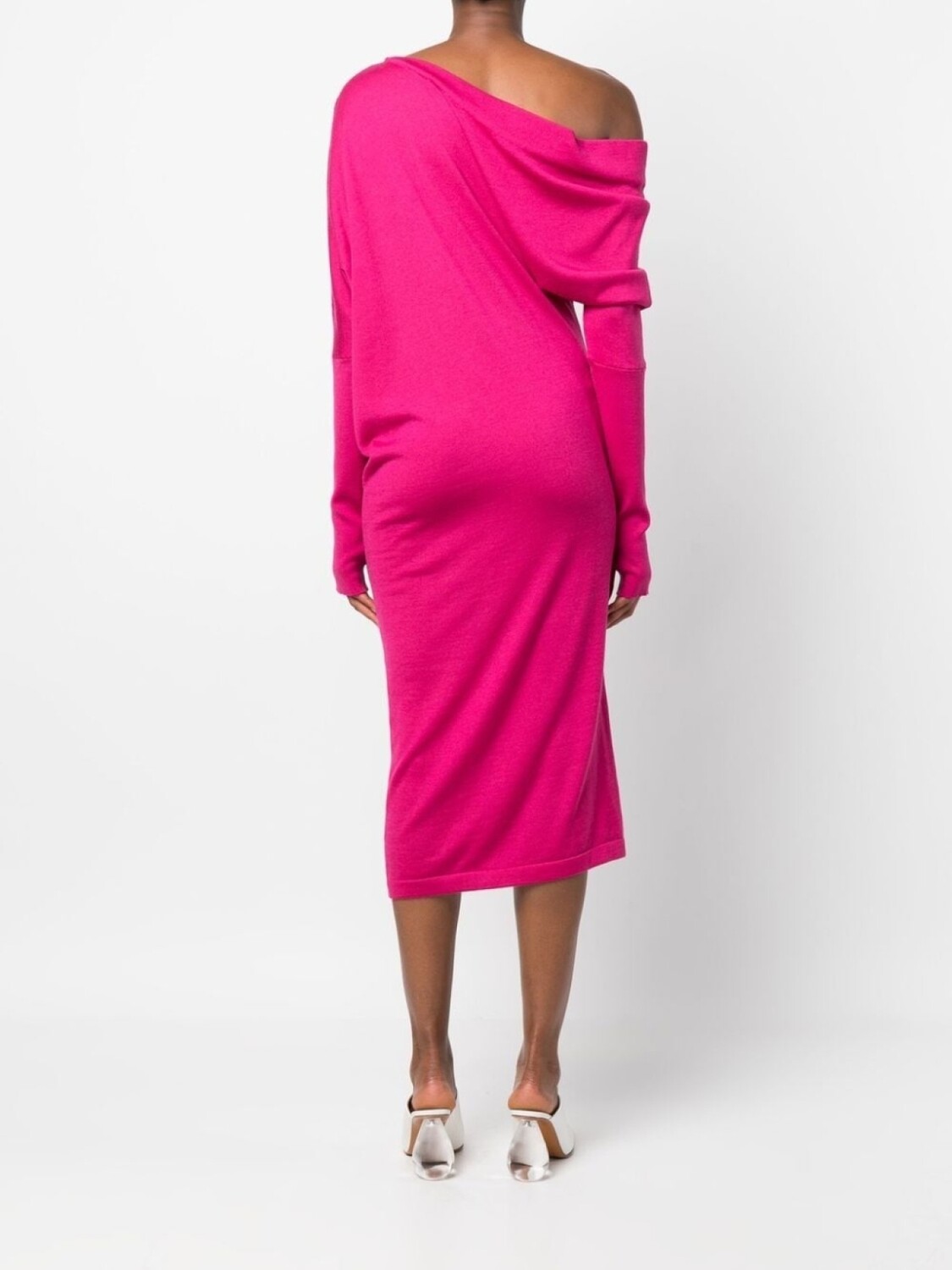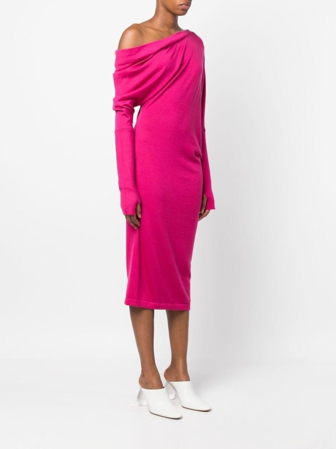 Темно-розовый, смесовый кашемир, открытые плечи, длинные рукава и длина миди.