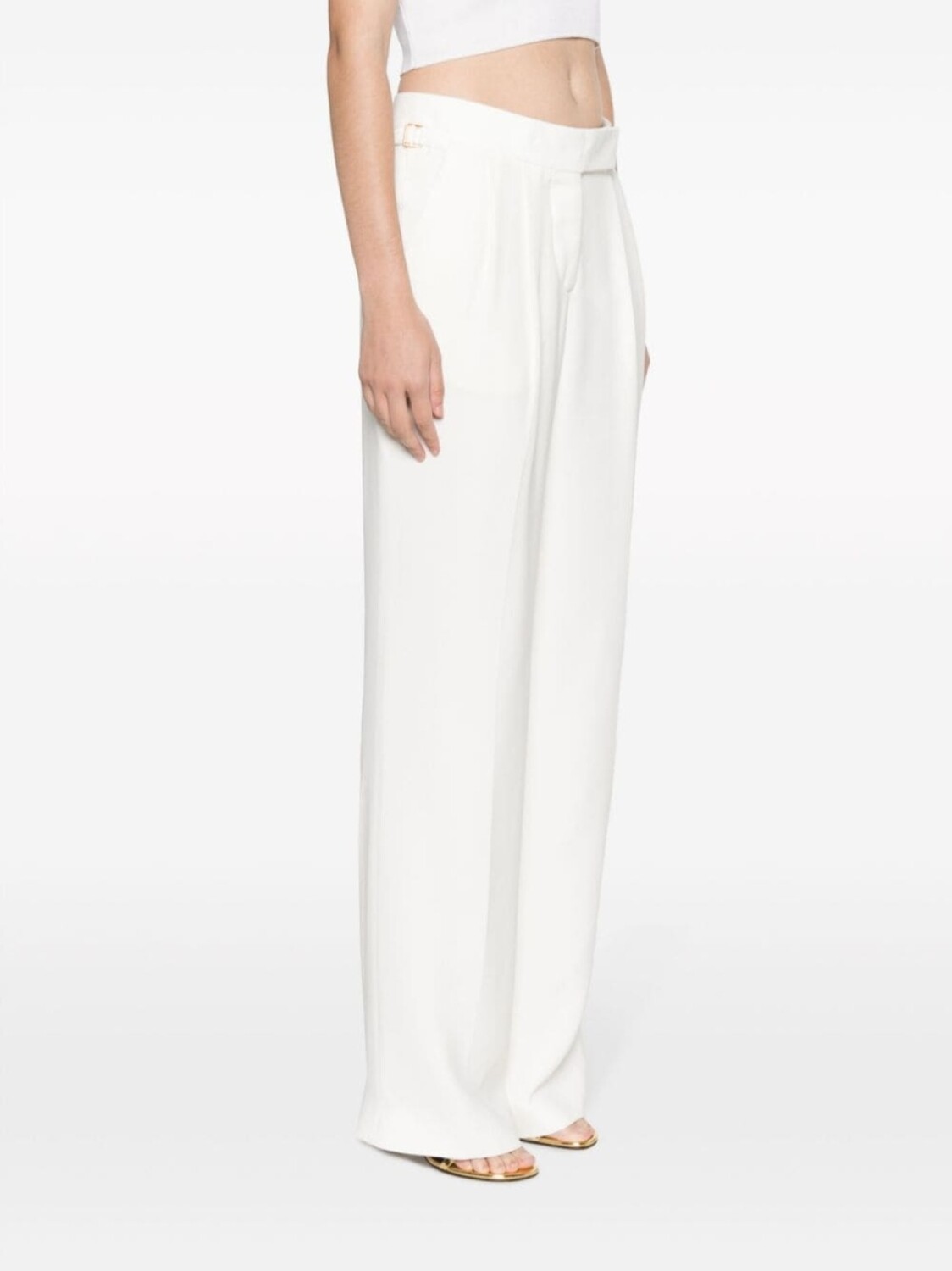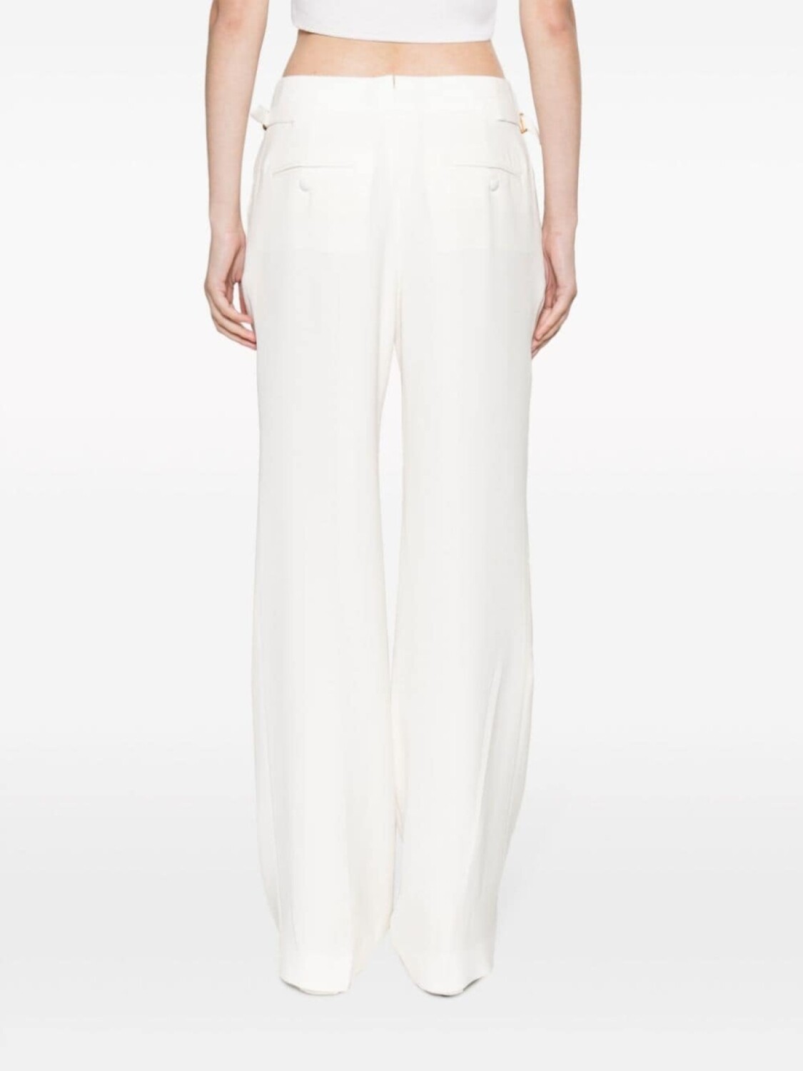 Серовато-белый, классический крой, складки, потайная застежка спереди, регулируемые боковые резинки, прямой крой, два вшитых кармана по бокам, два прорезных кармана на пуговицах сзади и длинная модель.