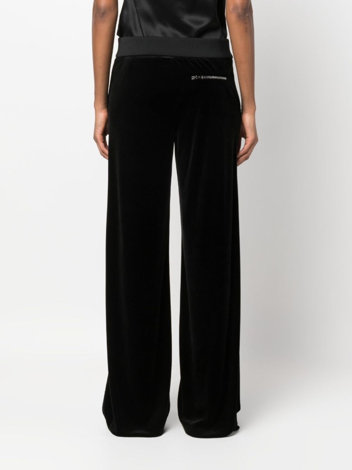 Черный, эластичный шелк, эластичный пояс, застежка на молнии спереди, завышенная талия, широкий крой и карман на молнии сзади.