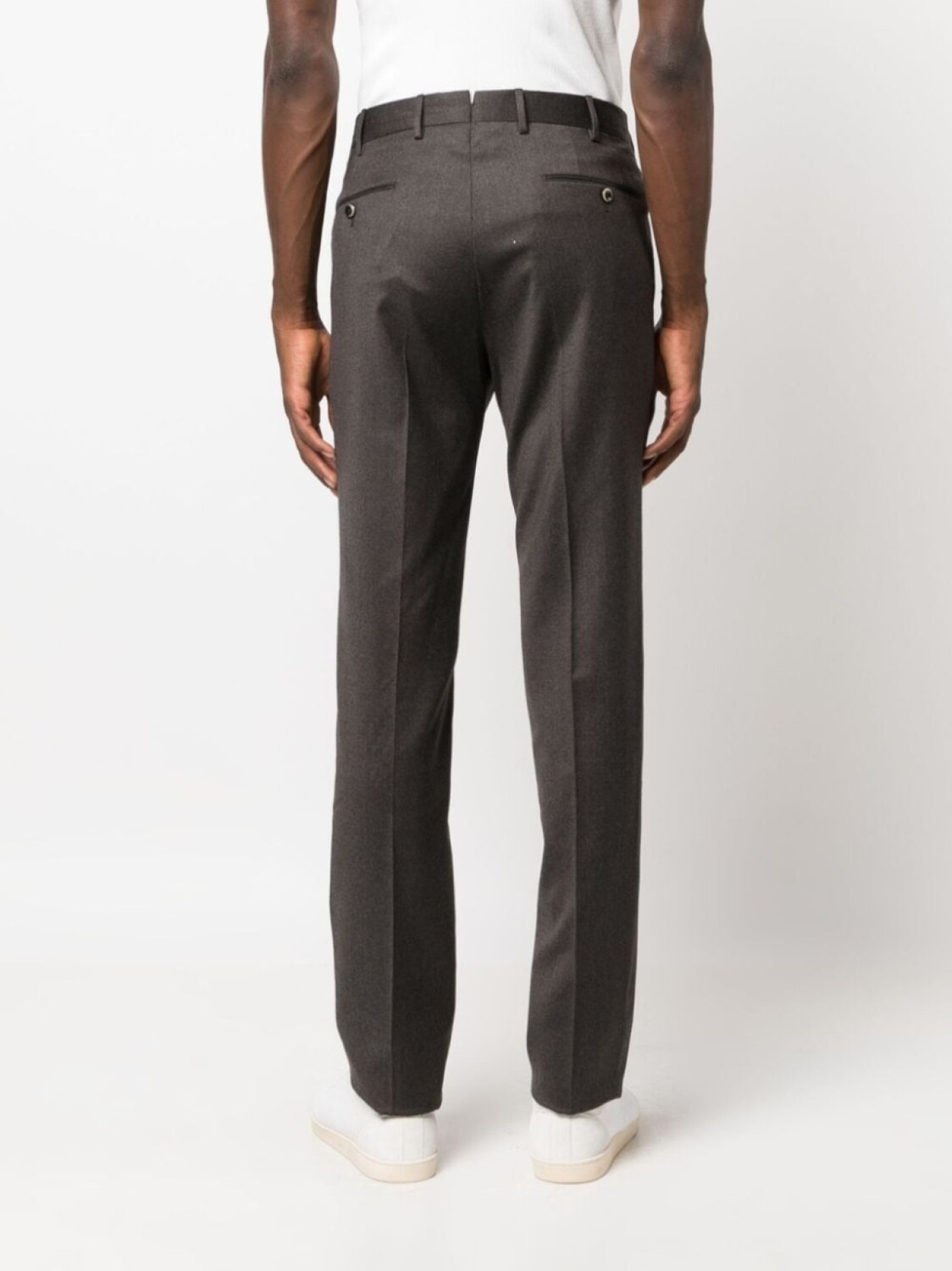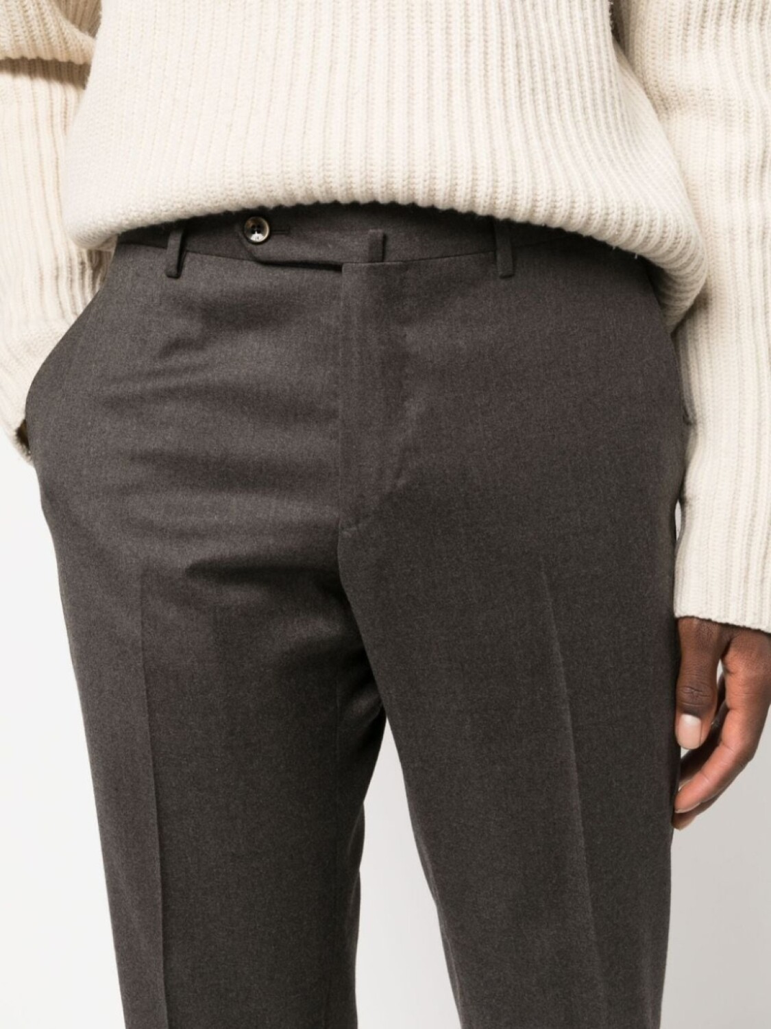 Коричневый, смесовая необработанная шерсть, строгий крой, смещенная застежка на пуговицах спереди, петли для ремня, стрелки и два кармана на пуговице сзади.